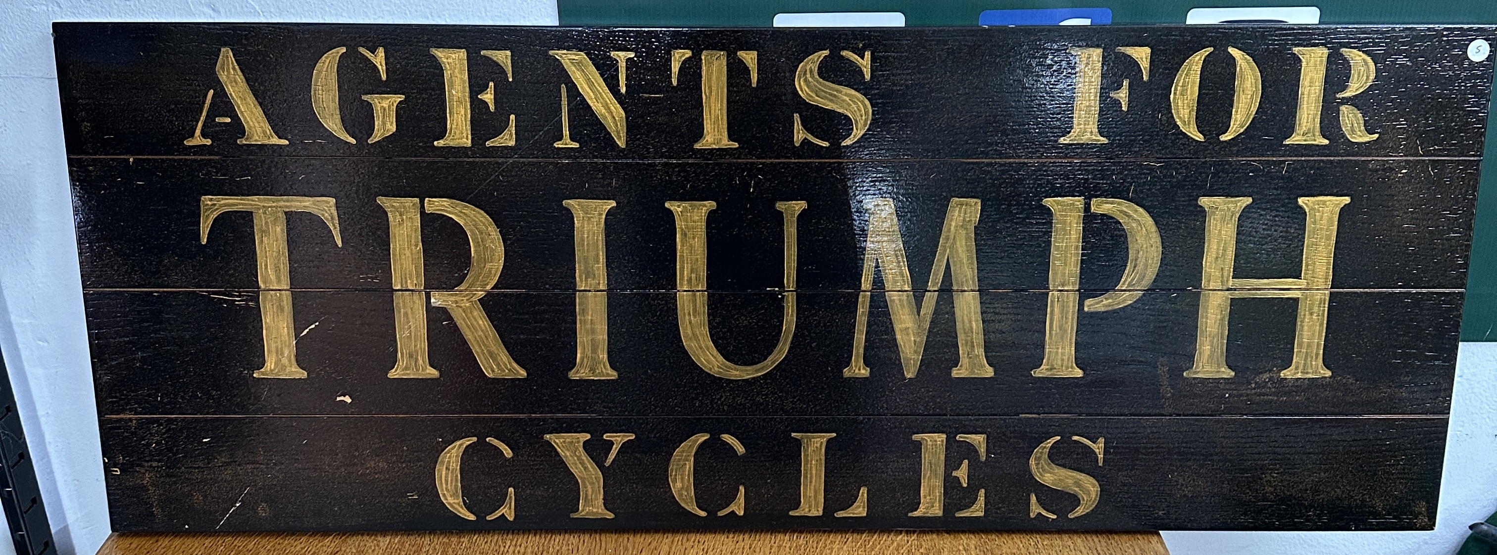 A rectangular wooden advertising sign for Triumph Cycles, constructed from three horizontal planks. The sign features a black painted ground with hand-finished gold-toned serif lettering. The text is arranged in three lines reading AGENTS FOR TRIUMPH CYCLES. The design is executed in a vintage British commercial style, characteristic of early-to-mid 20th-century bicycle shop signage. No maker’s marks or manufacturer labels are visible on the item. The construction and surface finish suggest a modern decorative piece produced in a vintage style.