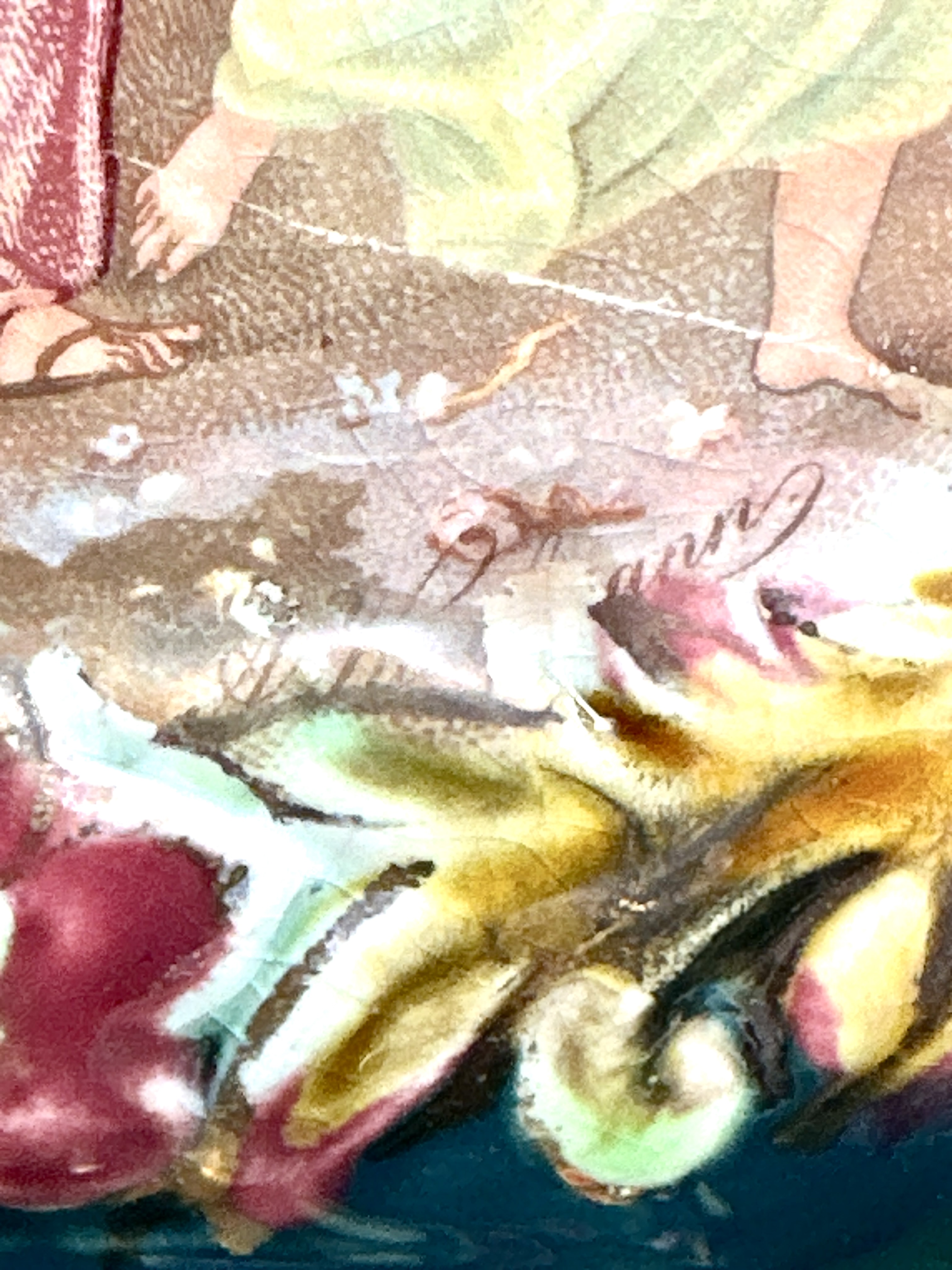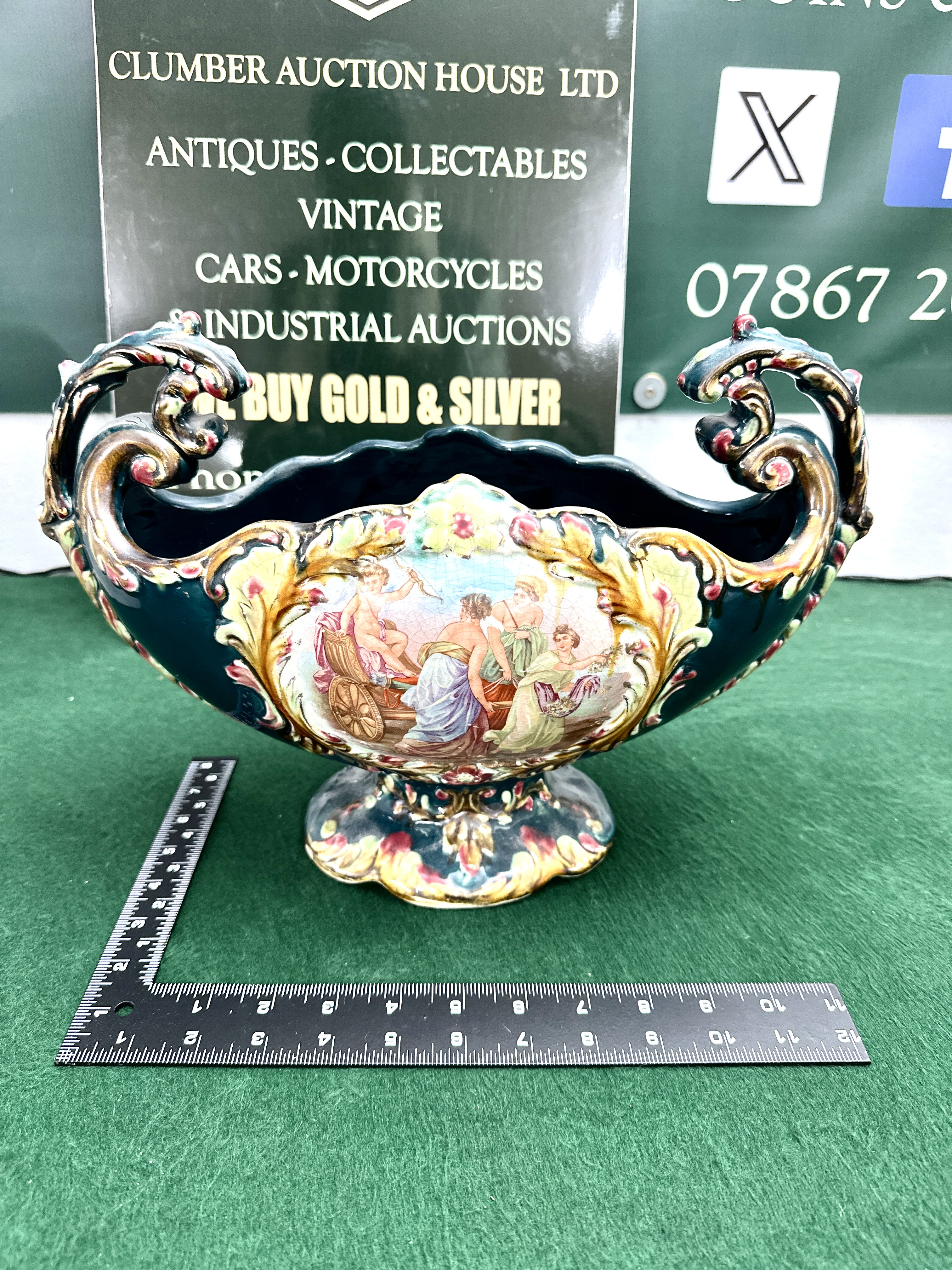 A large ceramic twin-handled footed bowl or jardiniere of boat-shaped form, constructed from a heavy light-bodied ceramic. The piece is finished in a deep peacock blue glaze and decorated in a neo-Rococo style. The central body features a large cartouche depicting a classical mythological scene with figures in draped robes and a chariot, signed Kaufmann in script to the lower right of the panel. This signature refers to the style of Angelica Kaufmann, a common subject for decorative European ceramics of this period. The scene is framed by raised scrolling motifs in pale yellow, pink, and green enamels, with extensive gilded highlights. The bowl features pierced scrolled handles and stands on an ornate scrolled pedestal base. The underside of the base is partially glazed in teal and bears a hand-painted script mark resembling the numeral 9 or letter g.