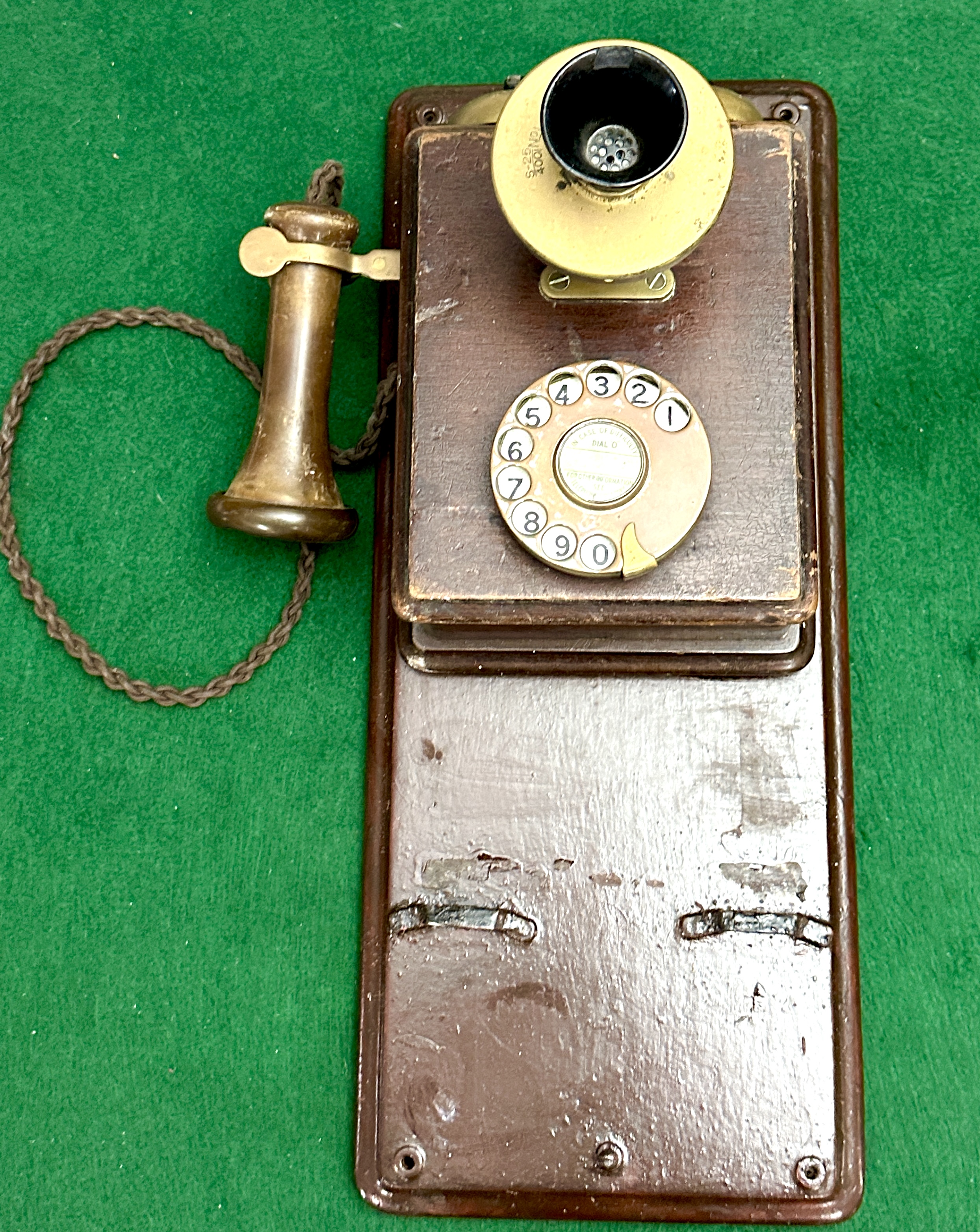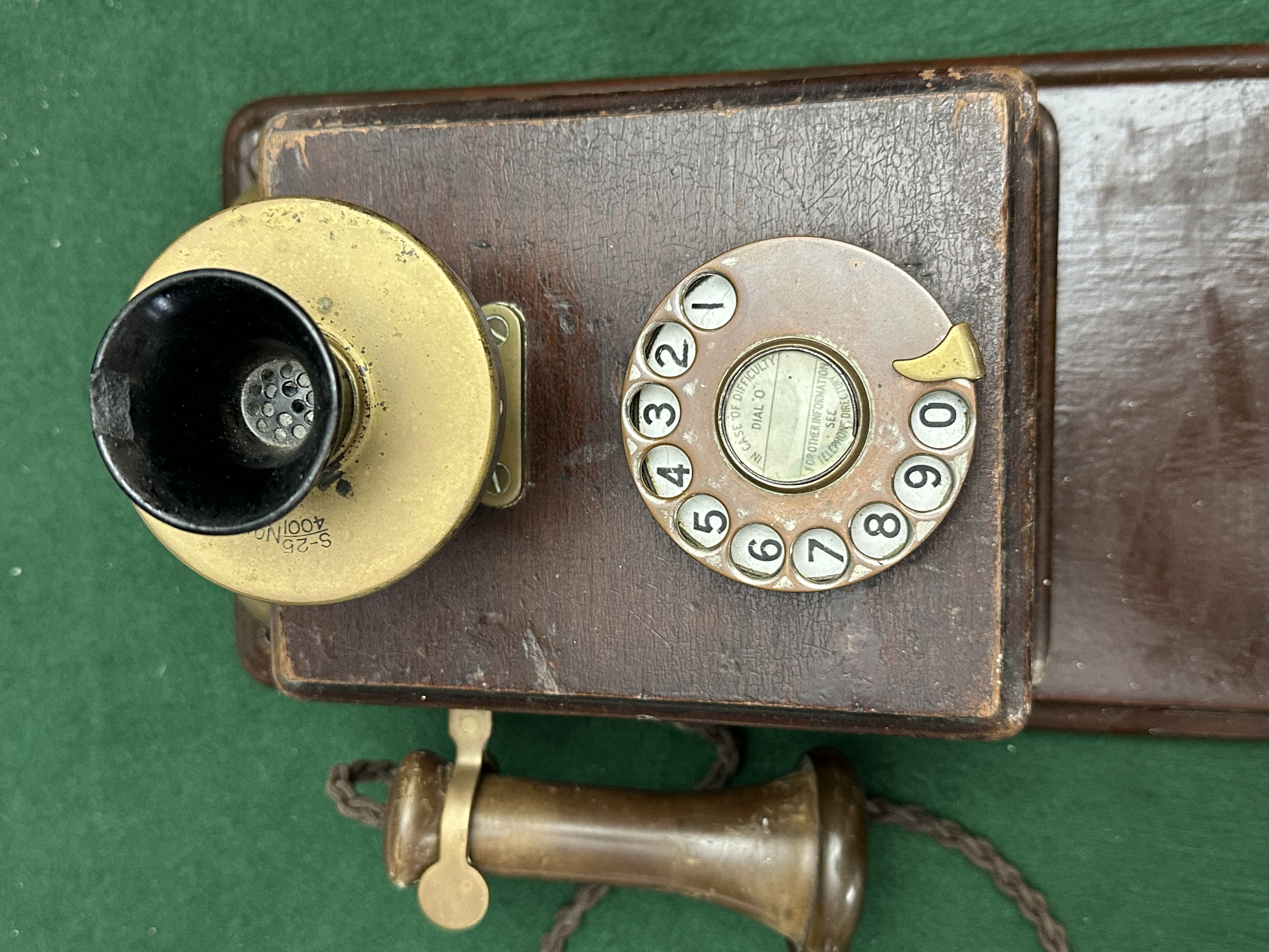 A wall mounted telephone of British General Post Office style featuring a tiered wooden cabinet and backboard. The unit is fitted with twin external brass ringer gongs at the top. The front panel includes a fixed transmitter with a brass housing and a black composition funnel shaped mouthpiece. Below the transmitter is a rotary dial with a brass toned finger plate and white numerical inserts. The centre of the dial contains a paper insert with printed instructions stating IN CASE OF DIFFICULTY DIAL 0 and FOR OTHER INFORMATION SEE TELEPHONE DIRECTORY. A separate handheld receiver with a wooden handle and brass fittings rests on a metal hook switch and is connected to the main body by a brown braided fabric cord. The brass plate behind the mouthpiece is stamped with the characters S-25 and 400/No.