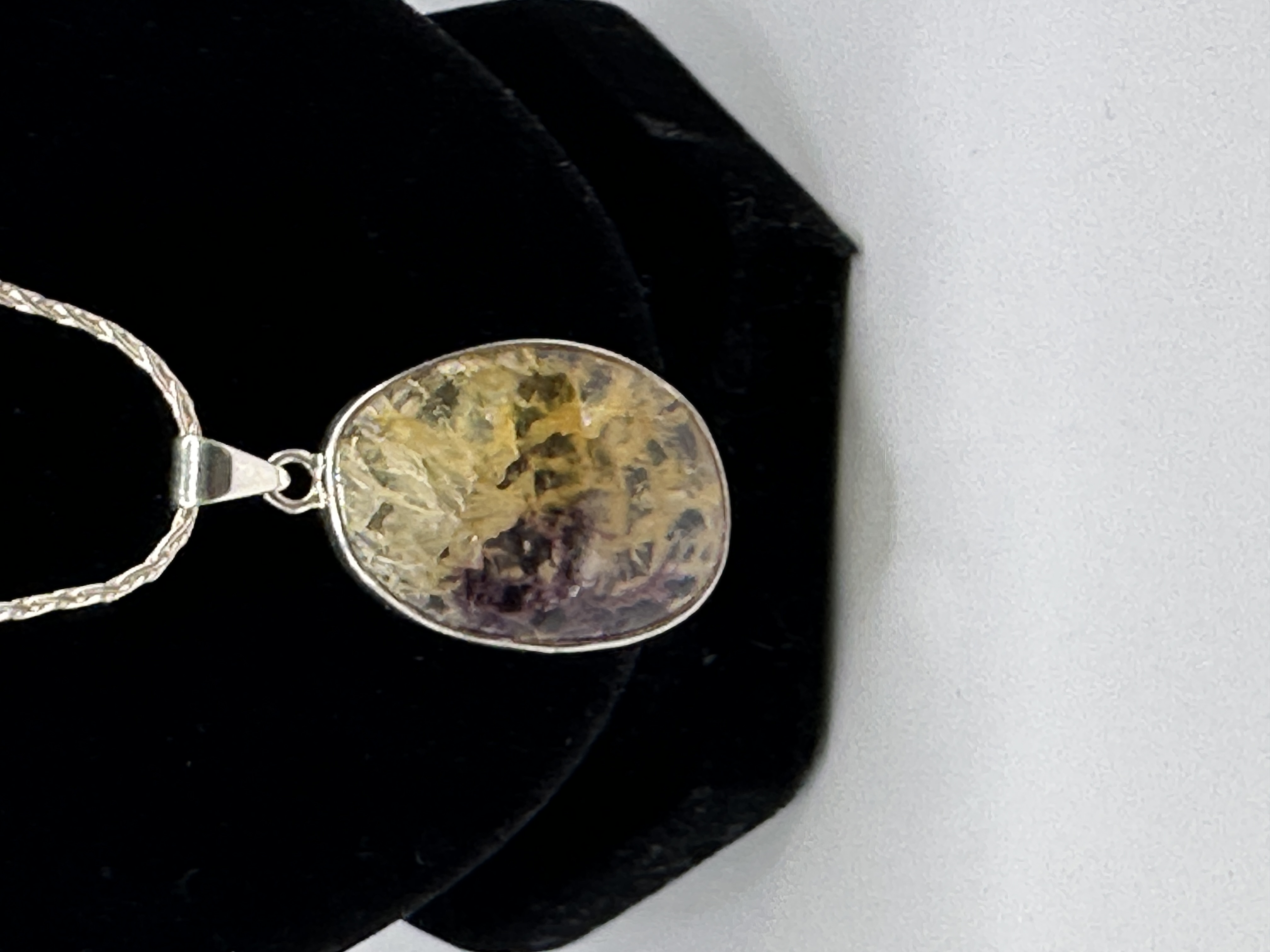 A 925 silver pendant featuring a large oval cabochon of Blue John fluorite. The gemstone is set within a simple bezel mount and displays the characteristic banded appearance of the mineral, with rich purple and creamy yellow-gold veining. The stone exhibits natural internal cleavage planes and crystalline structures. The pendant is suspended from a tapered bail and is accompanied by a matching 925 silver spiga or wheat link chain. The reverse of the bail is incised with the numerals 925, indicating the silver purity.