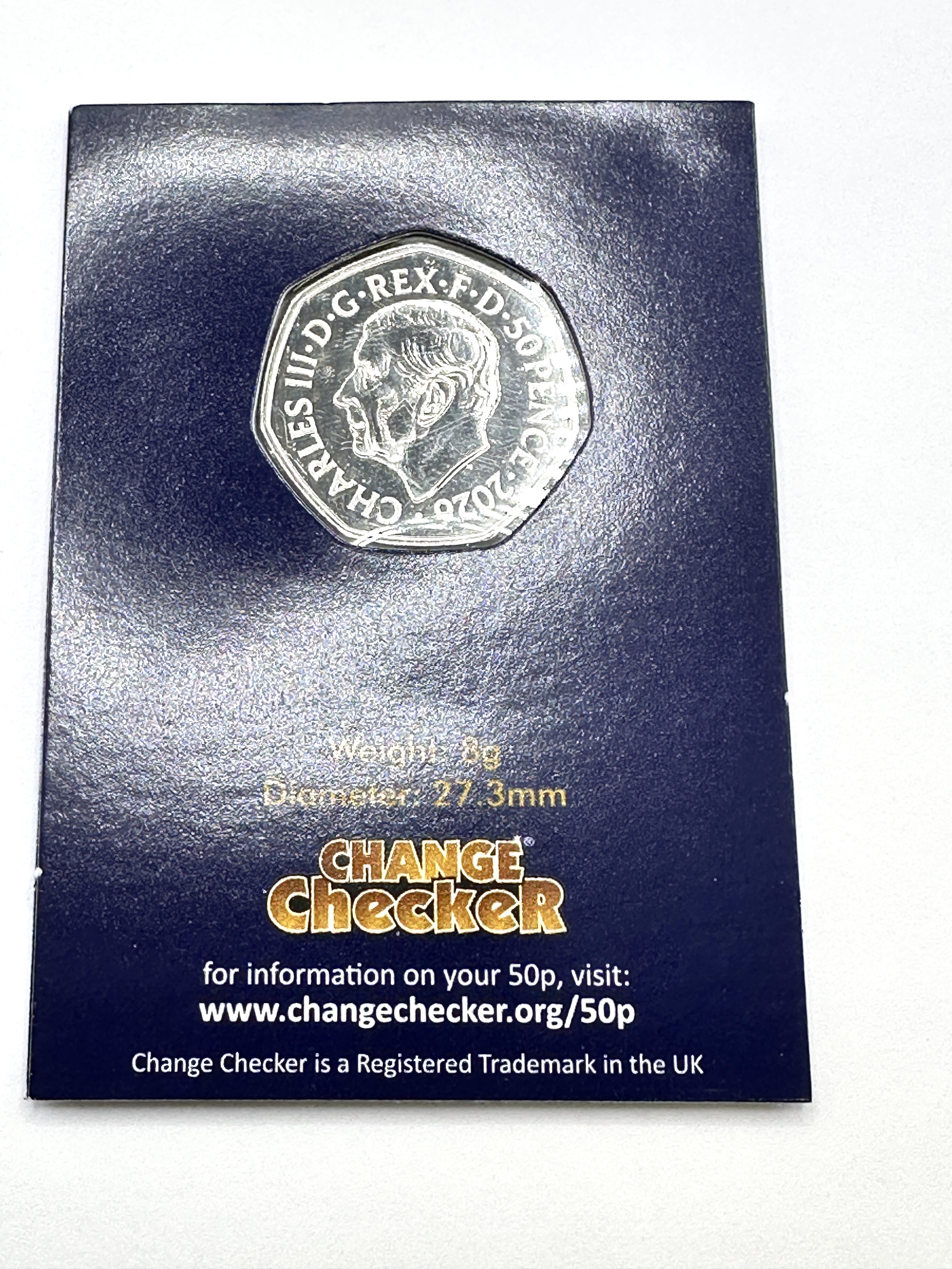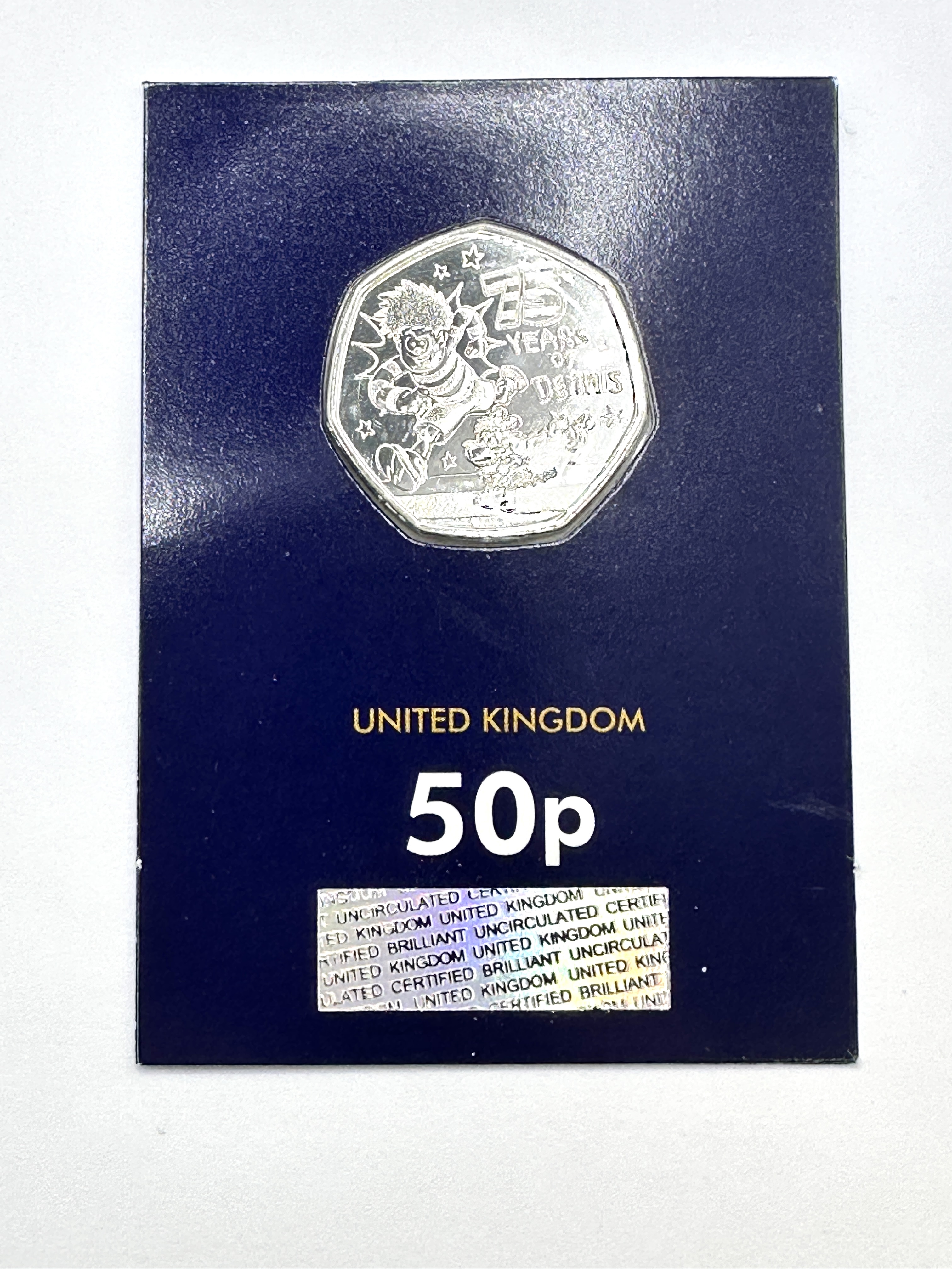 A UK 50 pence commemorative coin dated 2023, issued to celebrate the 75th anniversary of the comic character Dennis the Menace. Struck in cupro-nickel, the heptagonal coin features the left-facing portrait of King Charles III on the obverse with the legend CHARLES III D G REX F D 50 PENCE 2023. The reverse features the 75 Years of Dennis design. The coin is presented in a Change Checker protective display card with a holographic certification seal.
