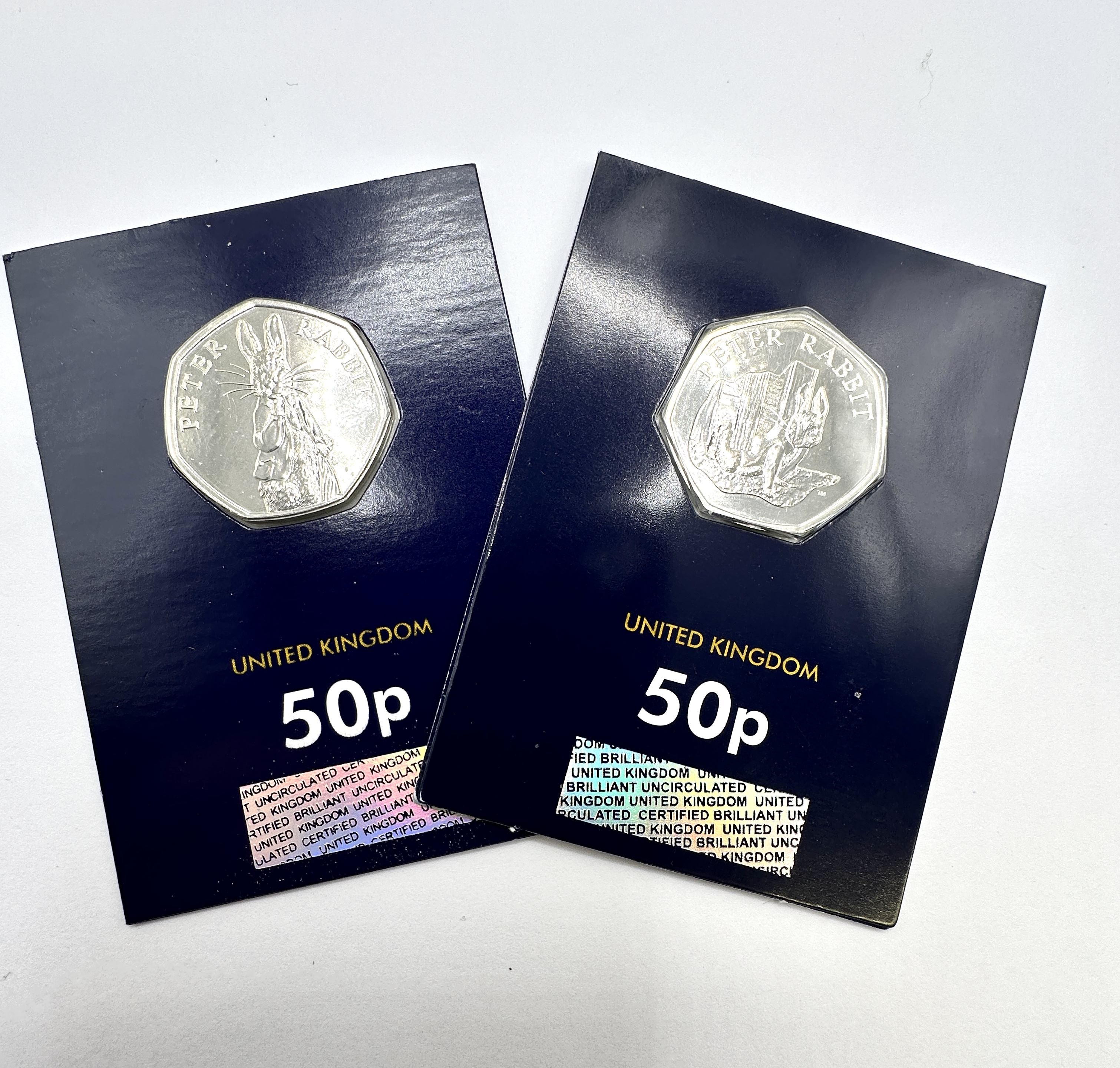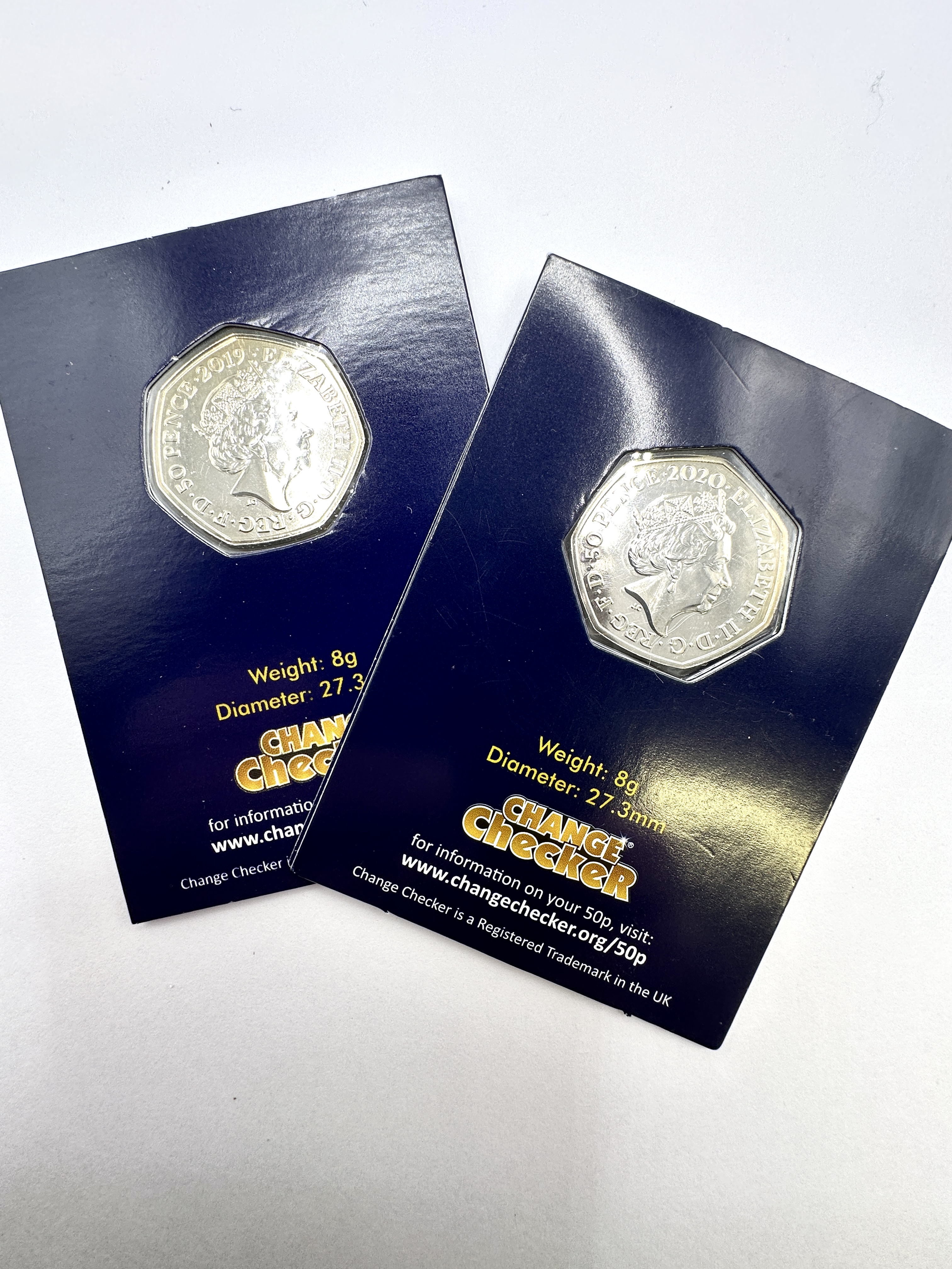 A pair of United Kingdom cupro-nickel 50 pence coins issued by the Royal Mint, dated 2019 and 2020. These commemorative issues form part of the series celebrating the works of Beatrix Potter. The 2019 reverse features a portrait of Peter Rabbit’s head and shoulders, while the 2020 reverse depicts Peter Rabbit in a garden setting. Both coins feature the fifth definitive portrait of Queen Elizabeth II by Jody Clark on the obverse, surrounded by the legend ELIZABETH II D G REG F D 50 PENCE and the respective year. The coins are seven-sided equilateral curve heptagons with plain edges. Each coin is presented in a Change Checker blue protective collector card featuring a holographic security strip and is identified as United Kingdom Certified Brilliant Uncirculated.