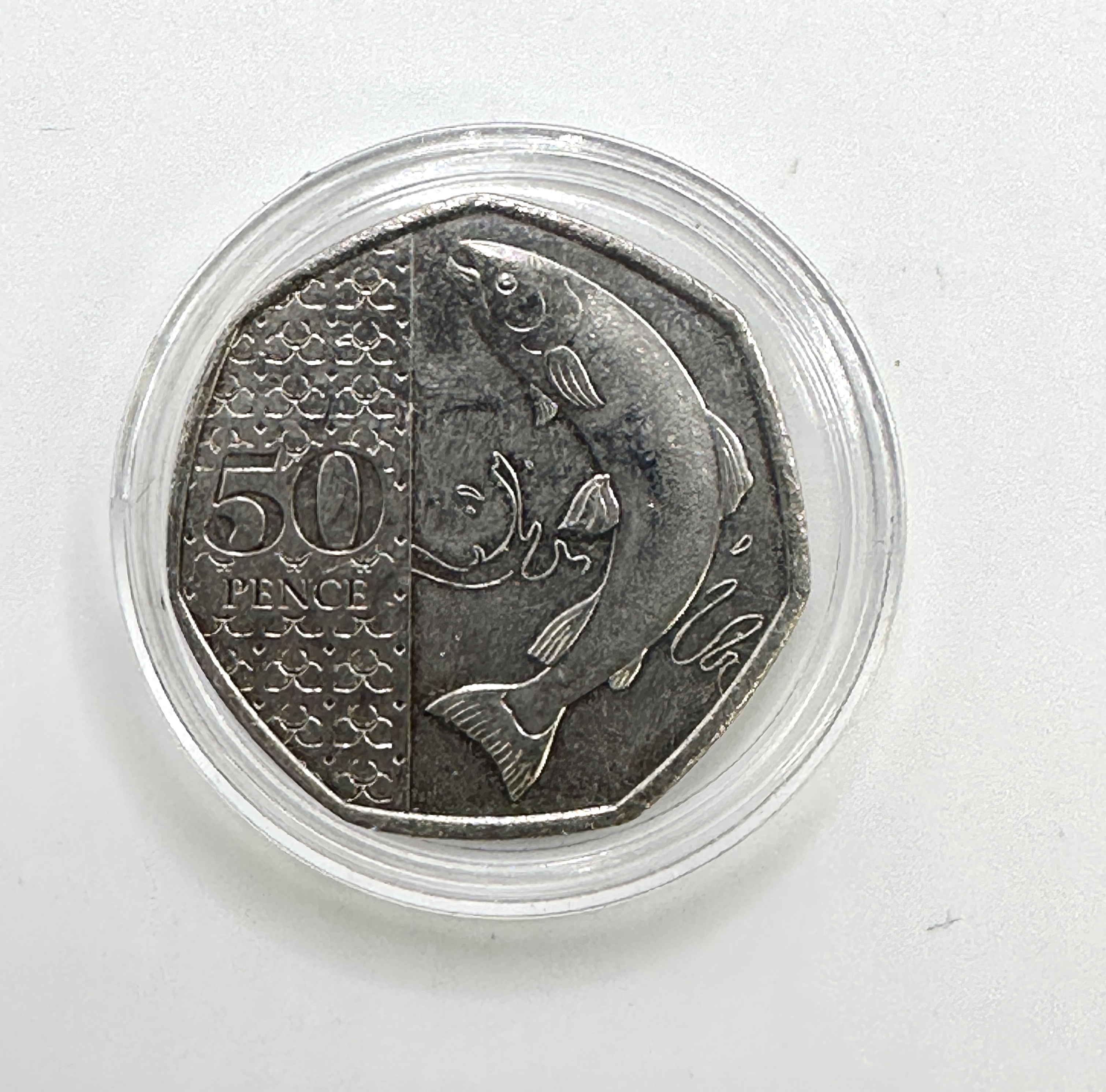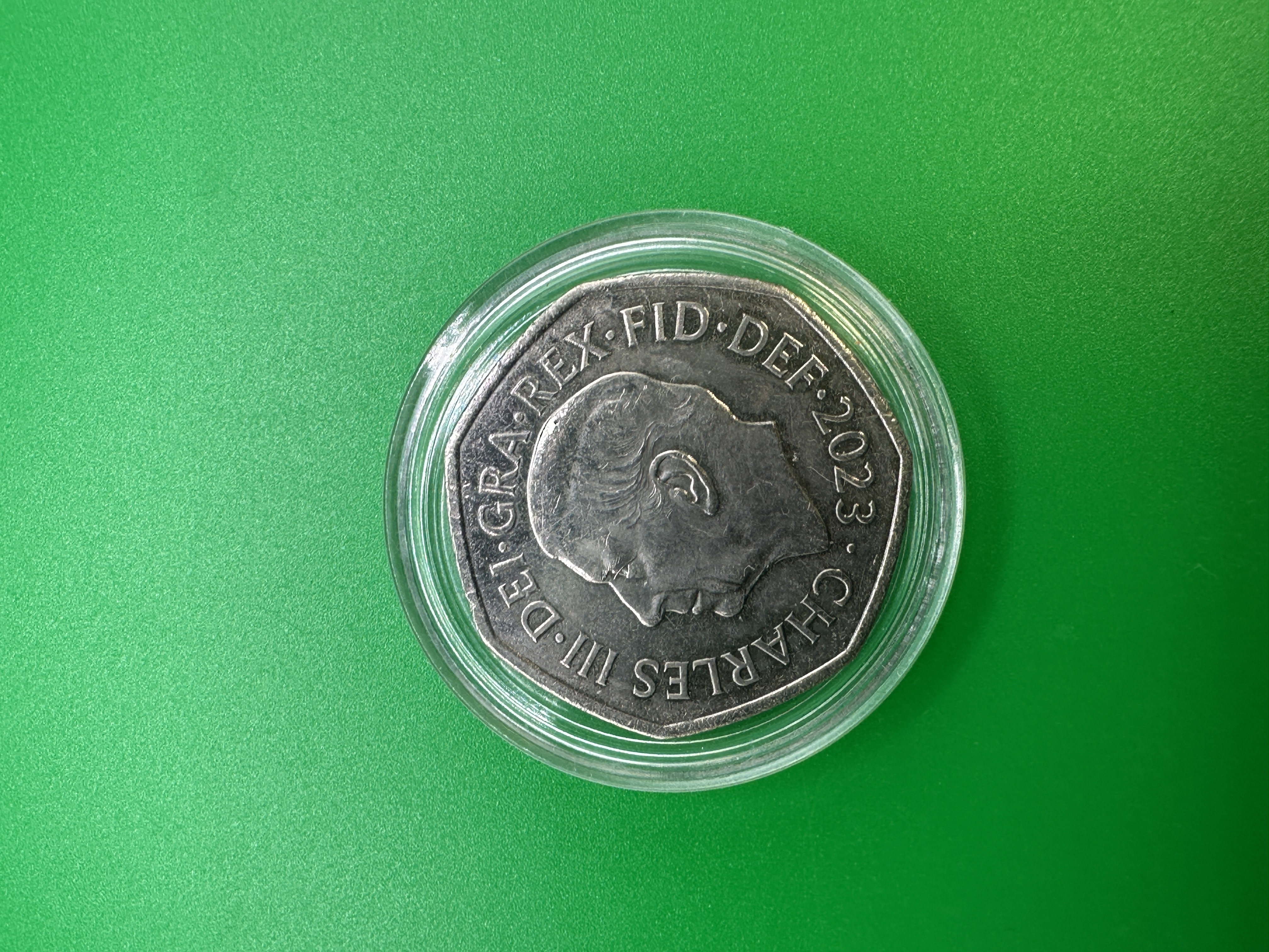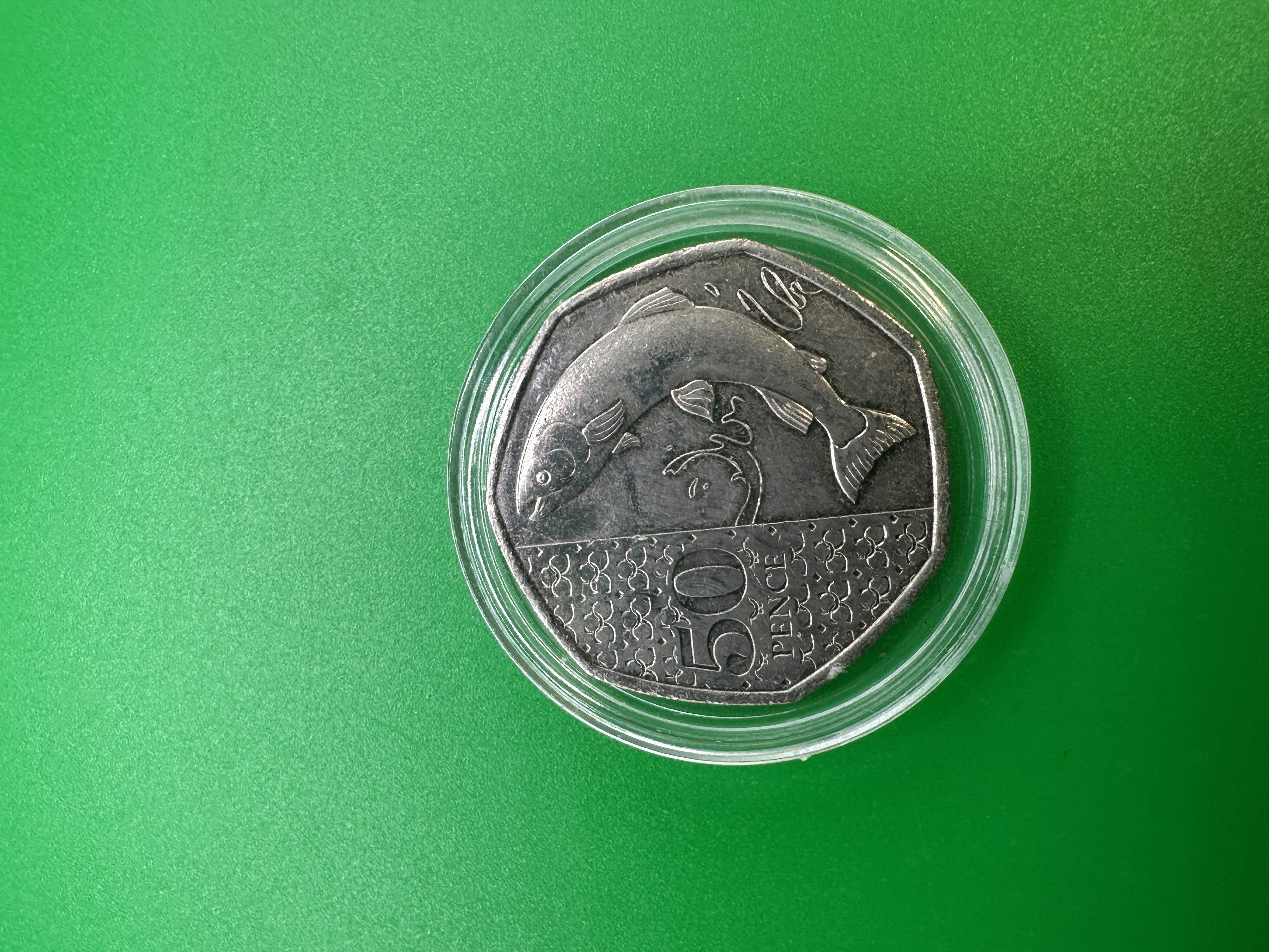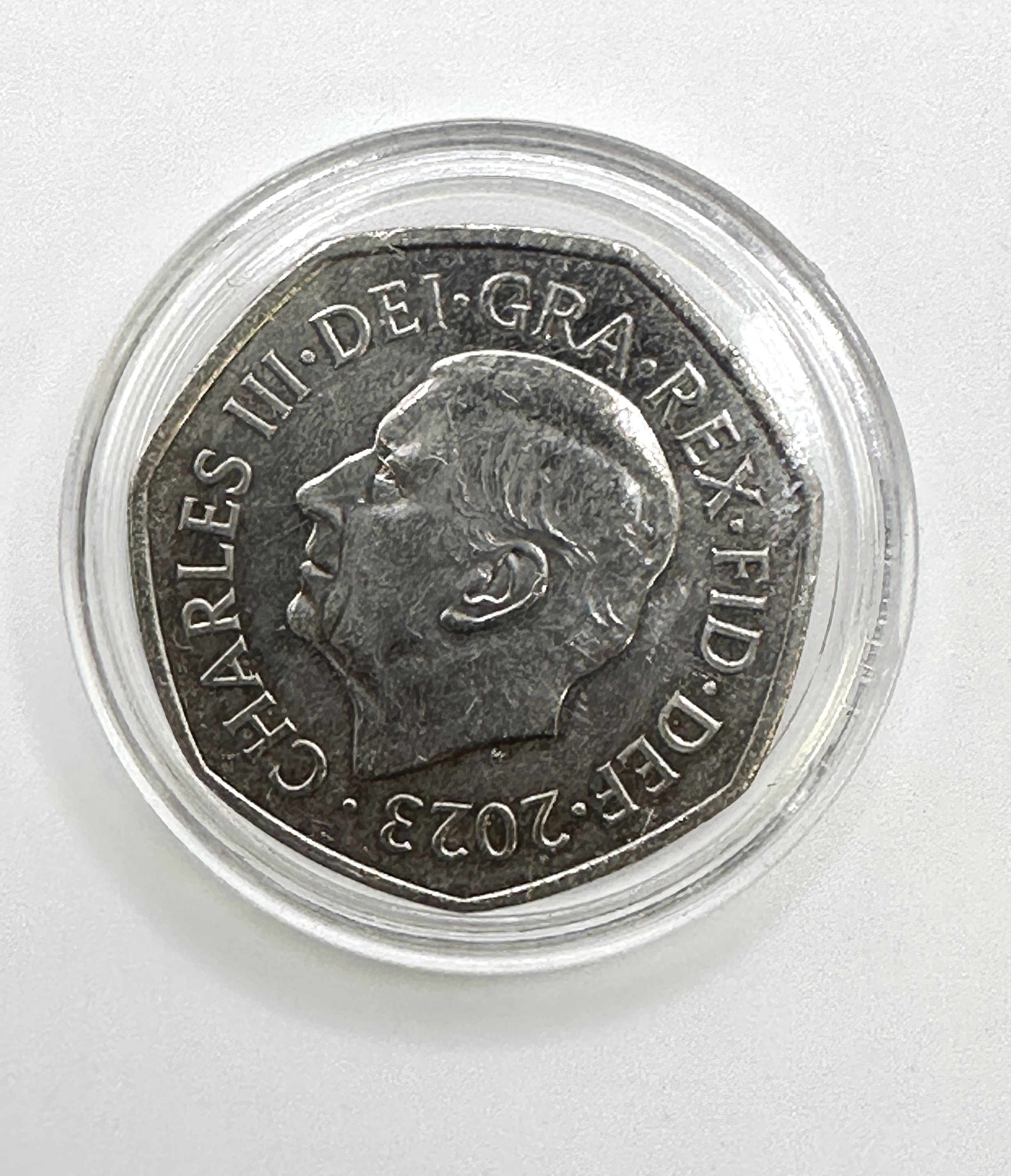 A UK 50 pence coin, dated 2023, struck in cupro-nickel. The coin features the characteristic equilateral curved heptagonal shape. The obverse bears the King Charles III definitive portrait with the Latin legend CHARLES III DEI GRA REX FID DEF 2023. The reverse features the Atlantic Salmon design with a background pattern of repeating interlocking C symbols and the denomination 50 PENCE. The coin is housed in a clear plastic protective capsule. This design was introduced as part of the new definitive coinage for the reign of King Charles III.