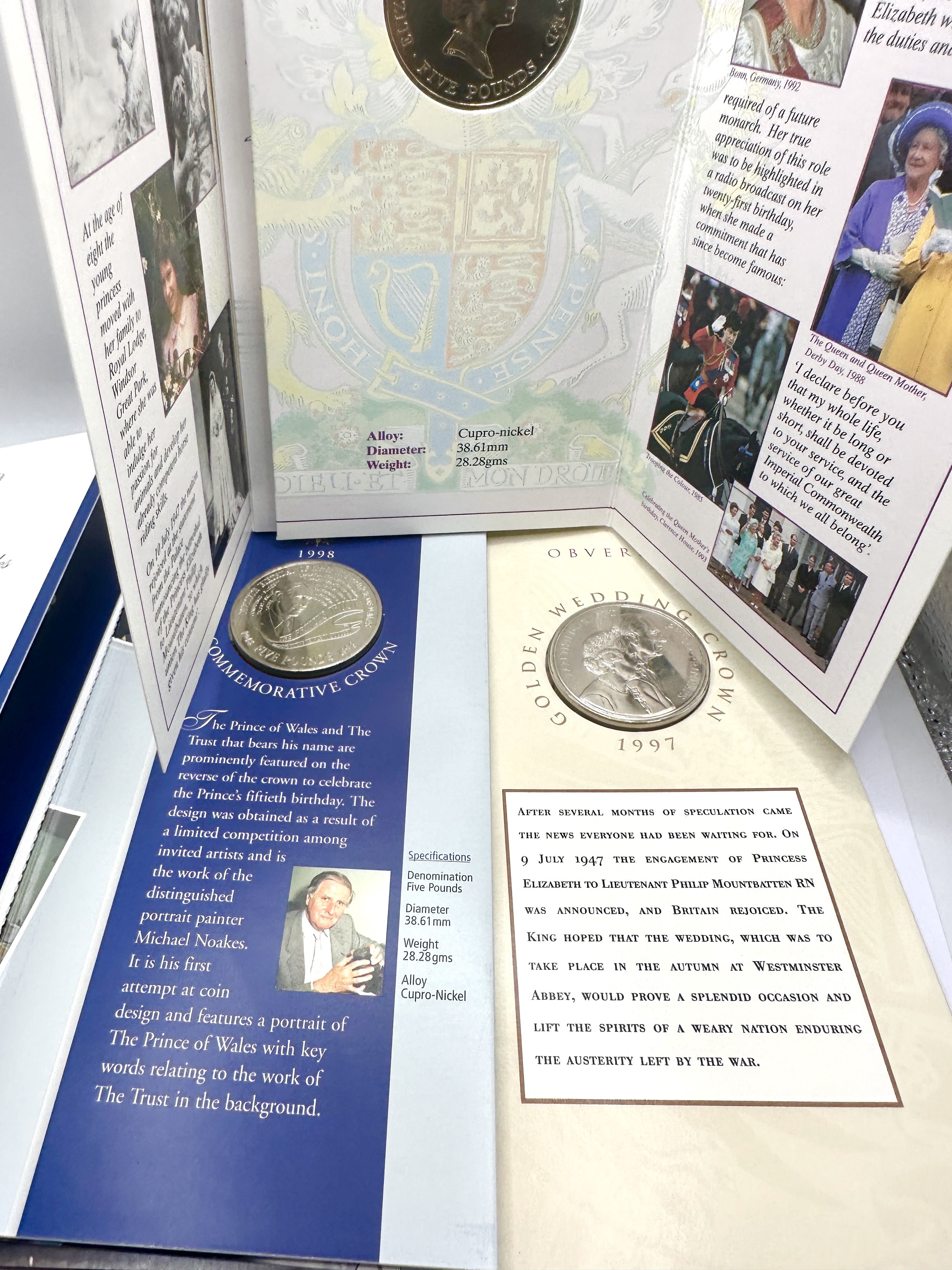 A trio of Royal Mint commemorative five-pound crown coins in their original illustrated card presentation folders. The collection includes a 1996 crown commemorating the 70th birthday of Queen Elizabeth II, a 1997 Golden Wedding Anniversary crown, and a 1998 crown commemorating the 50th birthday of HRH The Prince of Wales. The 1996 issue features the obverse legend ELIZABETH II DEI GRATIA REGINA F D, which translates as Elizabeth II by the Grace of God Queen, Defender of the Faith. The 1997 issue features the dual portraits of the Queen and Prince Philip on the reverse. The 1998 issue features a reverse portrait of the Prince of Wales by Michael Noakes. These crowns were issued by the Royal Mint to commemorate significant royal anniversaries and birthdays.