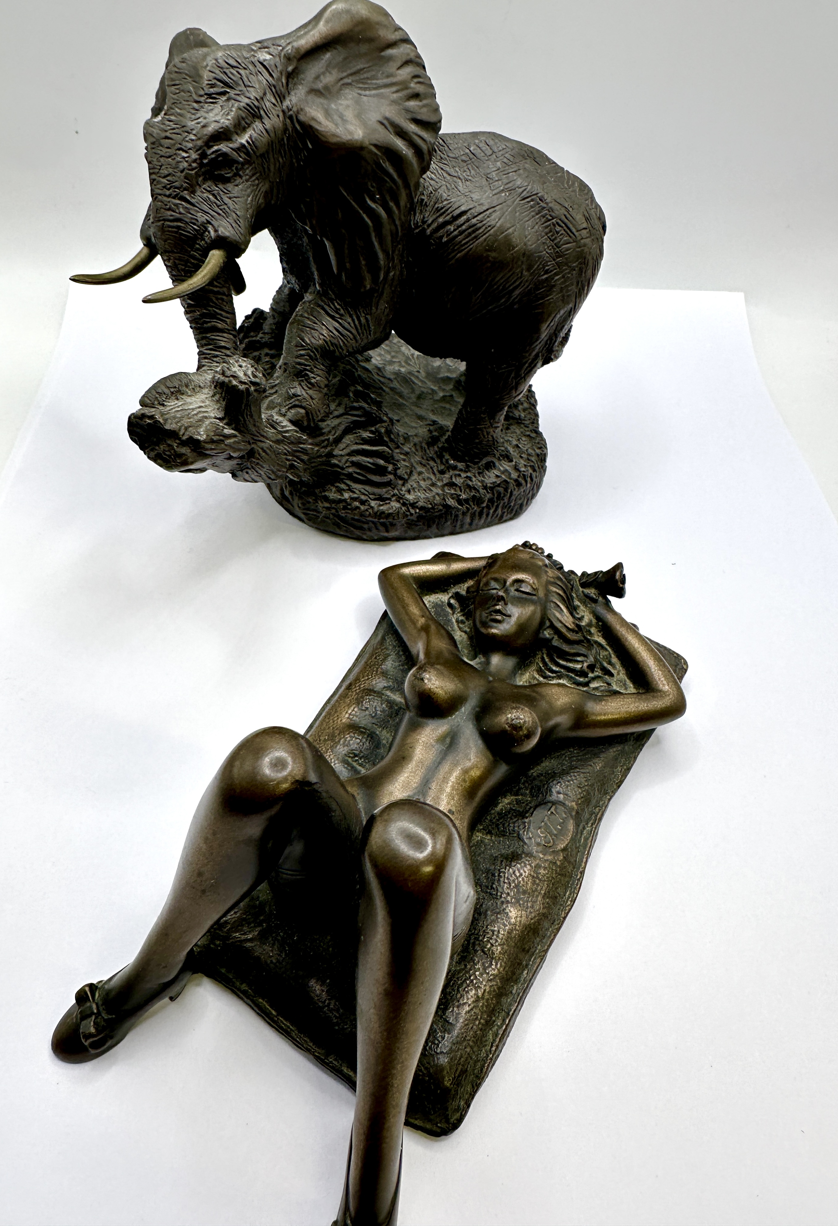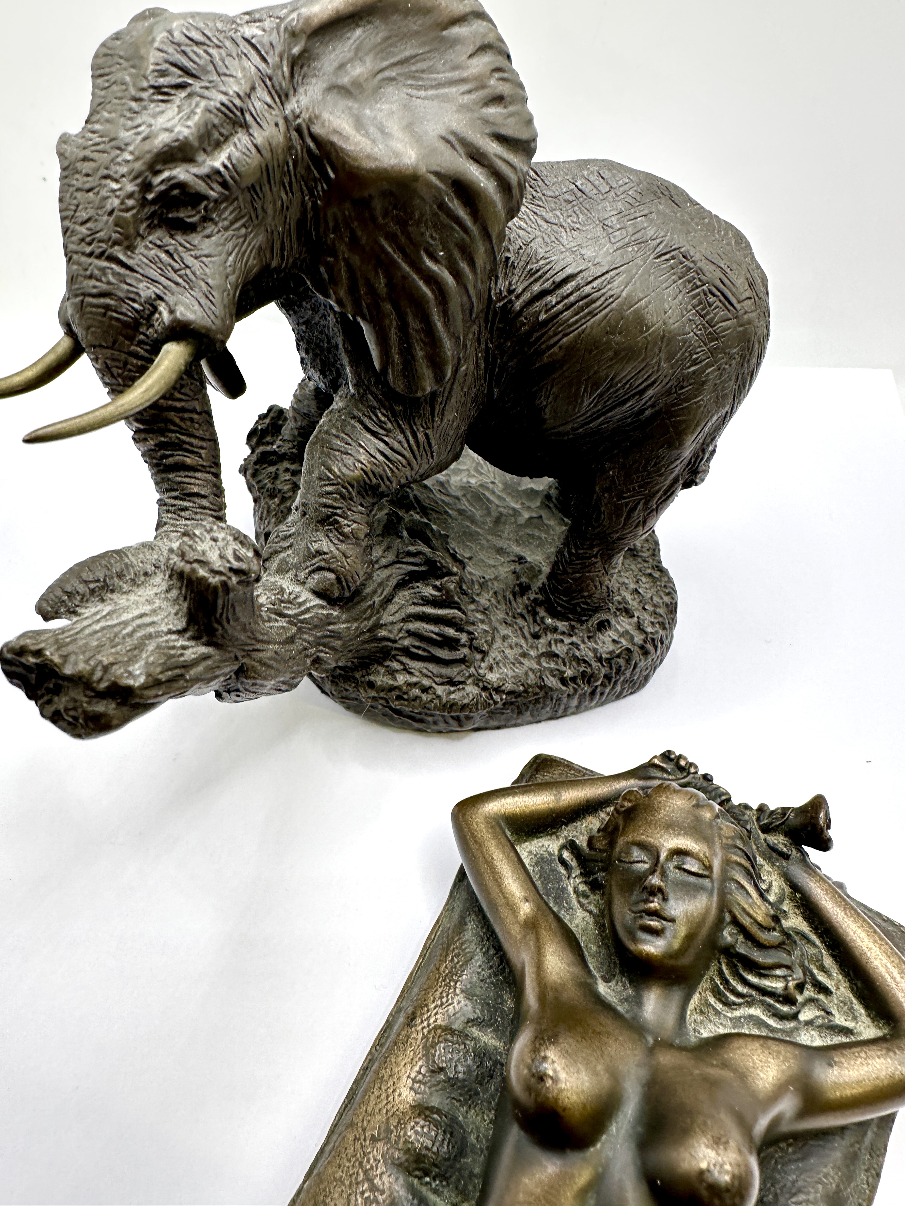 Both sculptures appear to be in good condition with no visible cracks, breaks, or repairs. There is minor surface wear and light rubbing to the patination on the high points of the castings, consistent with age and display.