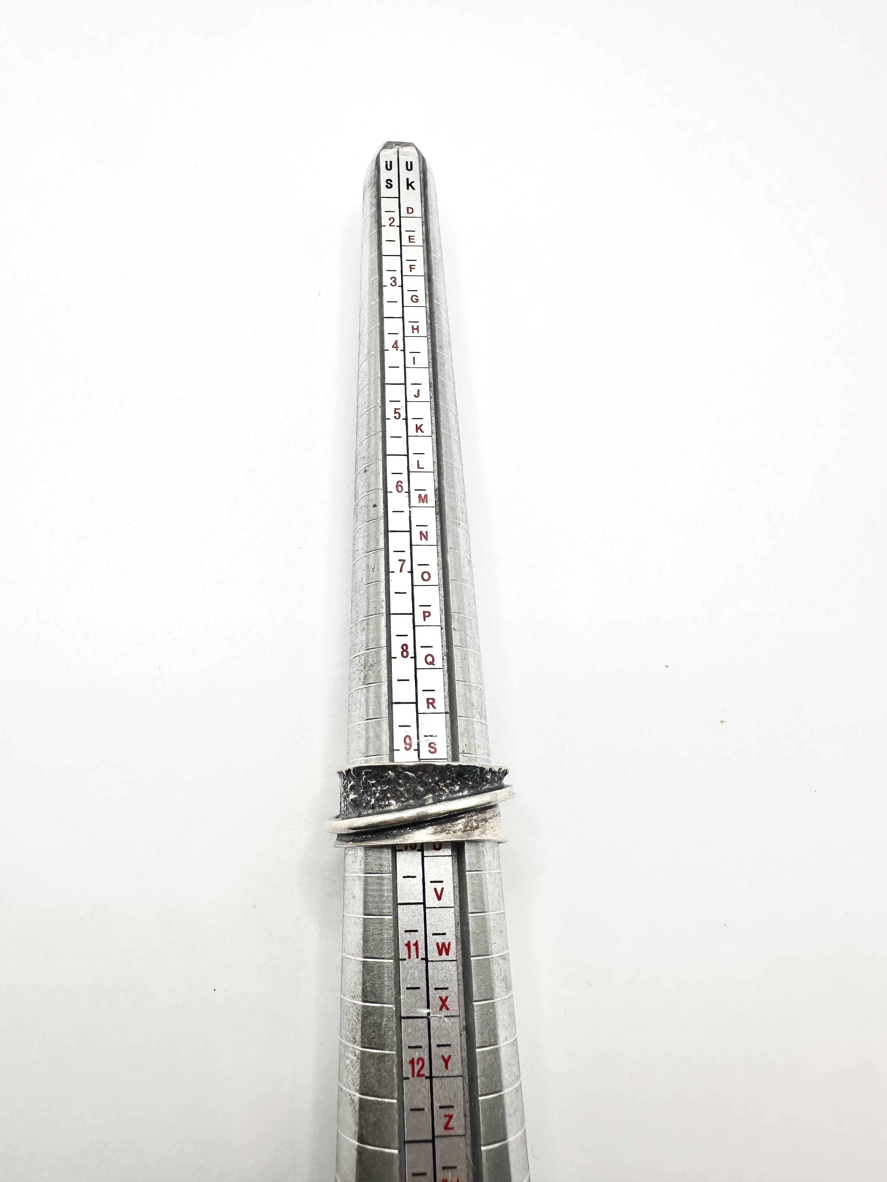 The ring is in good overall condition with intentional surface textures and patination. It displays minor surface wear and fine scratches consistent with a hand-crafted item.