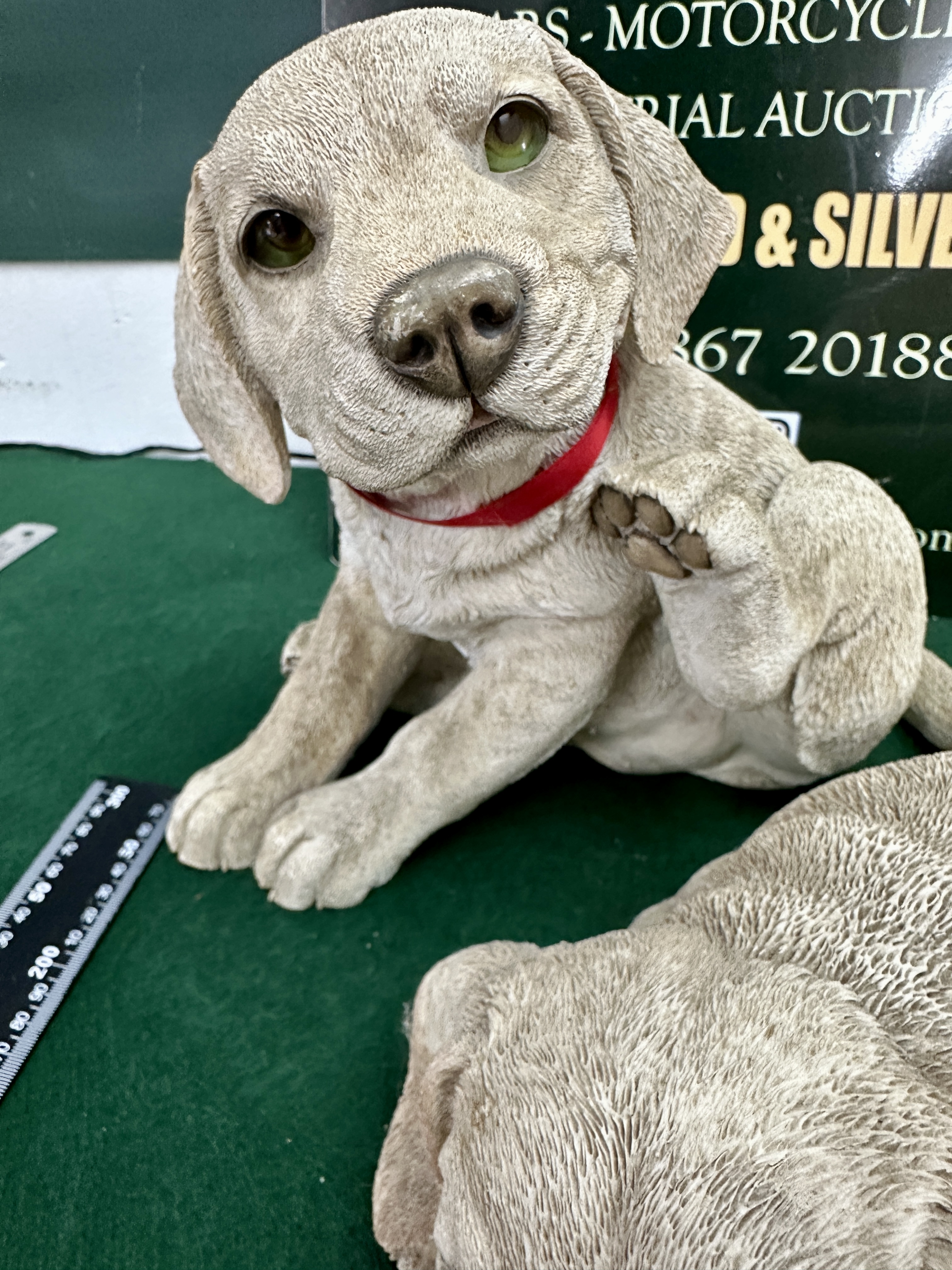 This lot features a pair of realistic figurines depicting yellow Labrador Retriever puppies, consistent with designs produced by Sandicast. Each figure is constructed from a heavy cast resin or composition material, featuring a highly textured surface to replicate the appearance of fur. One model portrays a seated puppy in a scratching pose, wearing a red rubberised collar. The second model is depicted in a recumbent position with its head resting near its forepaws. Both figurines include inset glass or plastic eyes for a lifelike appearance. The pieces are finished in a pale buff tone with darker shaded detailing to the ears and paws. No maker’s marks or signatures are visible on the exterior surfaces.