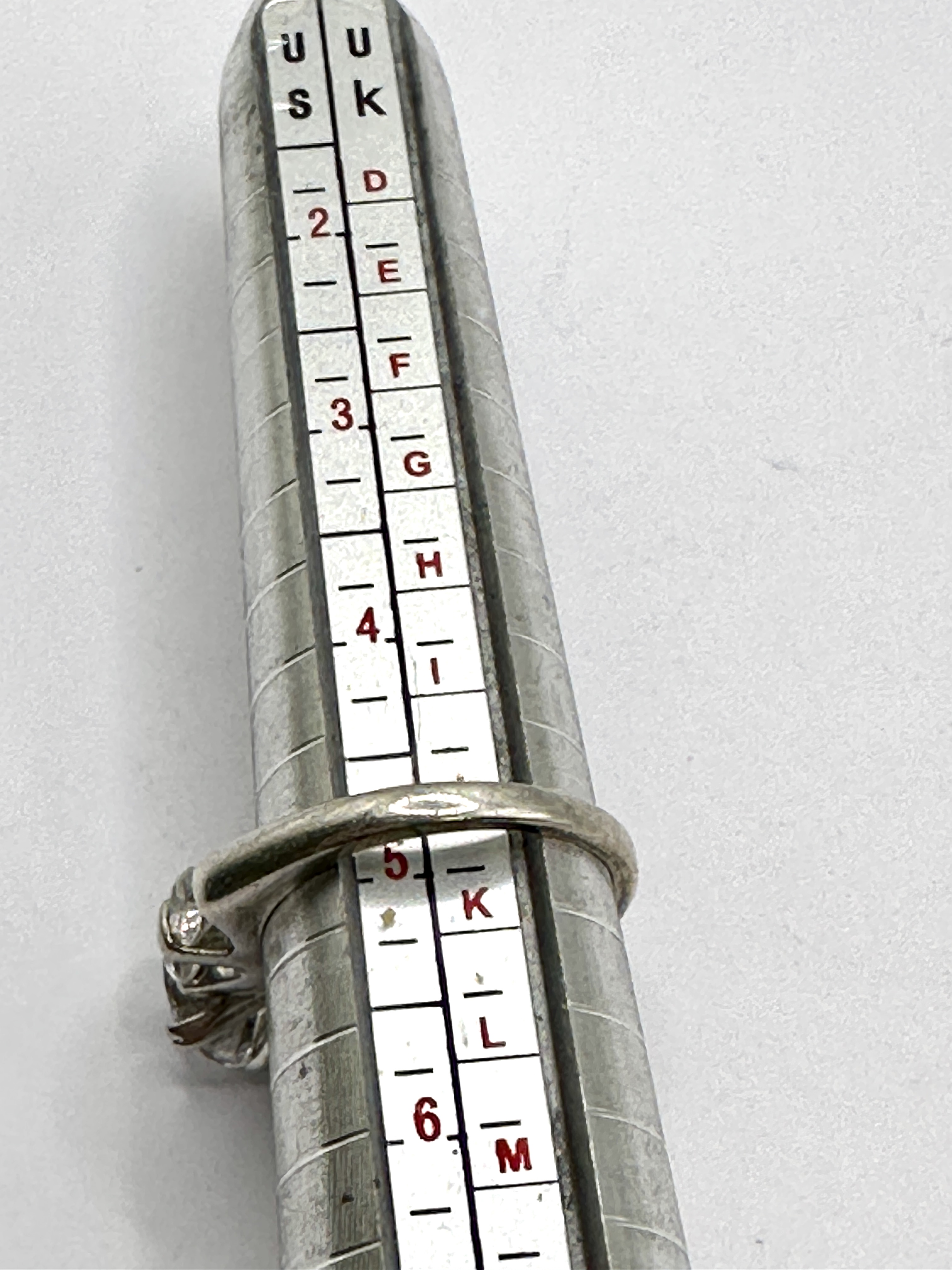 The ring is in a worn condition. The silver setting shows overall surface scratches, minor dings, and tarnish consistent with regular use. The stones appear heavily included and show minor surface wear.