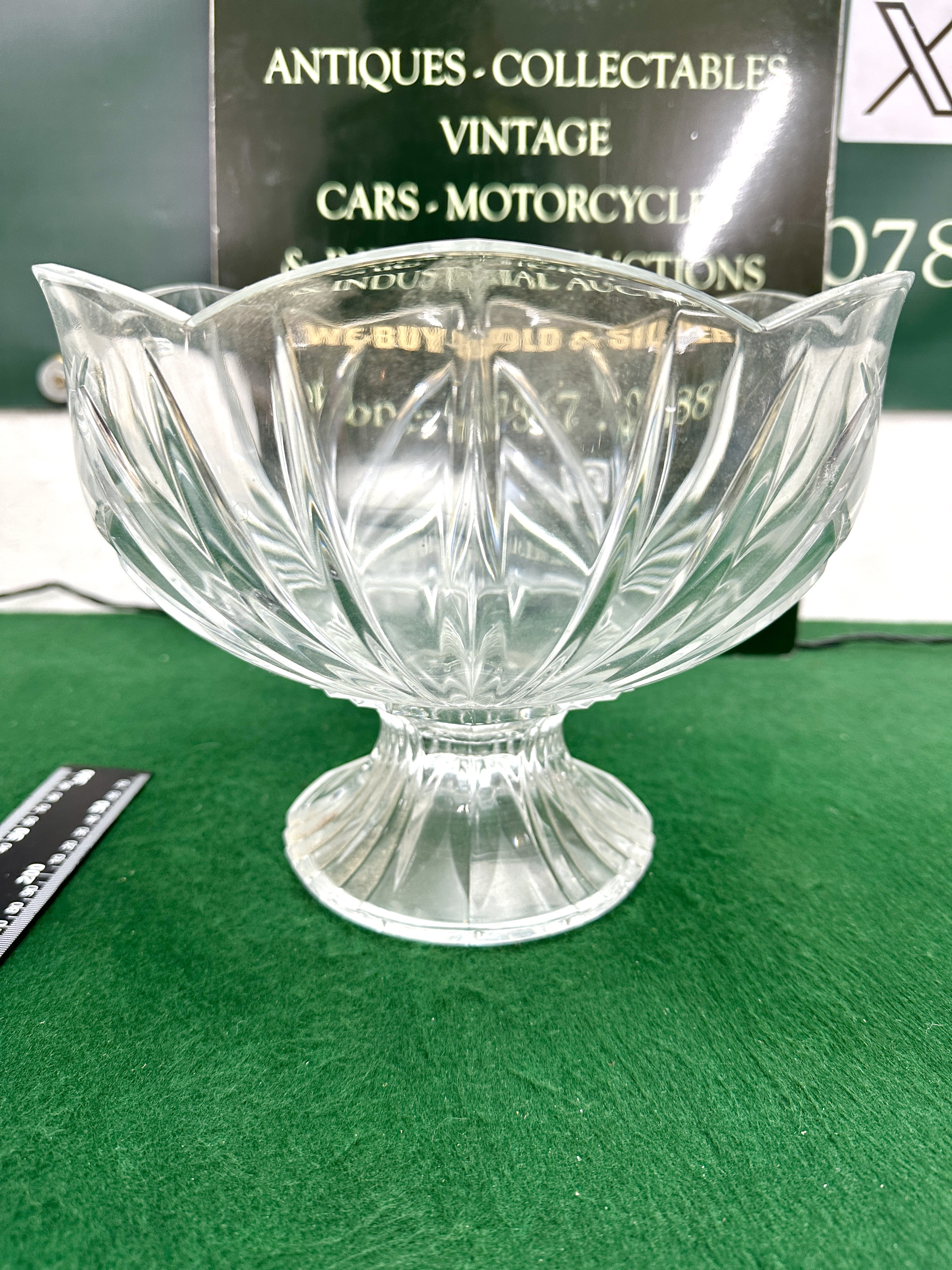The crystal appears bright and clear with no visible signs of cloudiness or glass sickness. There are no significant chips, cracks, or repairs visible to the scalloped rim or the pedestal base.