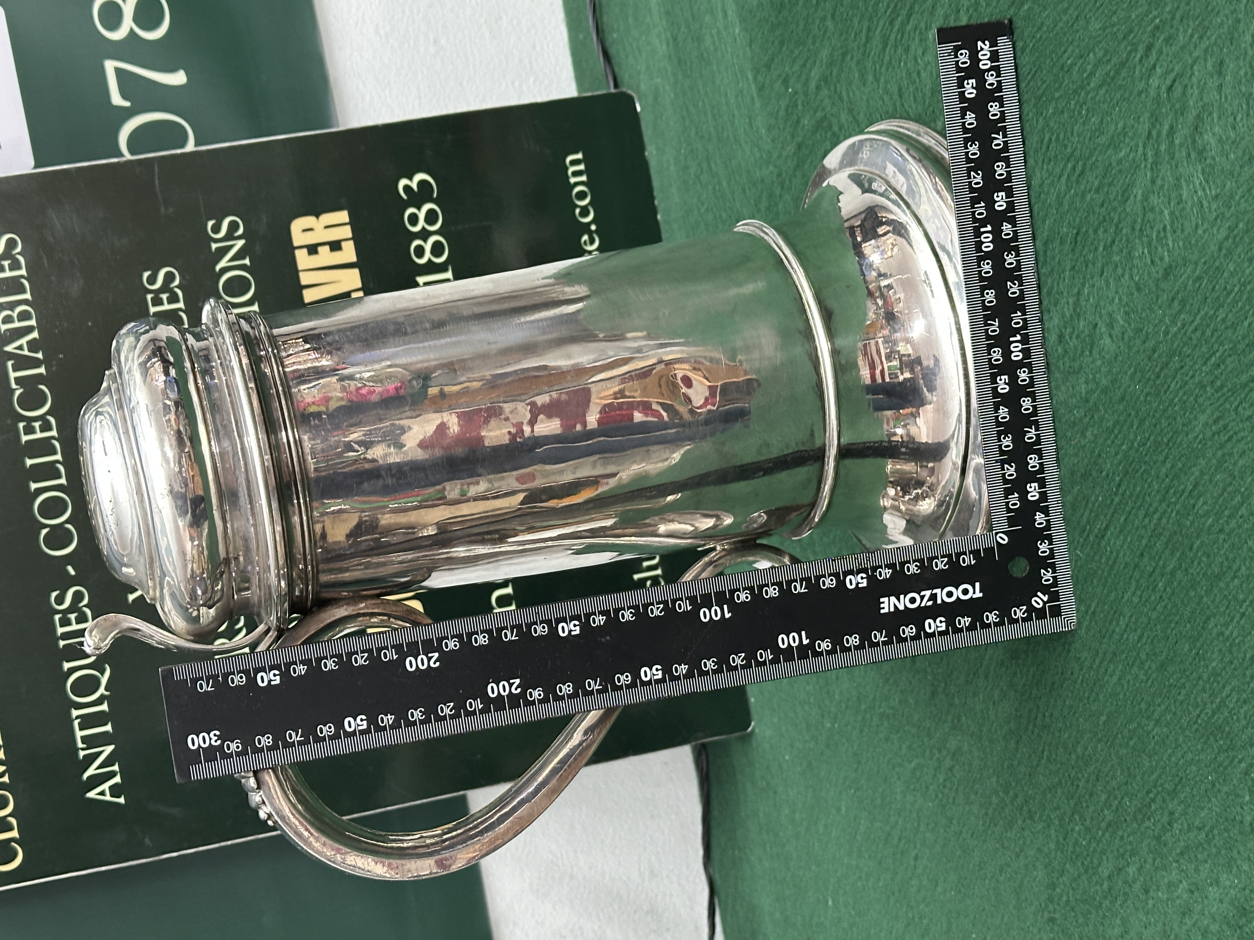 The tankard is in good antique condition with surface wear, minor scratches, and patination consistent with its age. The interior shows typical signs of use and oxidation. The hinge and handle are secure and function correctly.