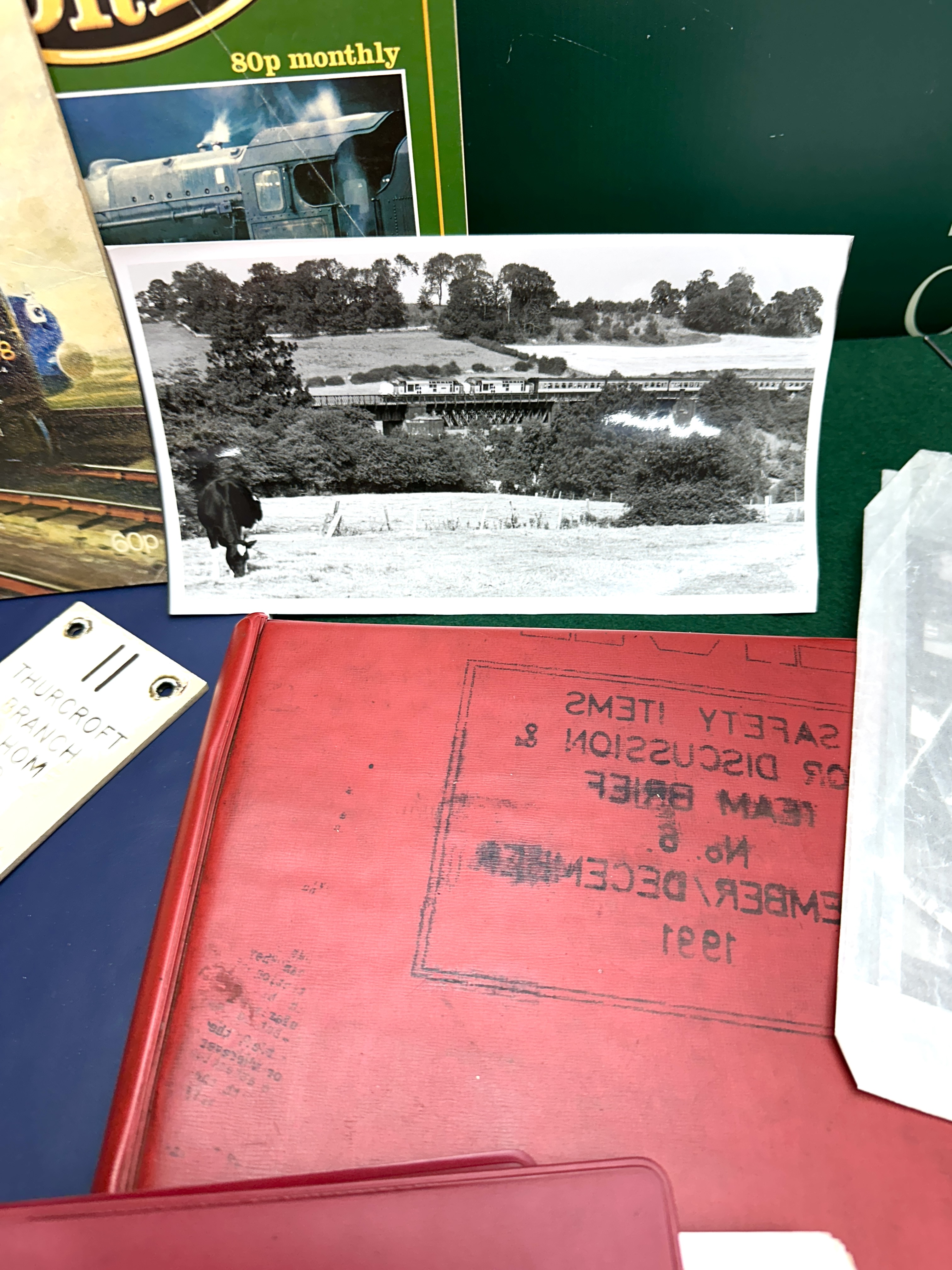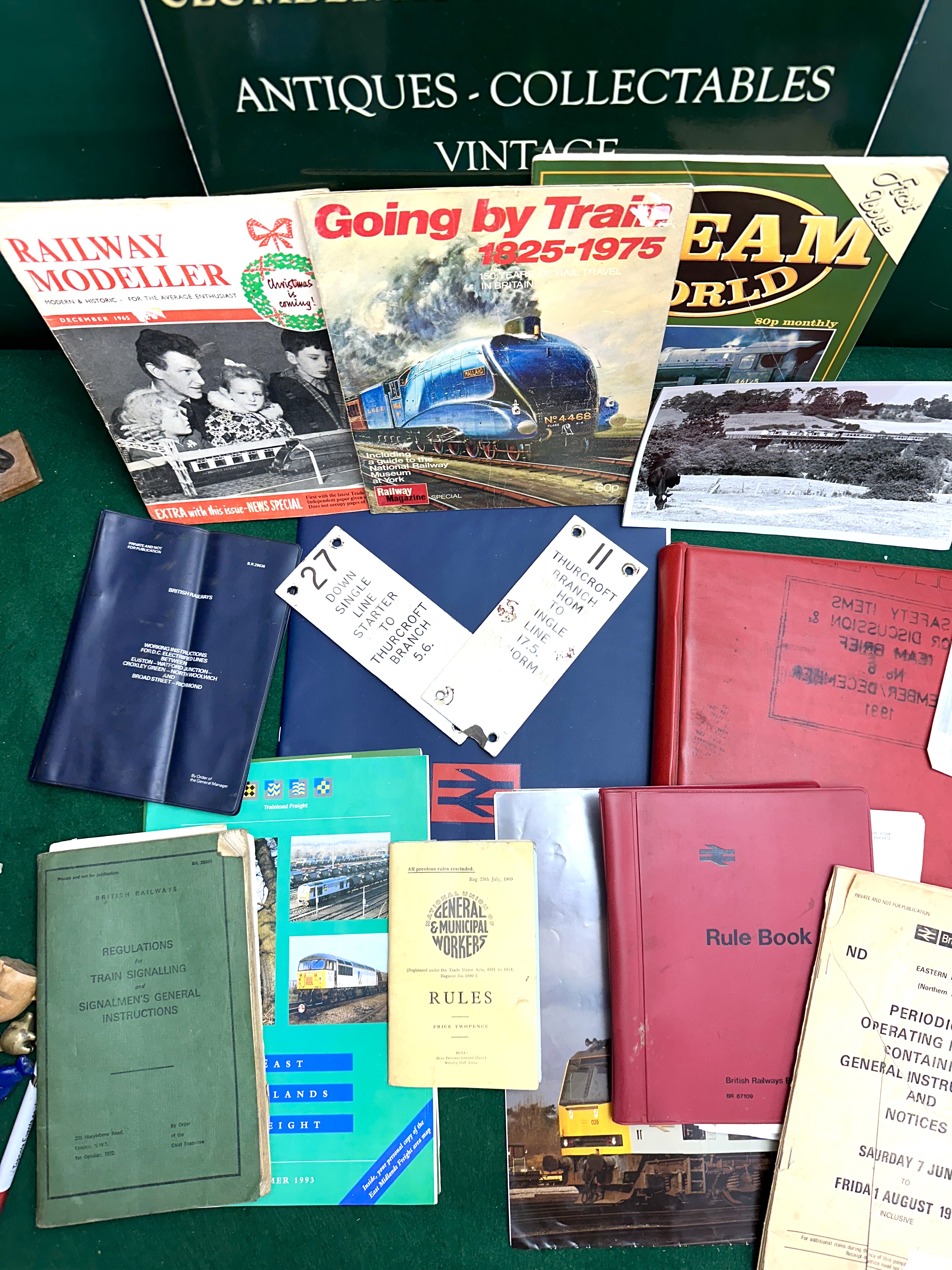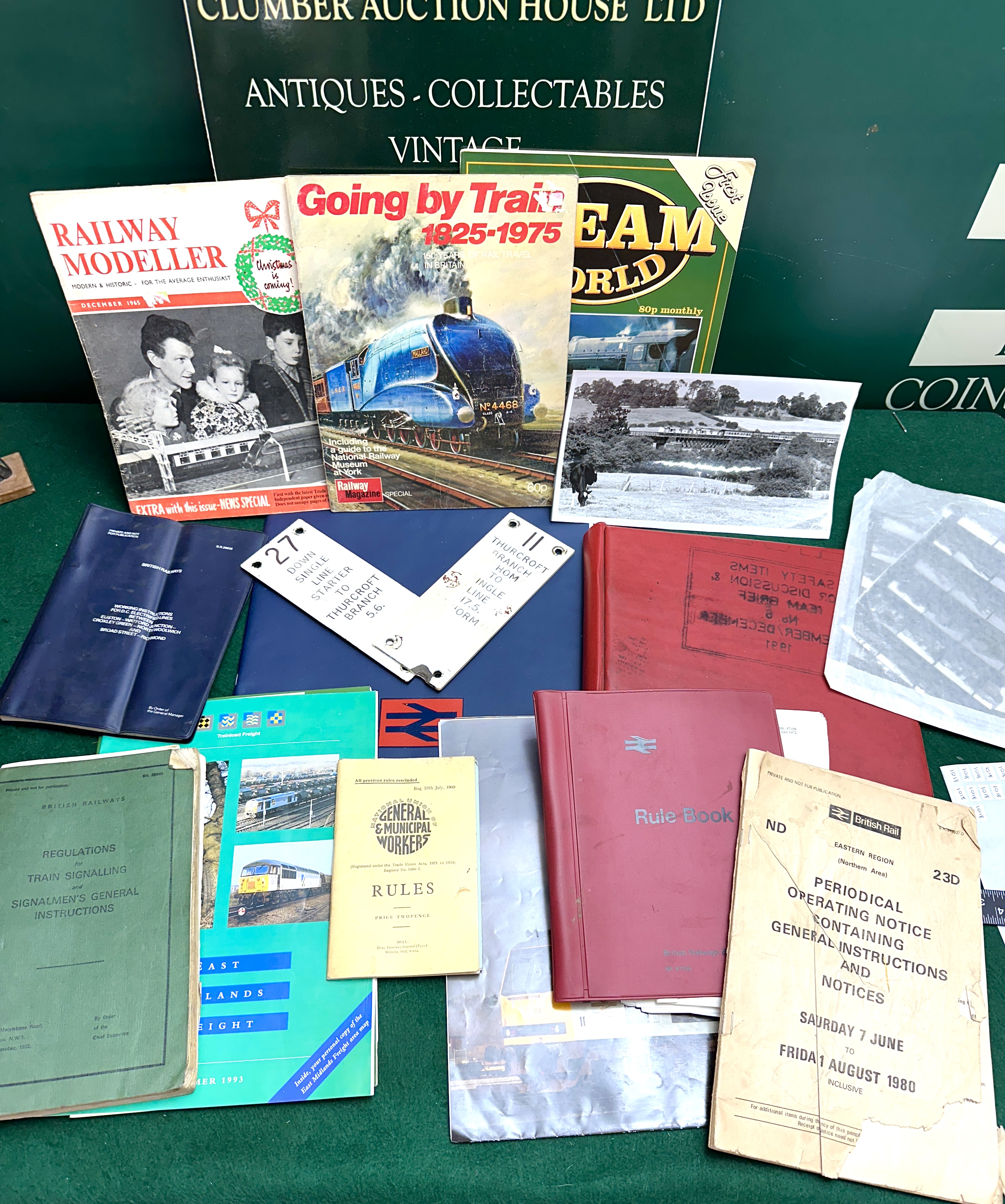 An assortment of British railway related items comprising magazines, official manuals, and signalling hardware. The collection includes a December 1965 issue of Railway Modeller, the first issue of Steam World magazine, and a Railway Magazine special titled Going by Train 1825-1975 featuring the LNER Class A4 locomotive Mallard. Official documentation includes a green cloth-bound volume of Regulations for Train Signalling and Signalmen’s General Instructions dated 1 October 1972, a red British Rail Rule Book, and a Periodical Operating Notice for the Eastern Region Northern Area dated June to August 1980. Also present is a 1969 National Union of General and Municipal Workers rule book and a 1993 Trainload Freight East Midlands booklet. The lot features two white enamelled metal signal box lever plates for the Thurcroft Branch: plate number 27 for the Down Single Line Starter and plate number 11 for the Branch Home to Single Line. Additional items include a blue British Railways binder for D.C. Electrified Lines, a red 1991 Safety Items folder, and a black and white photograph of a train crossing a viaduct.