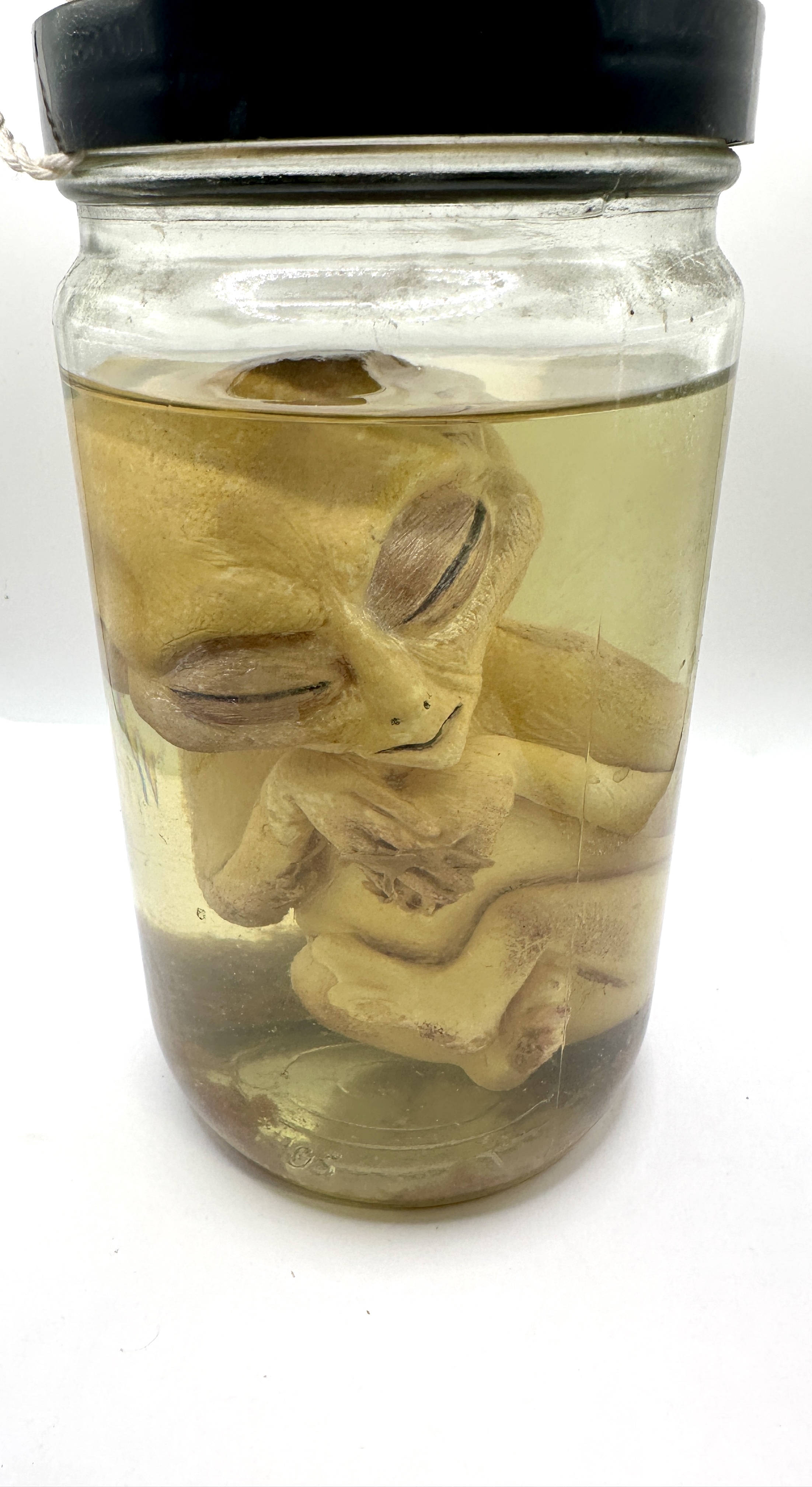 The item is in good condition as a novelty piece. The label is intentionally distressed with stains and worn edges to simulate age. The yellowish tint of the preserving liquid is a deliberate design feature. The glass jar is free from visible chips or cracks.