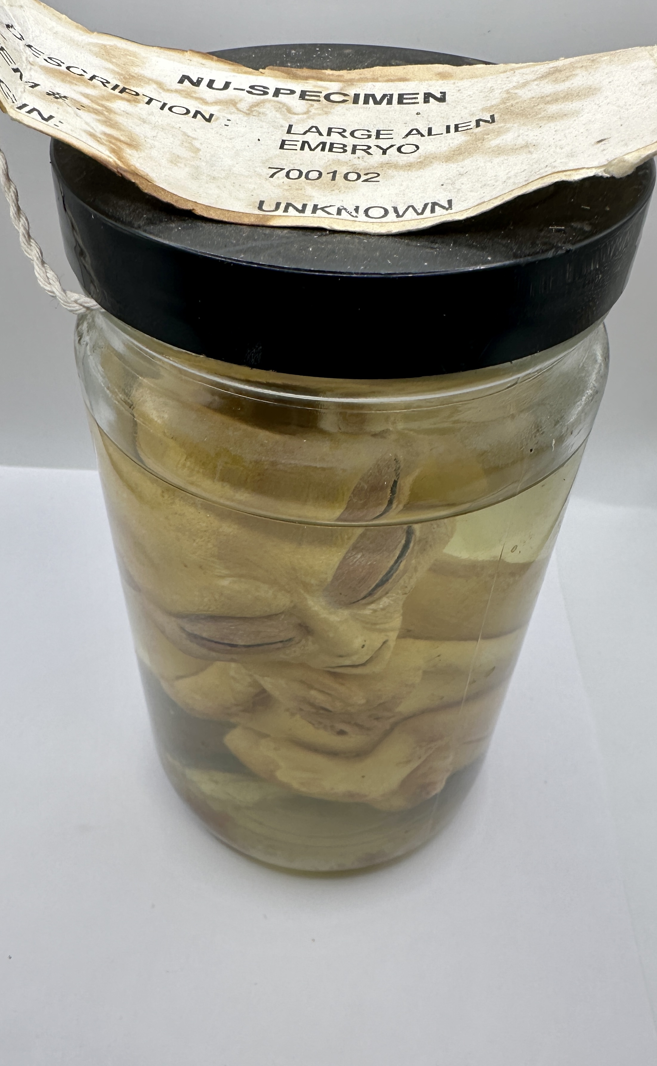 A novelty prop specimen titled Nu-Specimen Large Alien Embryo. The item consists of a sculpted figure representing a Grey type alien in a fetal position, featuring a large cranium, almond-shaped eyes, and small facial features. The figure is submerged in a yellowish-tinted liquid within a clear cylindrical glass jar, sealed with a black screw-on lid. Resting on the lid is a weathered and distressed paper label with printed text identifying the item as a Nu-Specimen Large Alien Embryo, including the item number 700102 and origin listed as Unknown. The label features partial headers for Description, Item number, and Origin on the left side. This item is a decorative collectible and not a biological specimen.