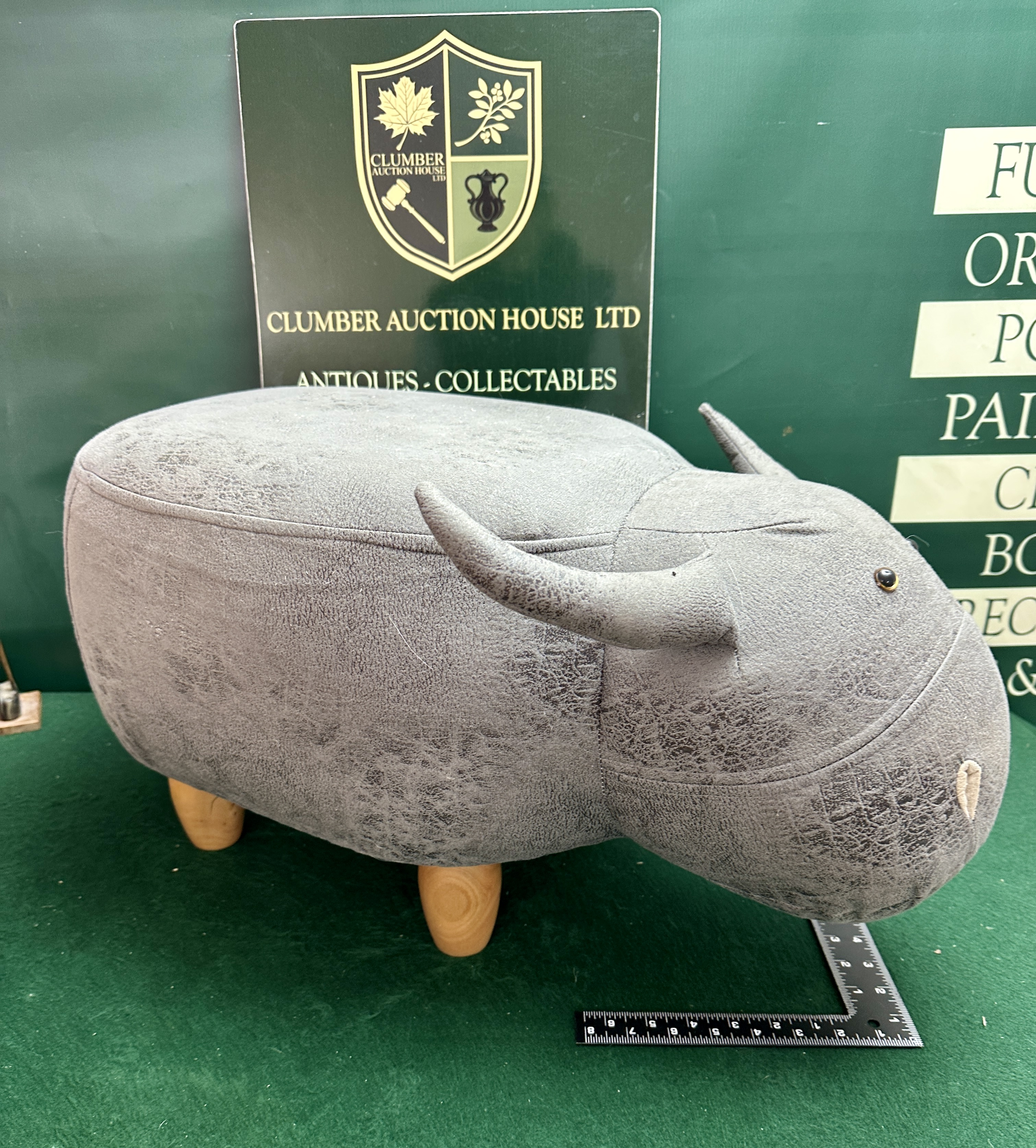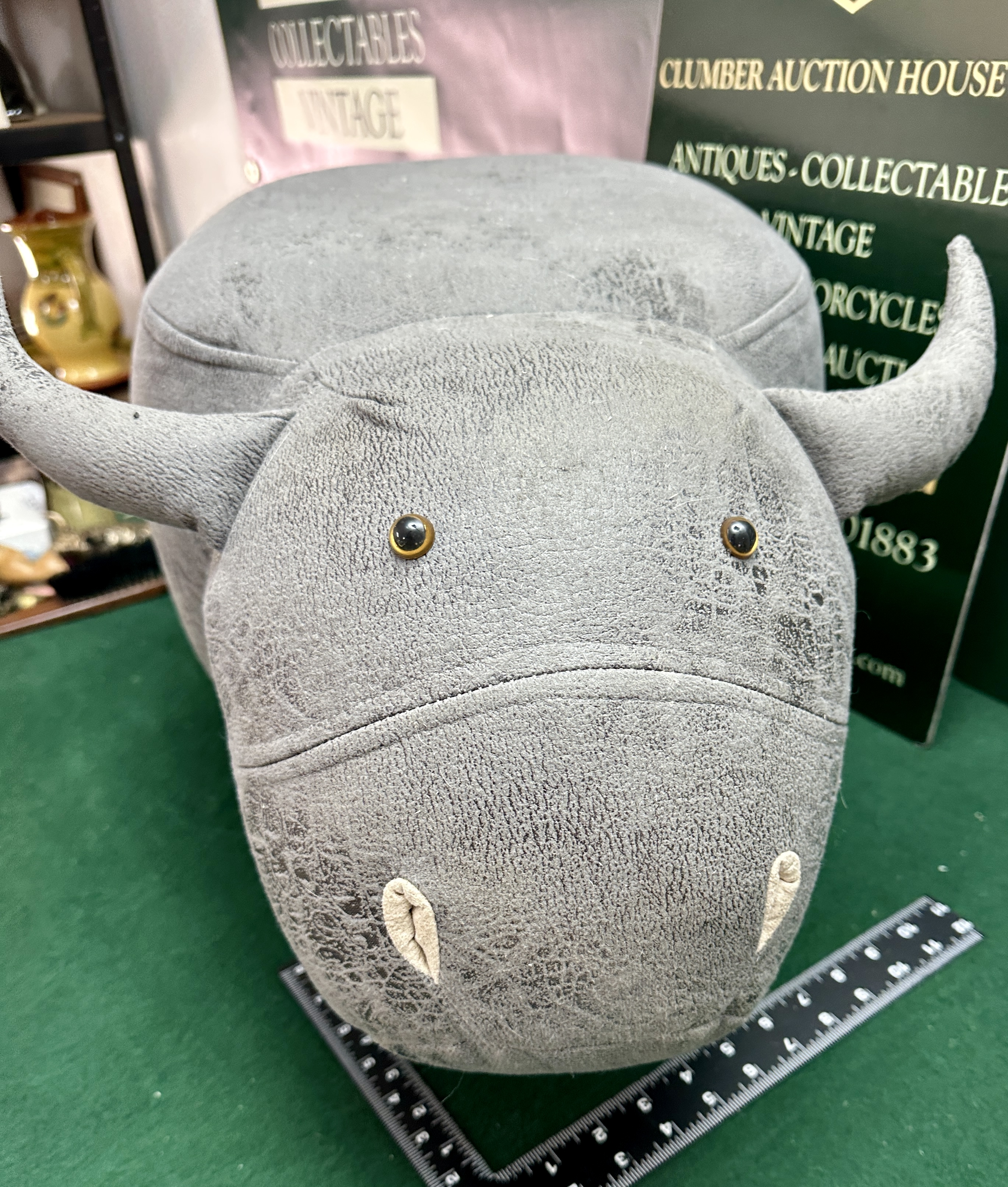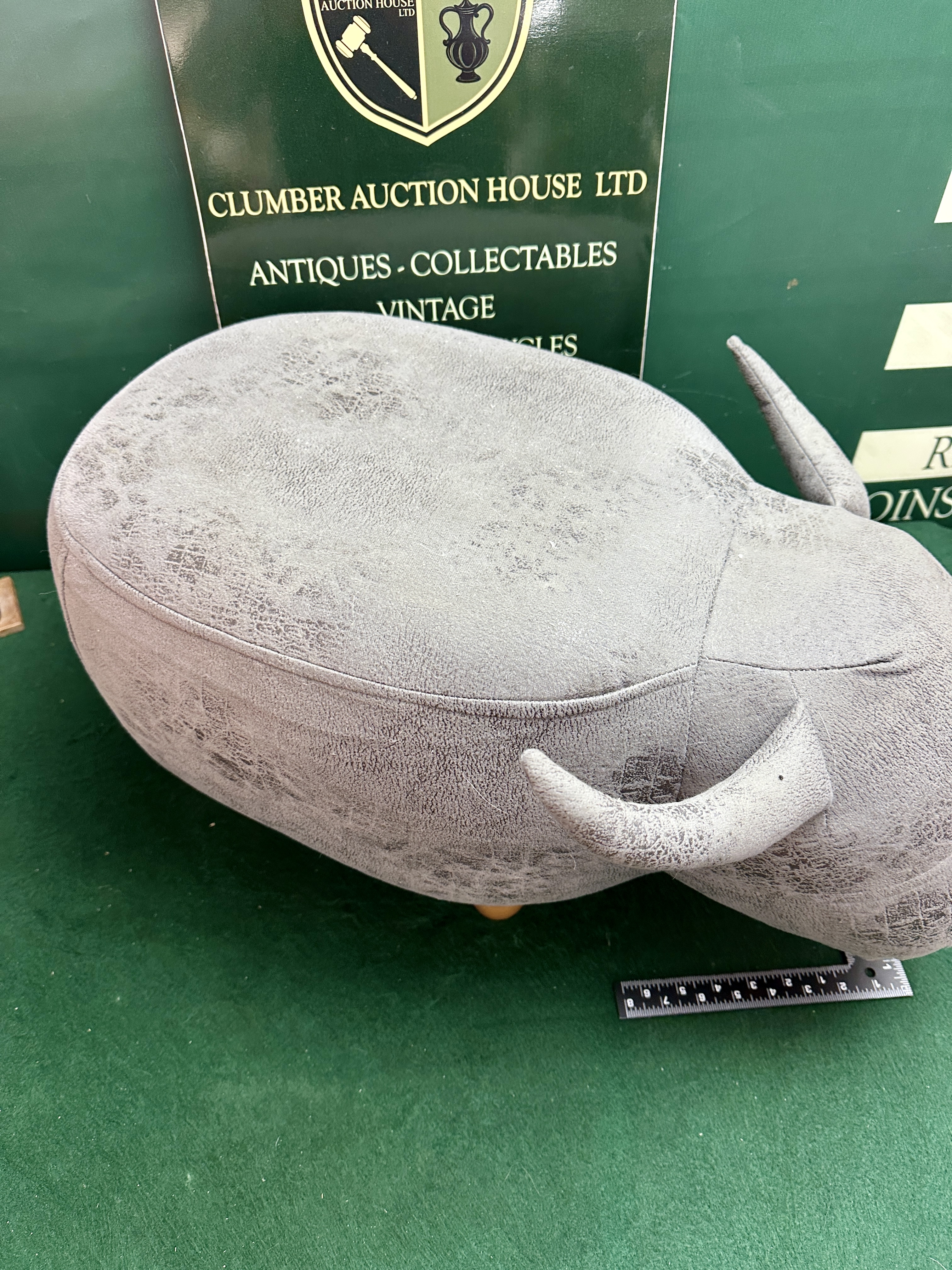 A contemporary footstool or ottoman designed in the form of a bull, similar to designs by Wayuto and Homcom. The piece is upholstered in a grey faux-leather synthetic fabric featuring a distressed and textured finish. Design elements include stuffed protruding horns, small inset dark bead eyes, and stitched detailing to the snout. The stool is built upon an internal frame with foam padding and is supported by four short, tapered, and turned wooden peg legs of a light-toned hardwood.