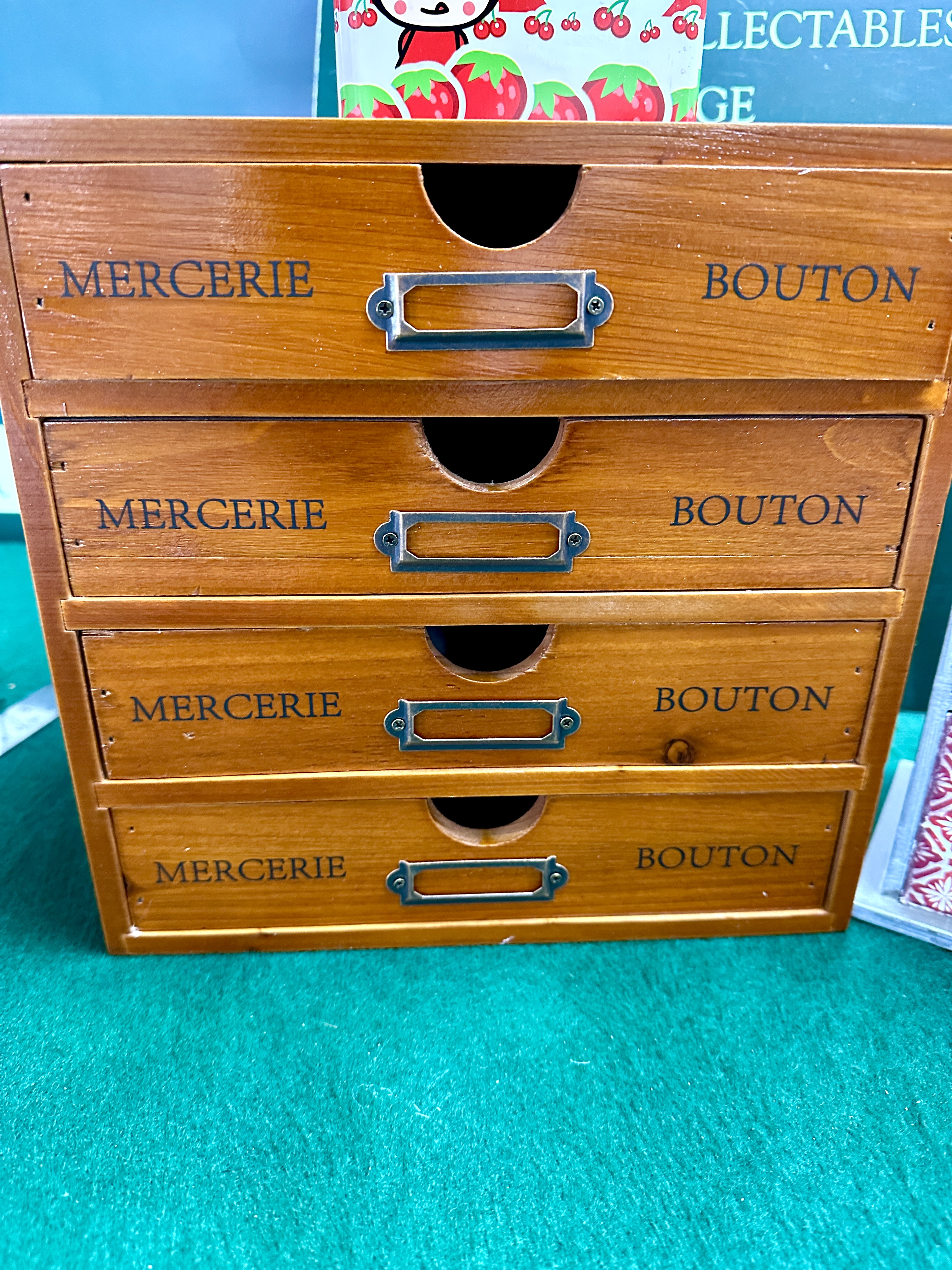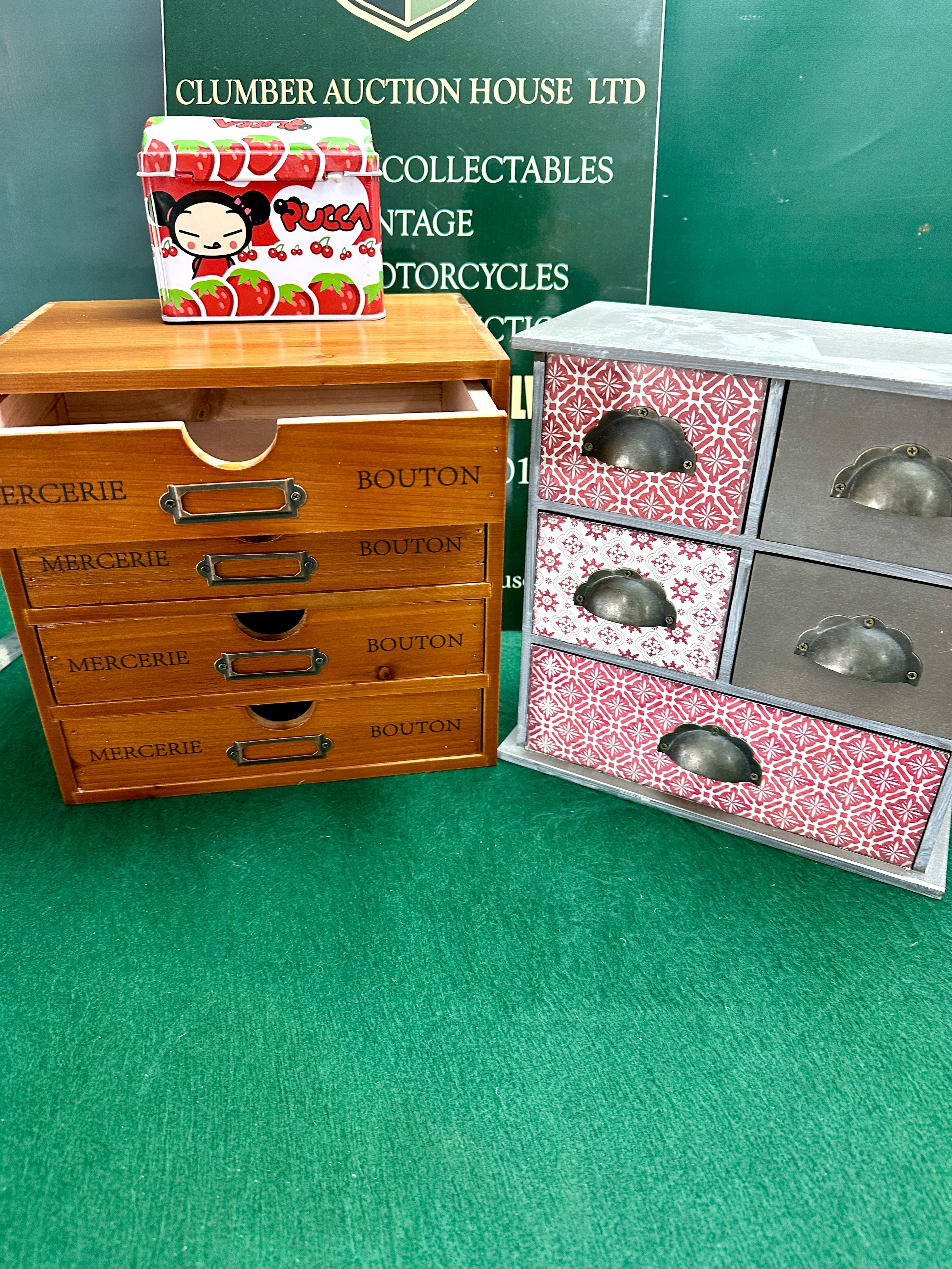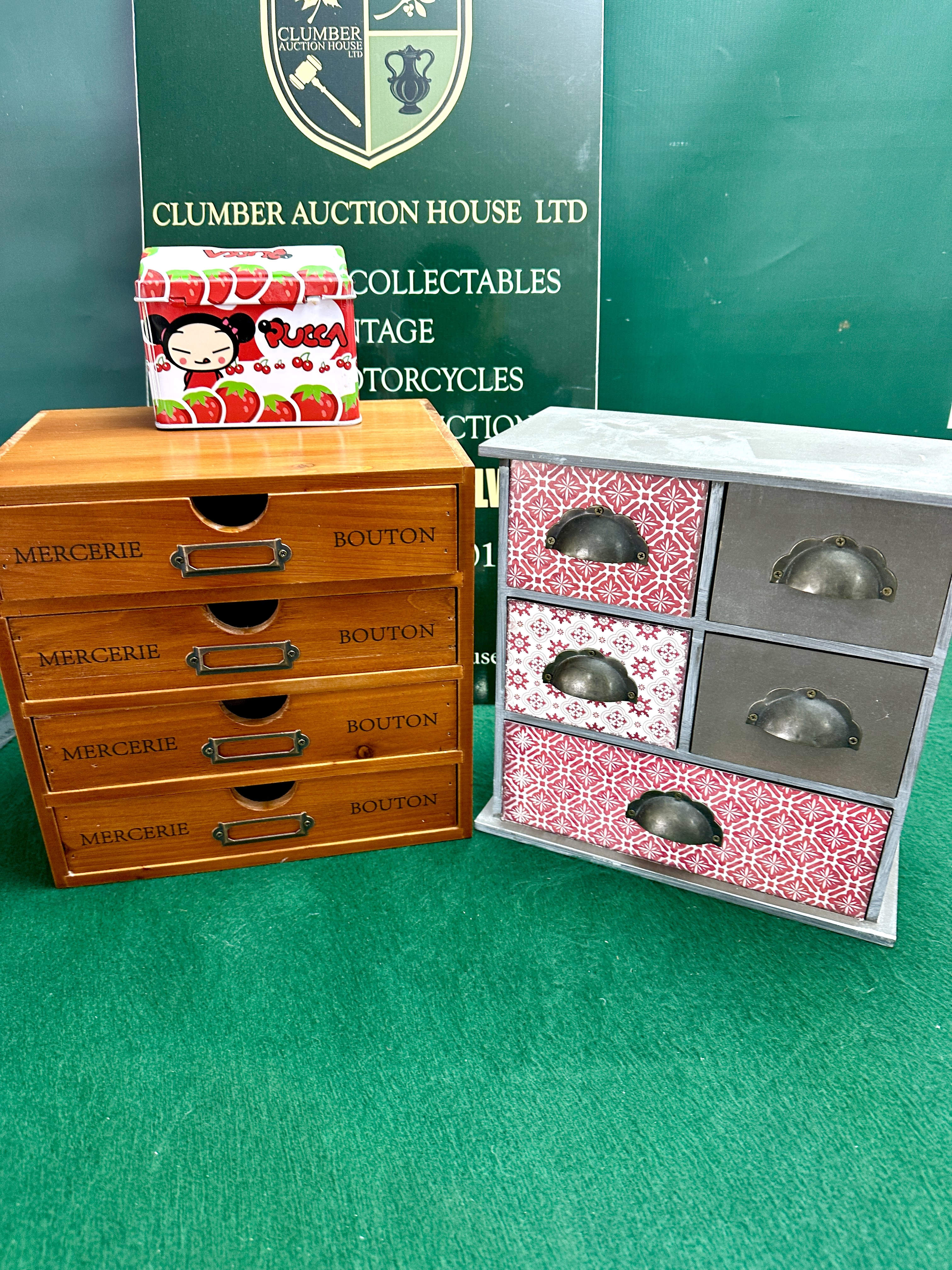 A trio of tabletop storage items comprising two wooden drawer units and a metal tin. The first is a four-drawer wooden chest with a warm-stained finish, featuring metal card-holder pulls and the printed words MERCERIE and BOUTON on each drawer front. The second is a five-drawer wooden unit with a grey-painted frame, featuring three drawers with red and white geometric patterned fronts and two with plain grey fronts, all fitted with metal shell-style cup pulls. The lot is completed by a small rectangular metal tin decorated with the Pucca character and various fruit motifs. These items are of modern manufacture, designed in a vintage or apothecary style.