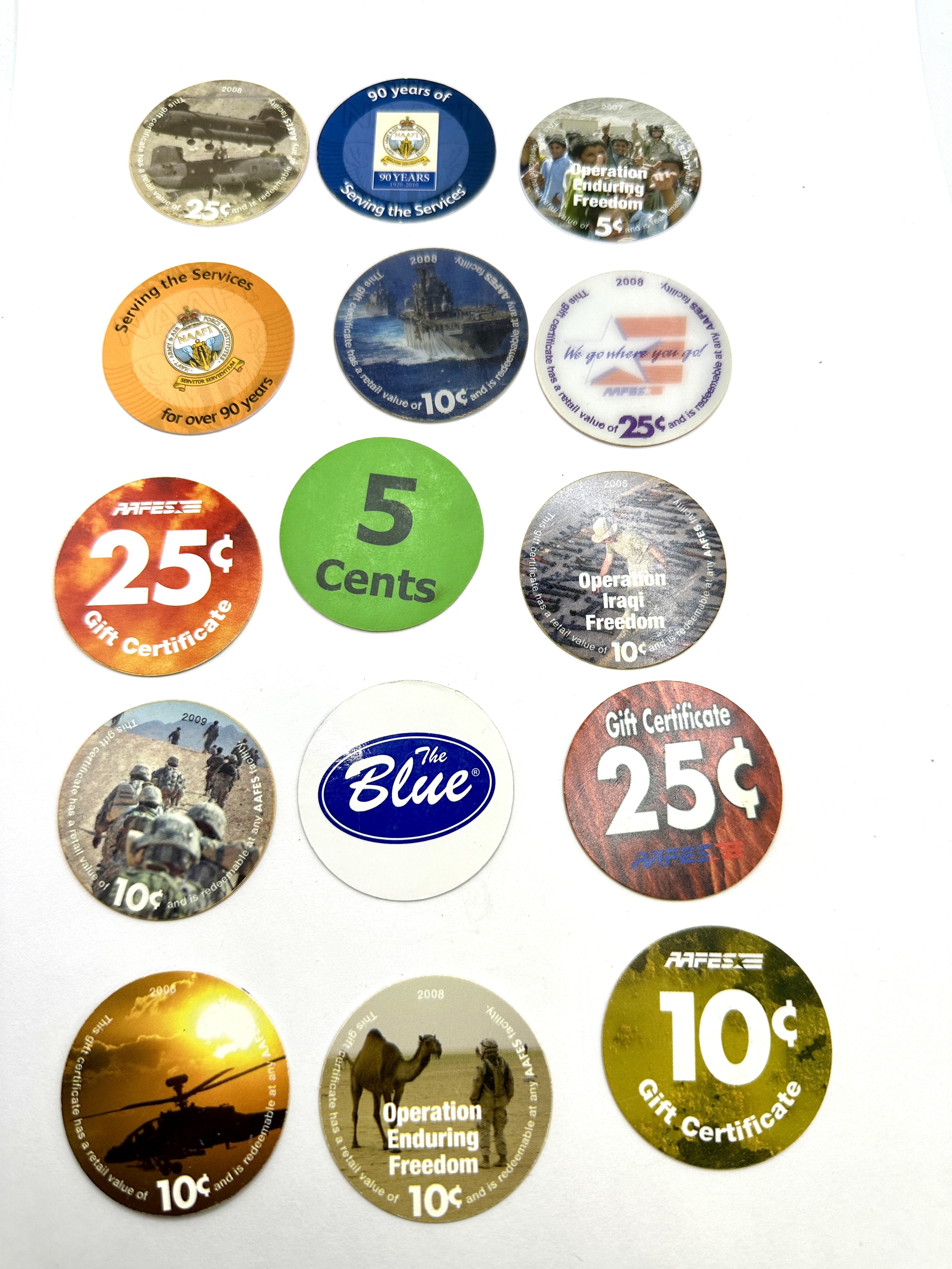 A collection of fifteen military gift certificate tokens, colloquially known as pogs, issued by the United States Army and Air Force Exchange Service (AAFES) and the United Kingdom Navy, Army and Air Force Institutes (NAAFI). These printed cardstock tokens were utilised as small-change currency in military exchange facilities during overseas deployments in the early 21st century. The group includes denominations of 5 cents, 10 cents, and 25 cents. The designs feature various military themes associated with the War on Terror, including Operation Iraqi Freedom and Operation Enduring Freedom. Visual imagery includes Apache and Chinook helicopters, naval vessels, soldiers in desert environments, and various camouflage patterns. Several tokens commemorate the 90th anniversary of the NAAFI with the dates 1920-2010. Specific years printed on the tokens include 2003, 2006, 2007, 2008, and 2009. One token features branding for The Blue.