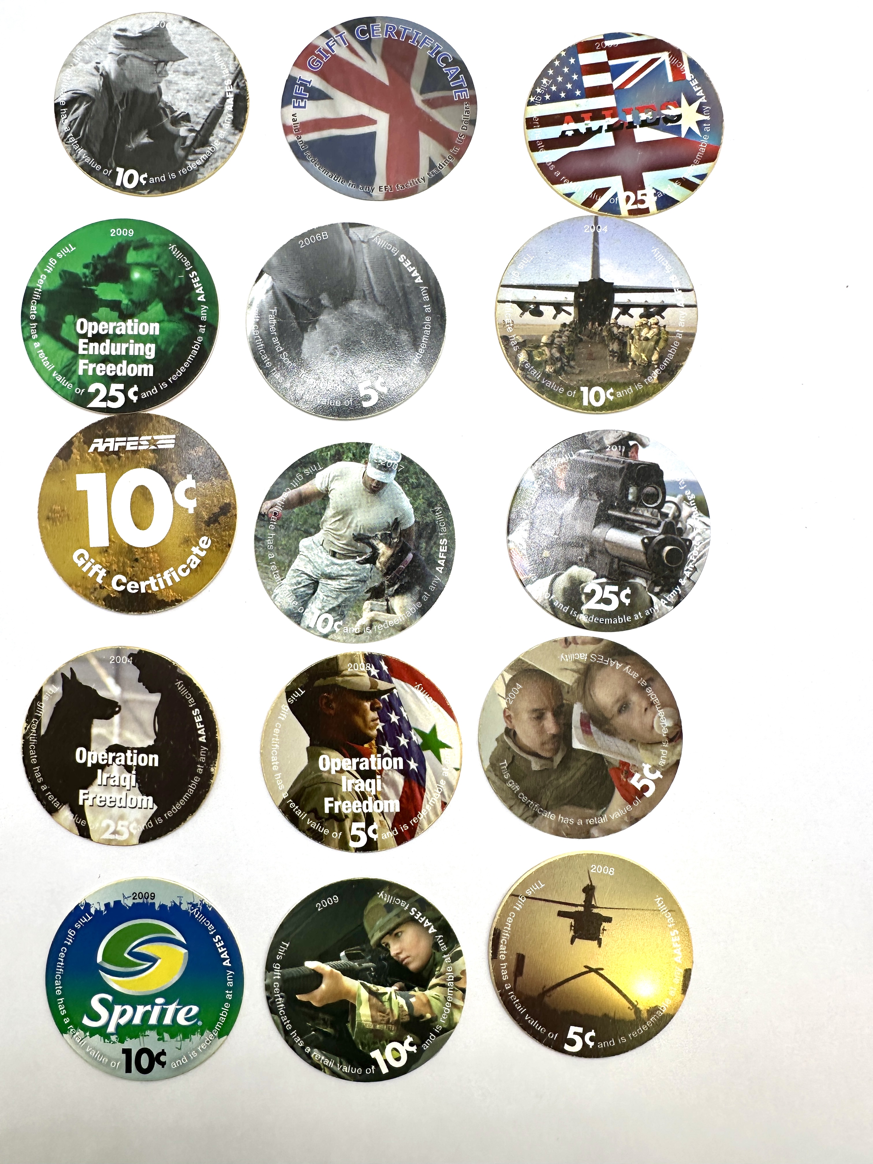 A collection of fifteen military gift certificate tokens, commonly referred to as POGs, issued by the Army & Air Force Exchange Service (AAFES) and the Expeditionary Forces Institute (EFI). These tokens were produced from printed card and used as a substitute for metal coinage in overseas military exchanges. The assortment includes various denominations of 5¢, 10¢, and 25¢, with dates ranging from 2004 to 2011. The designs feature a variety of military-themed imagery, including soldiers in night vision gear, helicopters, military working dogs, and specific campaign commemoratives for Operation Enduring Freedom and Operation Iraqi Freedom. One token displays a corporate logo for Sprite, and several EFI tokens feature the Union Jack flag and the text Allies. Most tokens bear the inscription this gift certificate has a retail value of and is redeemable at any AAFES facility or similar text for the EFI.