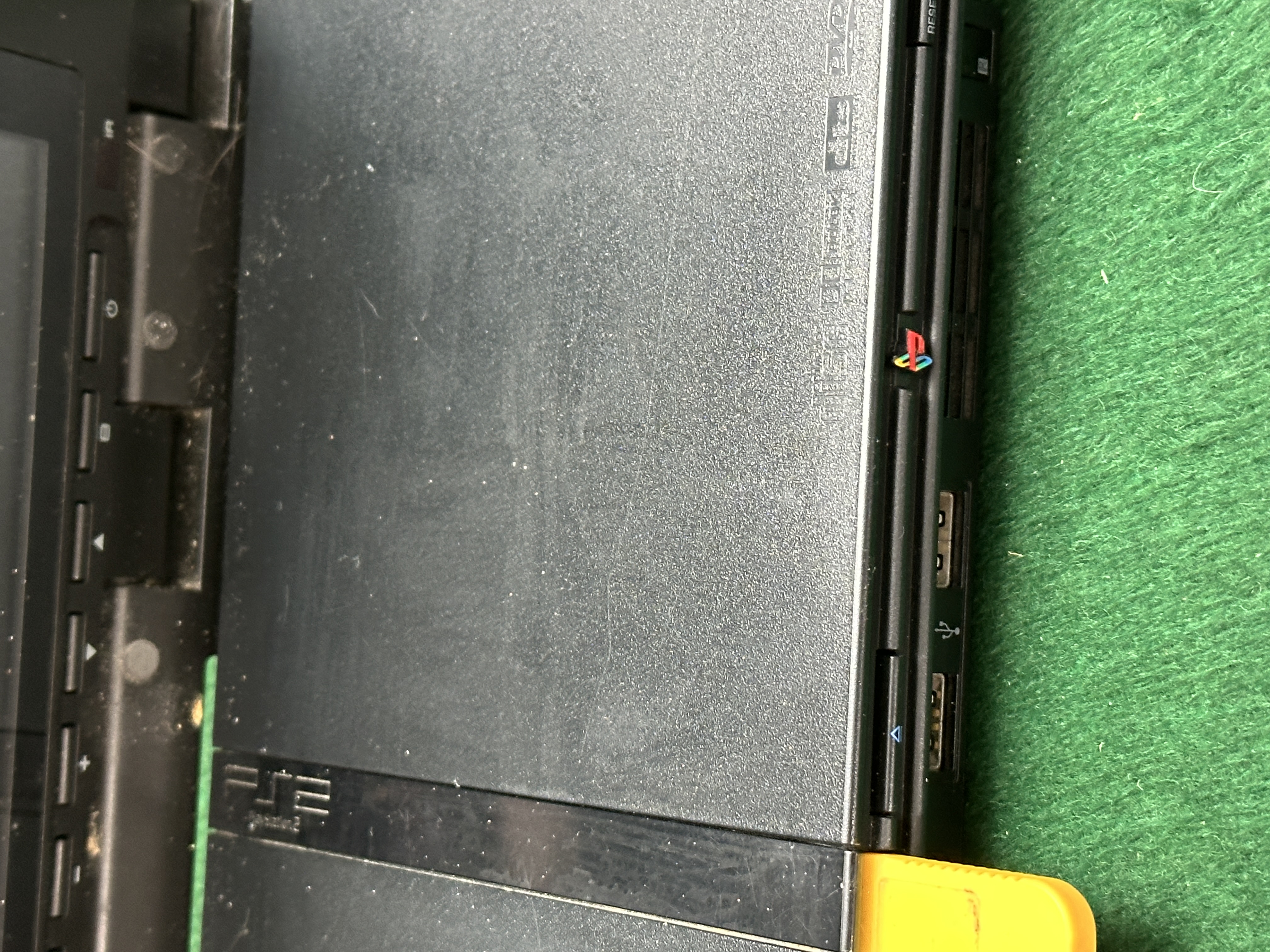 The items are in a used condition showing signs of age and previous handling. Visible dust and minor surface scuffs are present on the console casing and the screen attachment. The original yellow retail box shows significant wear, including creasing, edge rubbing, and small tears to the cardboard flaps. Cables appear in fair condition but are untangled. This lot is sold as seen and has not been tested for power-on status or functional performance.