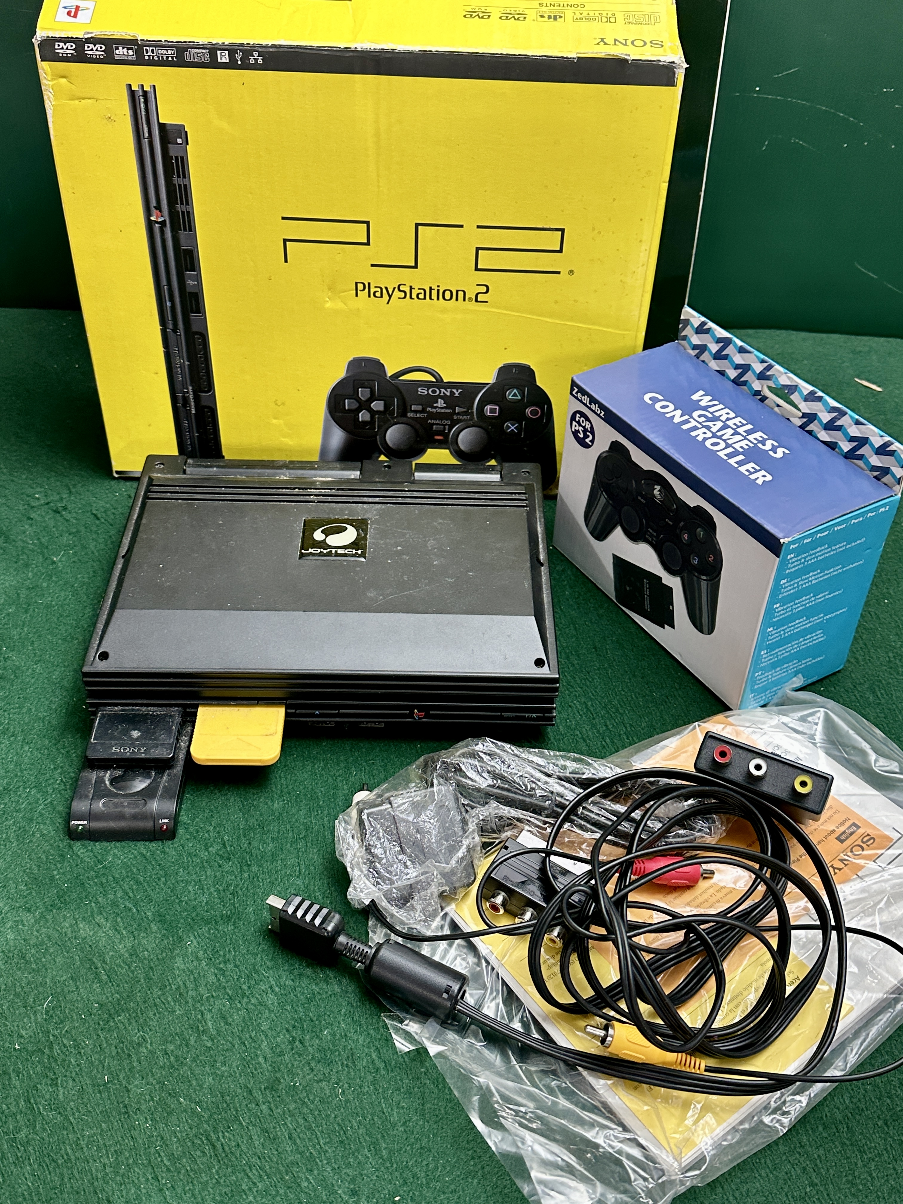 A collection of Sony PlayStation 2 gaming equipment featuring a charcoal black PS2 console fitted with a Joytech integrated flip-up LCD screen attachment. The lot includes the original Sony yellow retail box, a boxed ZedLabz wireless controller with its respective receiver, a Sony branded infrared receiver, and a yellow memory card. Associated peripherals comprise a power supply unit, composite AV cables, a Scart adapter, and original printed instruction manuals. The console unit displays the manufacturer markings Sony and PlayStation 2, while the screen attachment is marked Joytech. The console features two front-facing controller ports and two USB ports. The integrated screen includes built-in speakers and manual control buttons for display adjustments.