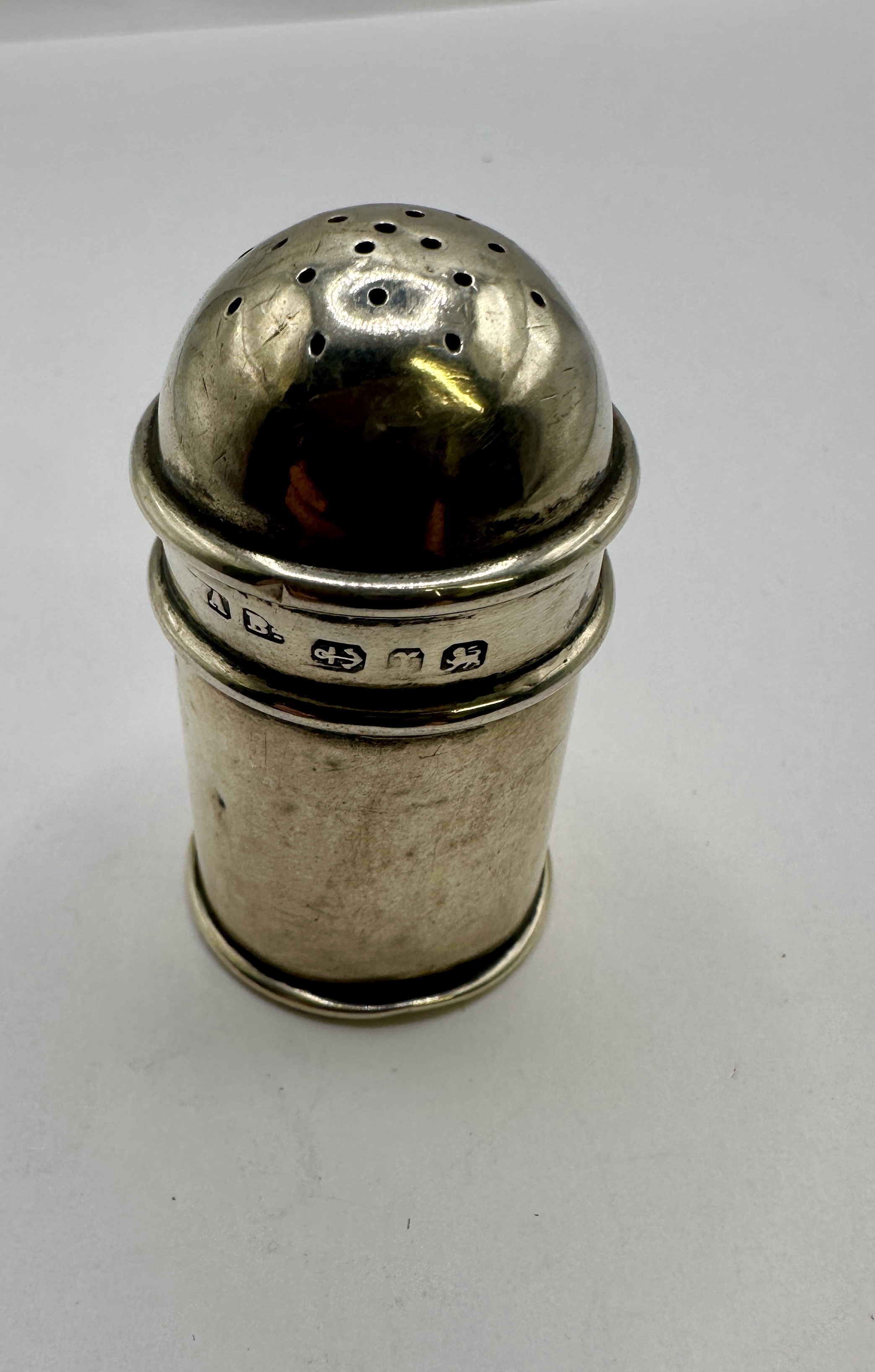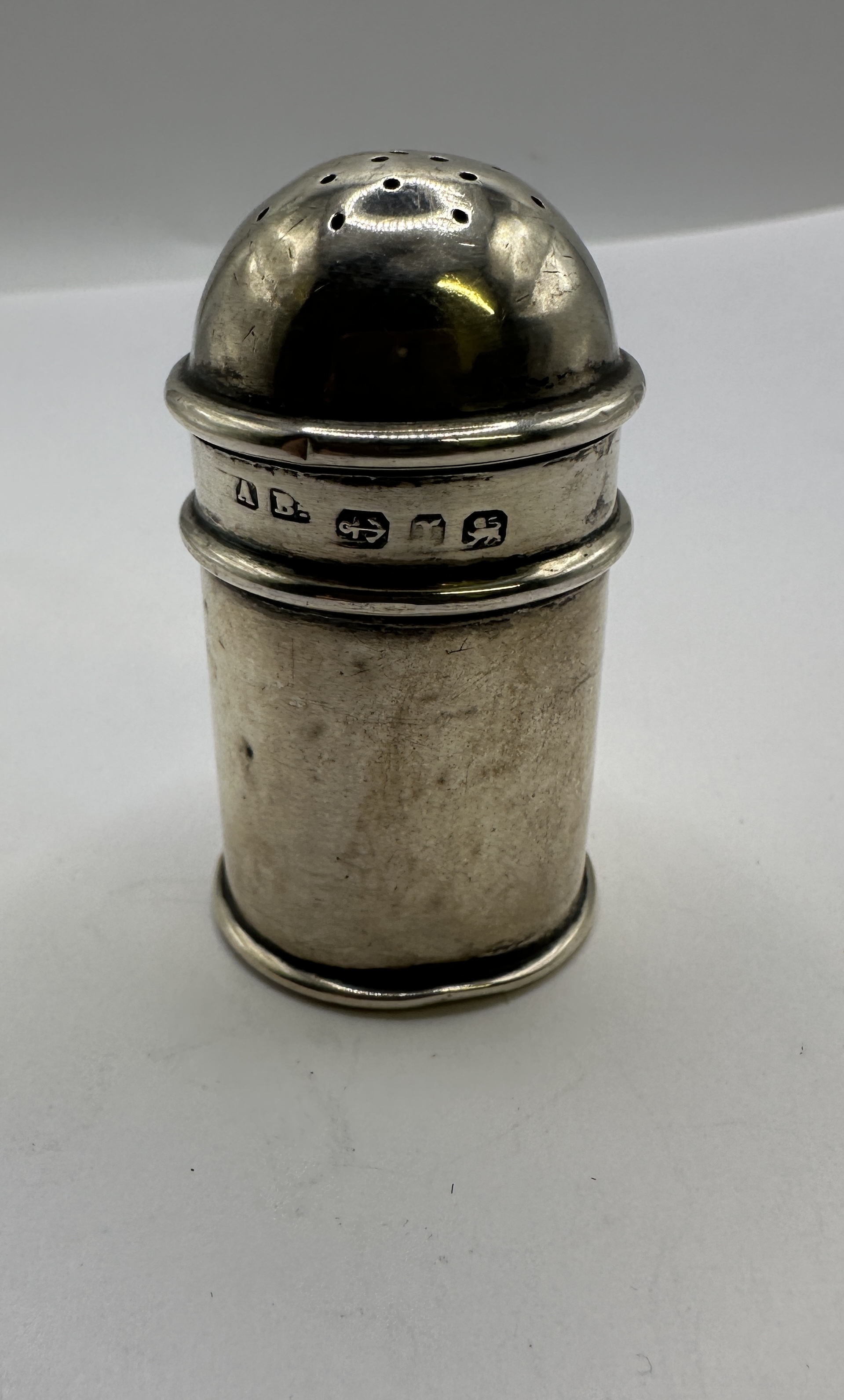 This Edwardian period pepperette is constructed from 925 silver and bears the hallmarks for the Birmingham assay office, dated 1911. The piece is of cylindrical form with a slightly flared base and a domed, pull-off cover featuring circular perforations. Two raised concentric bands encircle the middle of the body, providing a surface for the struck hallmarks. The marks include the maker’s mark A B for Arthur Blackstaffe in separate rectangular cartouches, an anchor assay mark, the lowercase date letter m, and a lion passant.