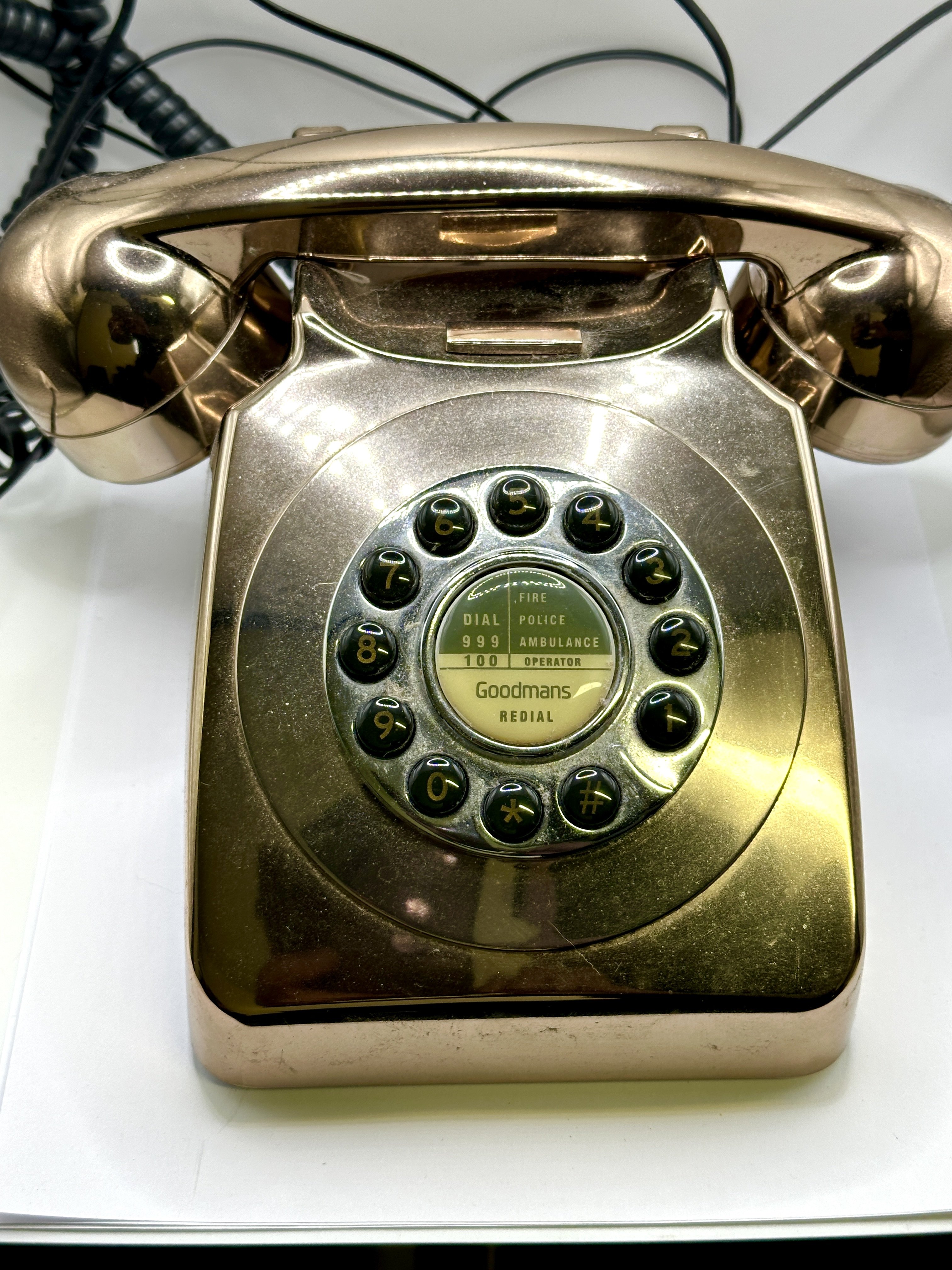 A retro-style corded landline telephone manufactured by Goodmans. The design is based on the classic GPO 746 rotary telephone but incorporates a modern push-button keypad arranged in a circular configuration. The handset and body are constructed from plastic with a polished rose gold or copper-tone metallic finish. The central disc of the dial features the manufacturer’s mark Goodmans along with a redial function. It also displays United Kingdom emergency service information including Fire, Police, and Ambulance on 999 and Operator on 100. The keypad consists of twelve black circular buttons for numerals 0-9 plus star and hash symbols. The unit is fitted with a black coiled handset cord and an integrated telephone line cable.