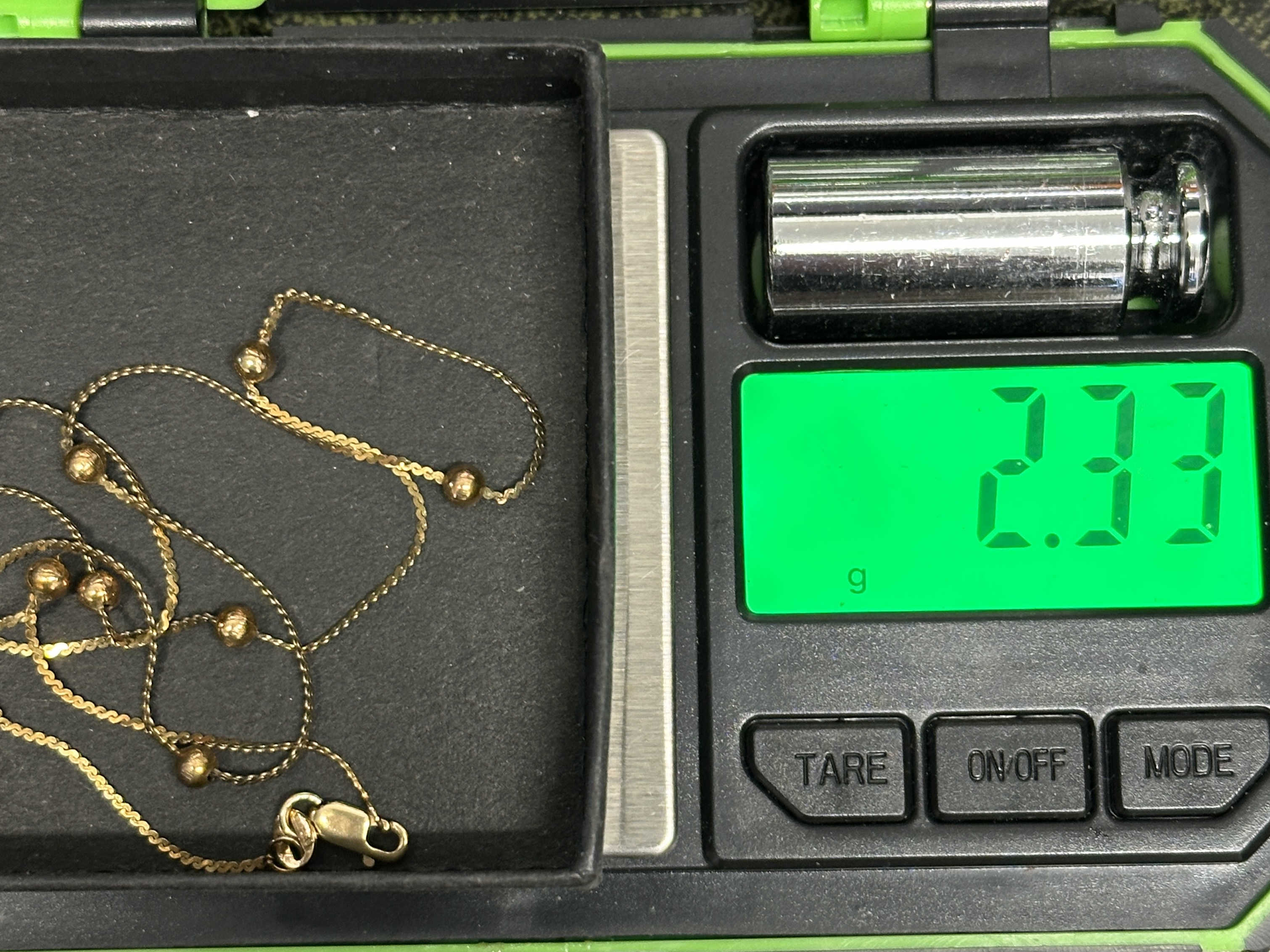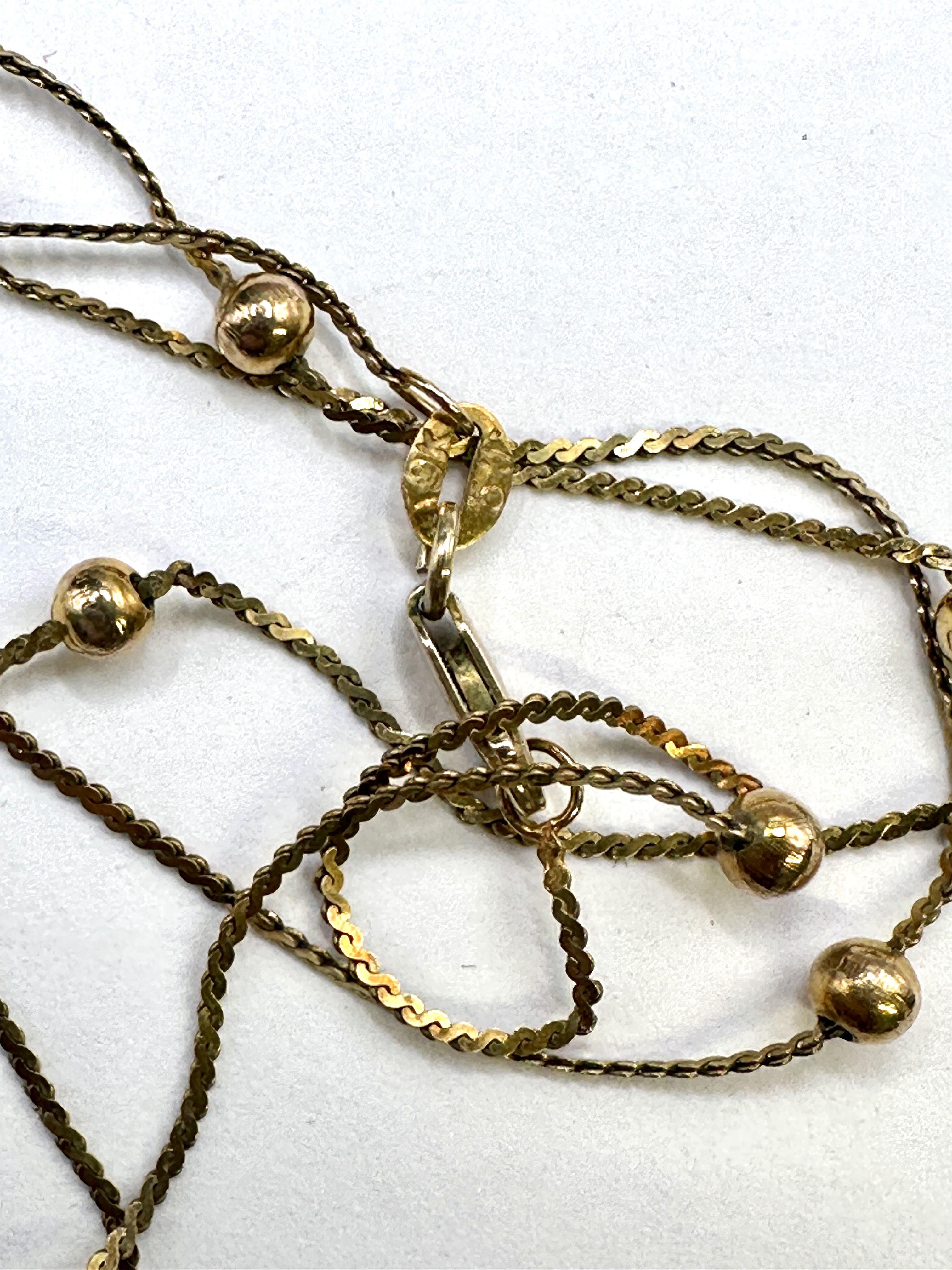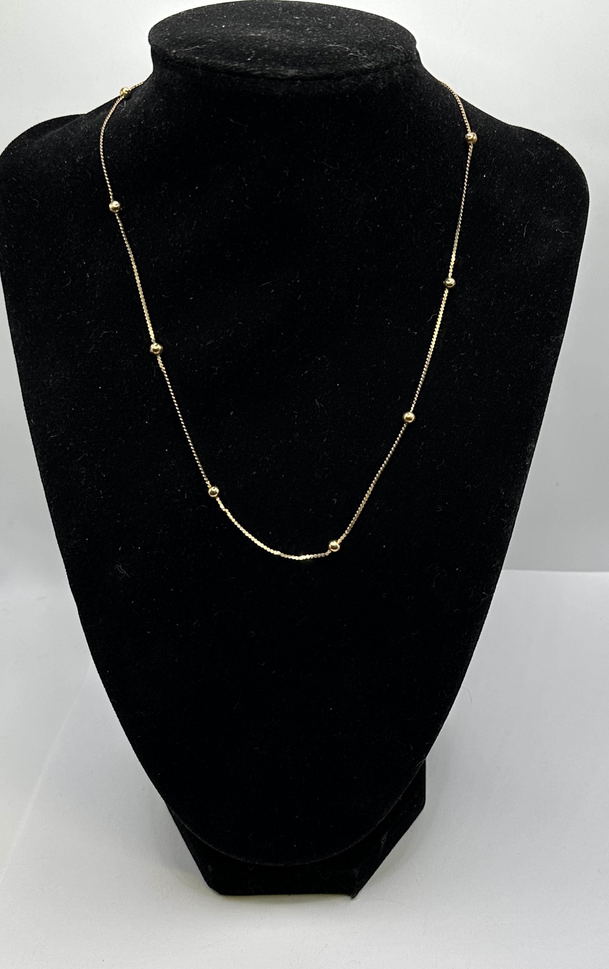 A 9ct yellow gold bead station necklace featuring a delicate ripple-style textured chain. The design incorporates polished spherical gold beads integrated at regular intervals along the length of the chain. The necklace is secured with a lobster claw clasp and features a small oval