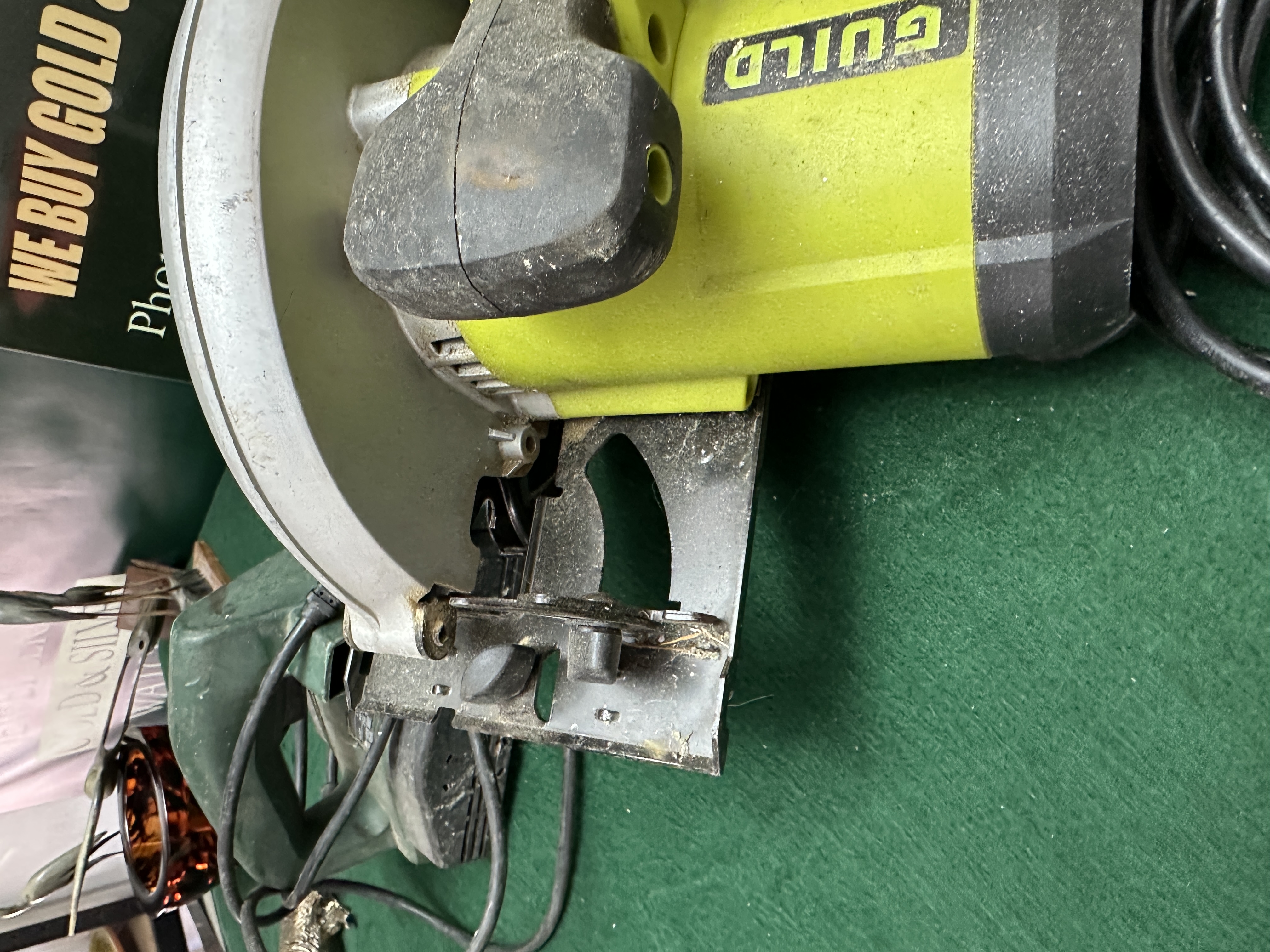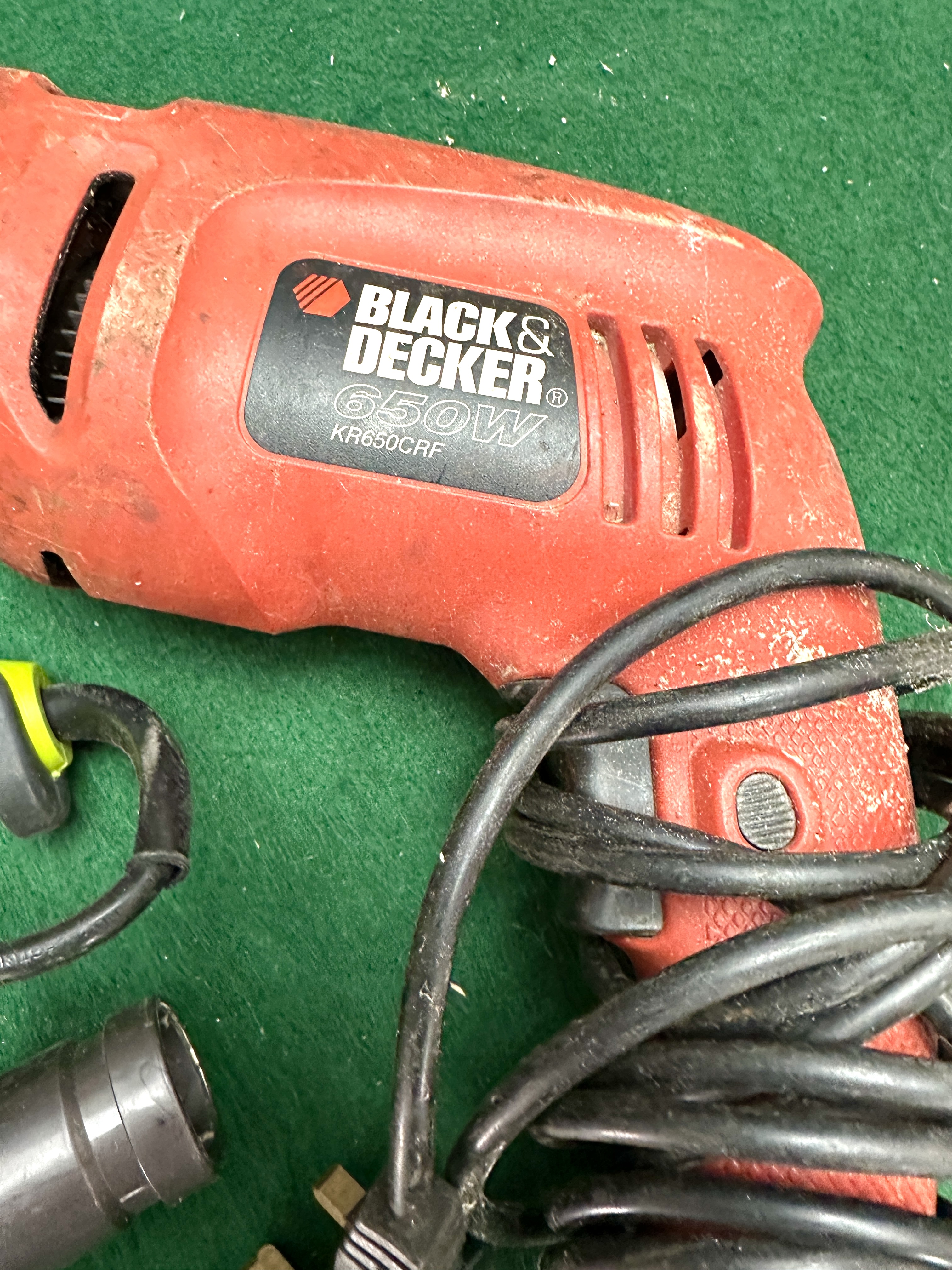 A collection of four corded electric power tools. The assembly includes a Black and Decker KR650CRF corded percussion drill, rated at 650W, featuring a keyed chuck and secondary handle mounting point. Also present is a Guild circular saw, constructed with a lime green and black plastic motor housing, a metal base plate, and a retractable safety guard. The collection further contains a Guild orbital sander with a matching lime green finish and a foam sanding pad, and a Challenge MP2358 corded electric hand planer with a blue plastic body and adjustable depth control. All tools are fitted with integrated power cables and standard UK 3-pin plugs.