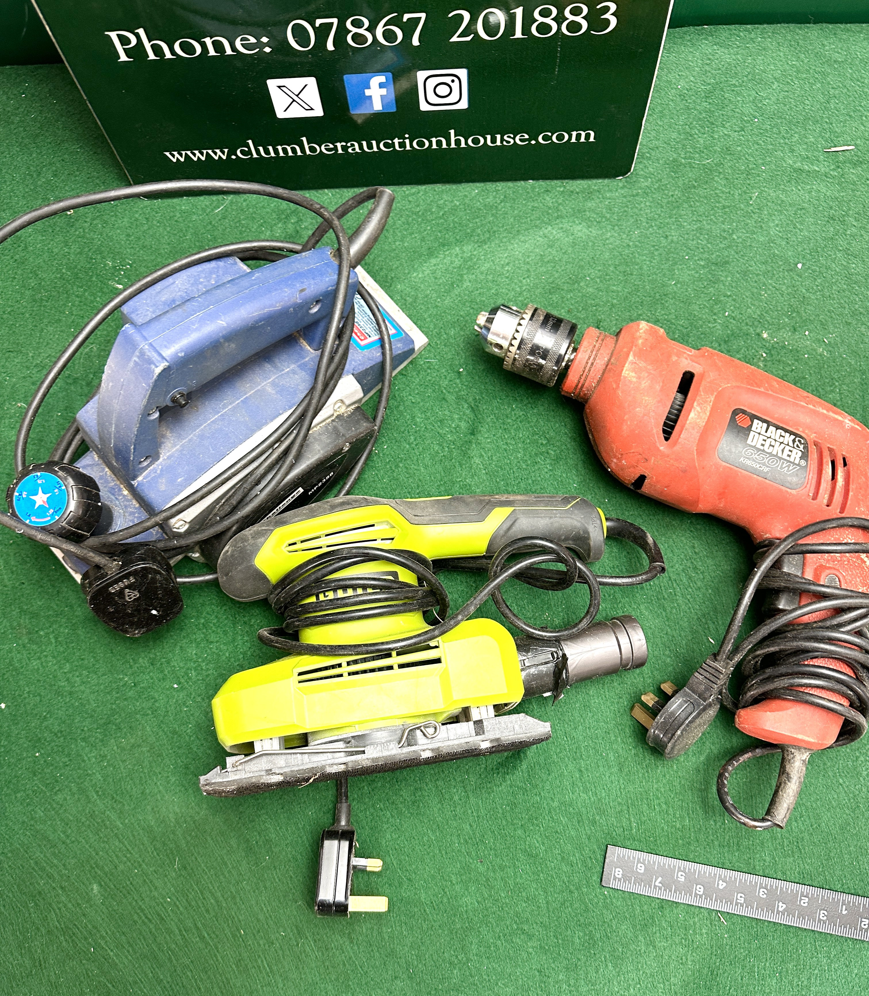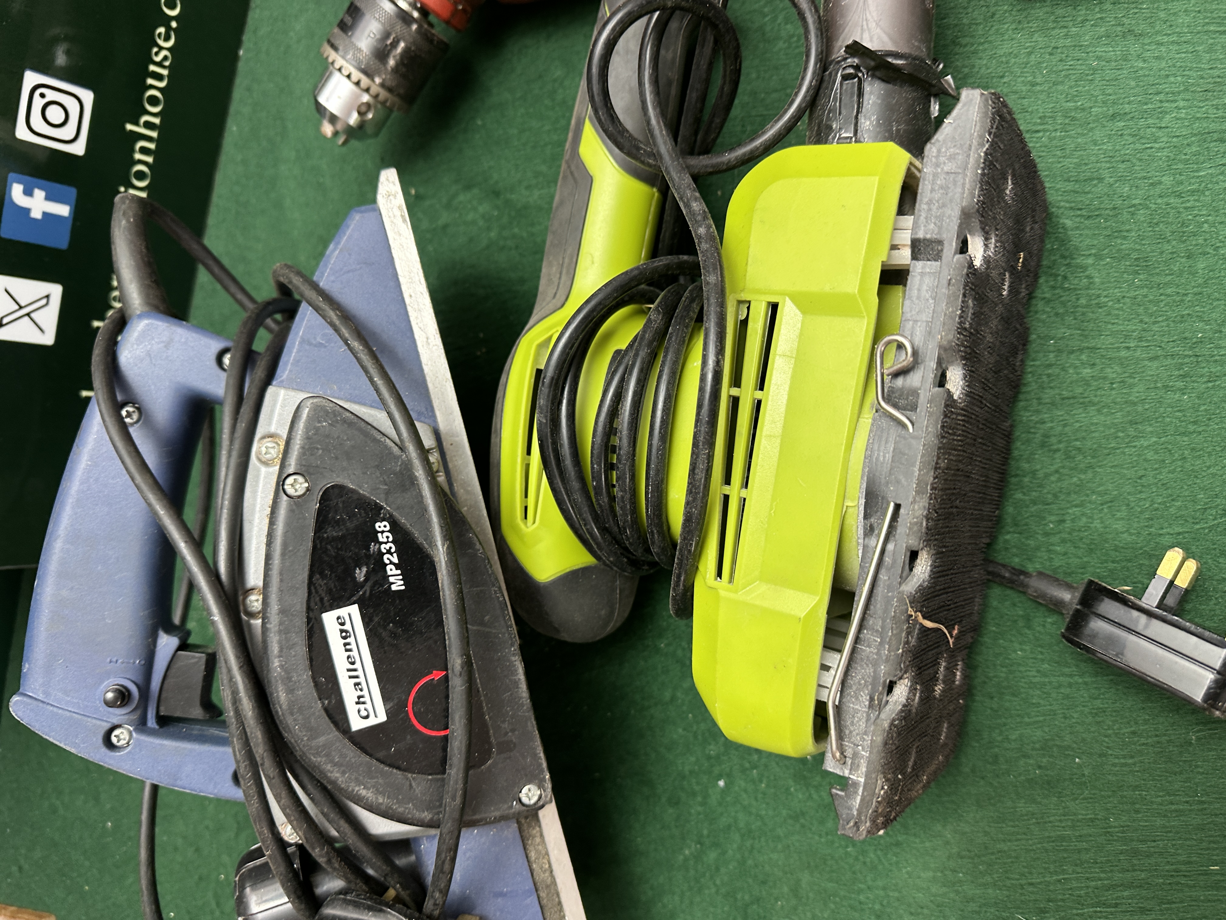 All items are in used condition, displaying signs of regular workshop use including accumulated sawdust, surface scuffs, and general wear to the housings. The sanding pad on the orbital sander appears worn. No chuck key is visible for the drill. All items are untested for electrical safety or functional operation.