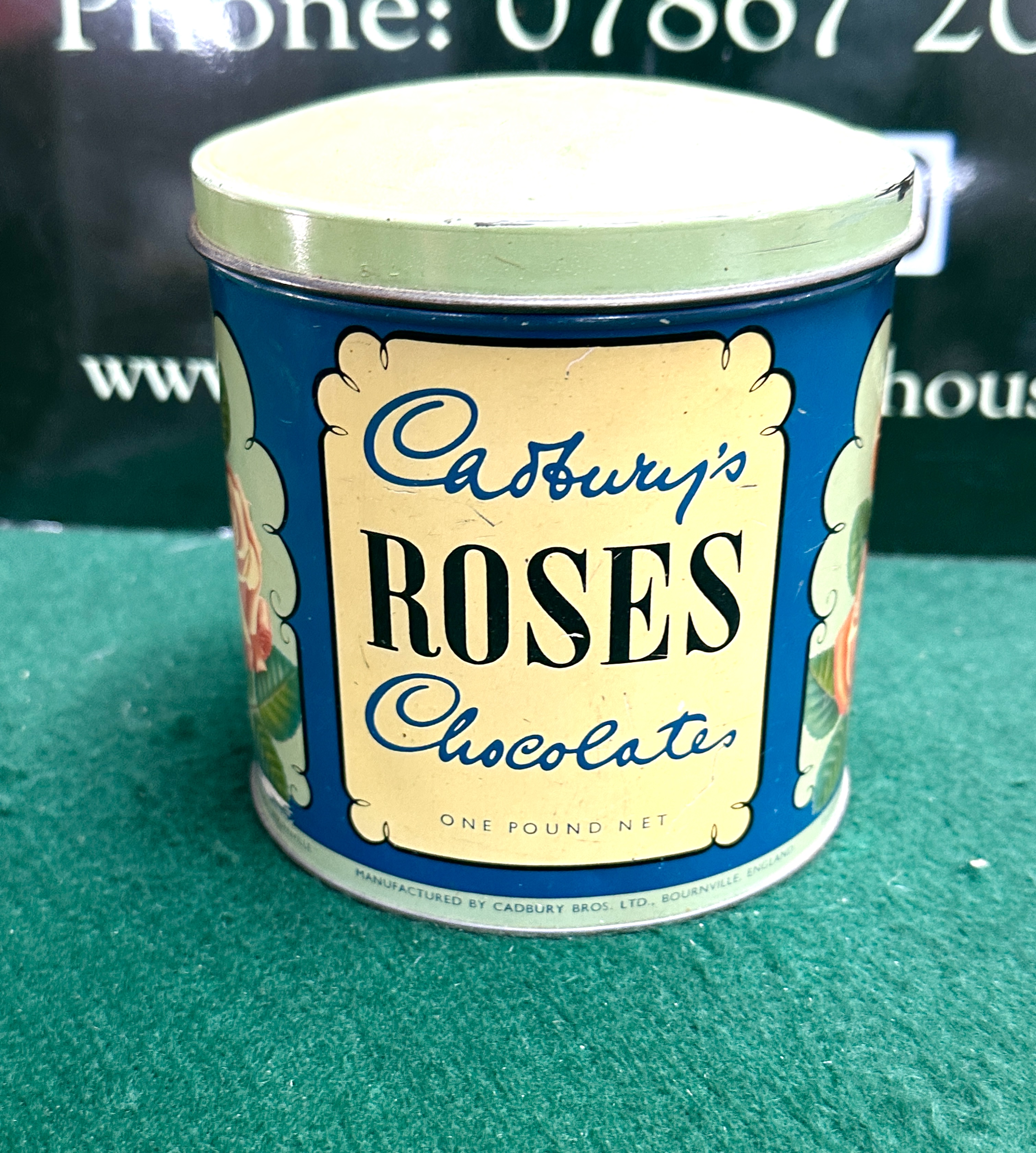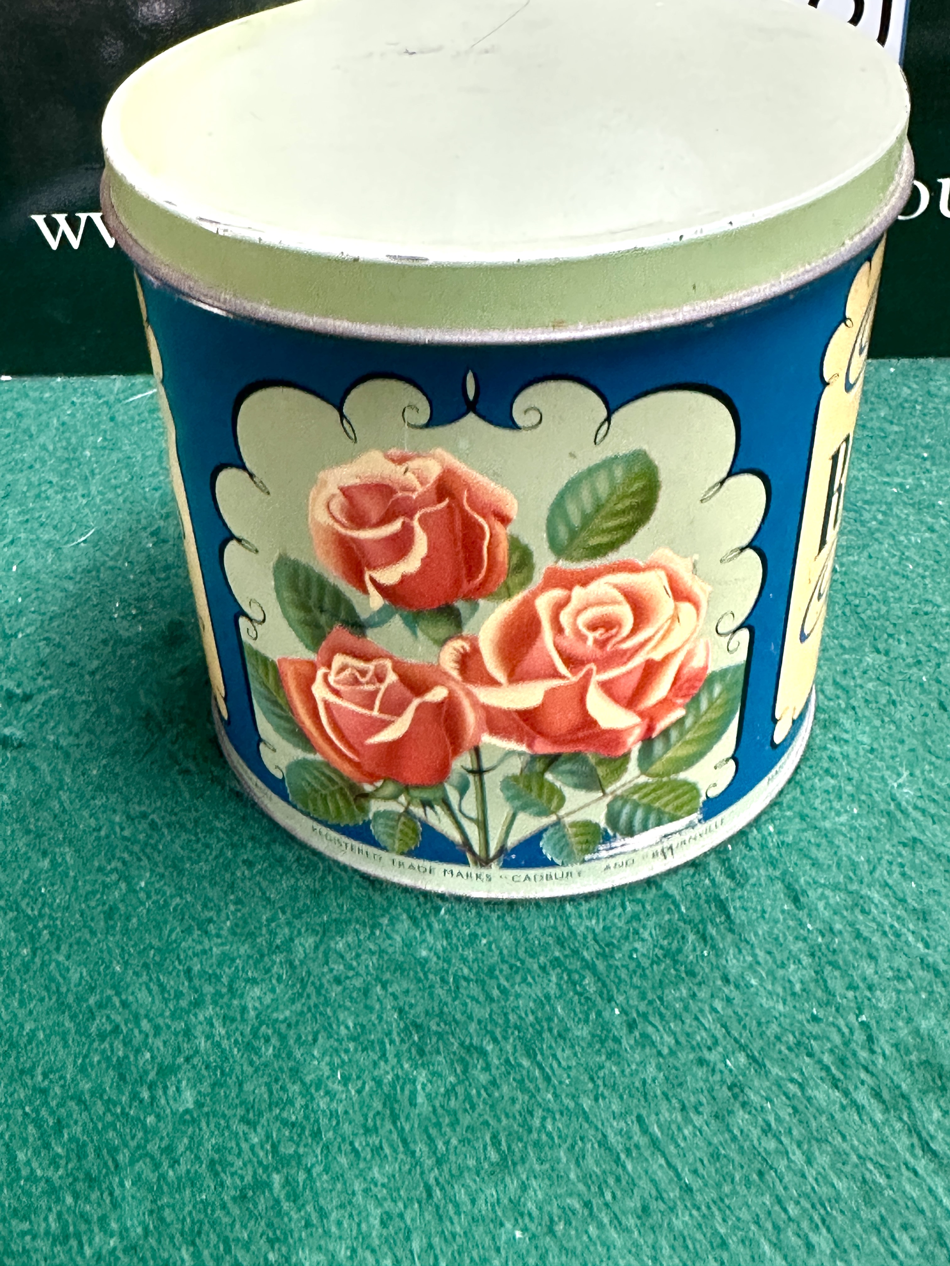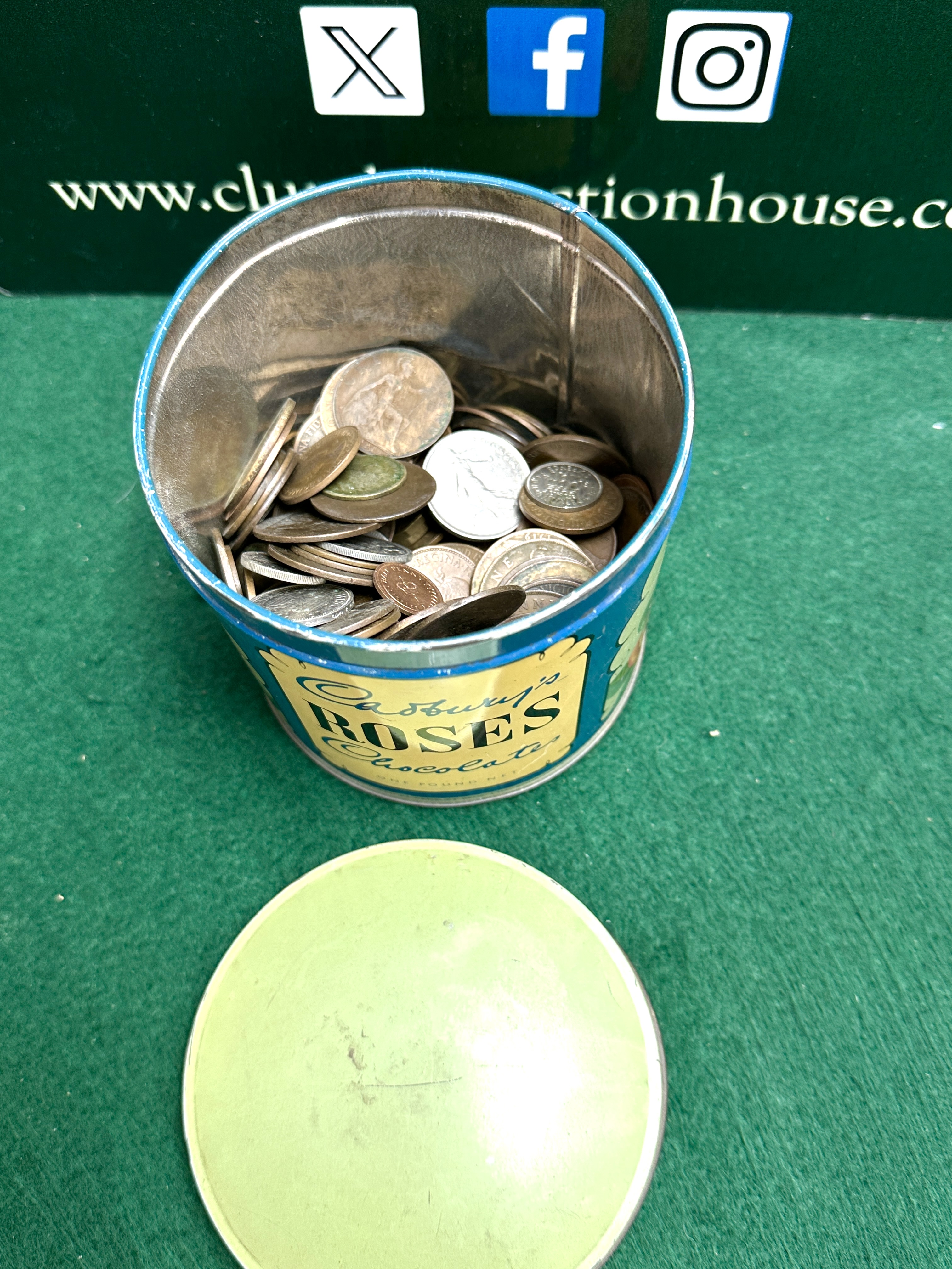 A collection of British and world coins contained within a vintage cylindrical Cadbury’s Roses Chocolate tin. The tin features a blue ground with floral rose illustrations and printed text for Cadbury Bros. Ltd., Bournville, England, with a weight specification of one pound net. The numismatic contents include a variety of British pre-decimal bronze and copper-nickel denominations. Visible specimens include pennies and halfpennies featuring the portraits of Queen Victoria, King George V, and King George VI. International currency includes a West German 1 Deutsche Mark depicting the federal eagle and a French Sower type coin. The collection comprises coins struck in bronze, brass, and copper-nickel alloys from the 19th and 20th centuries.