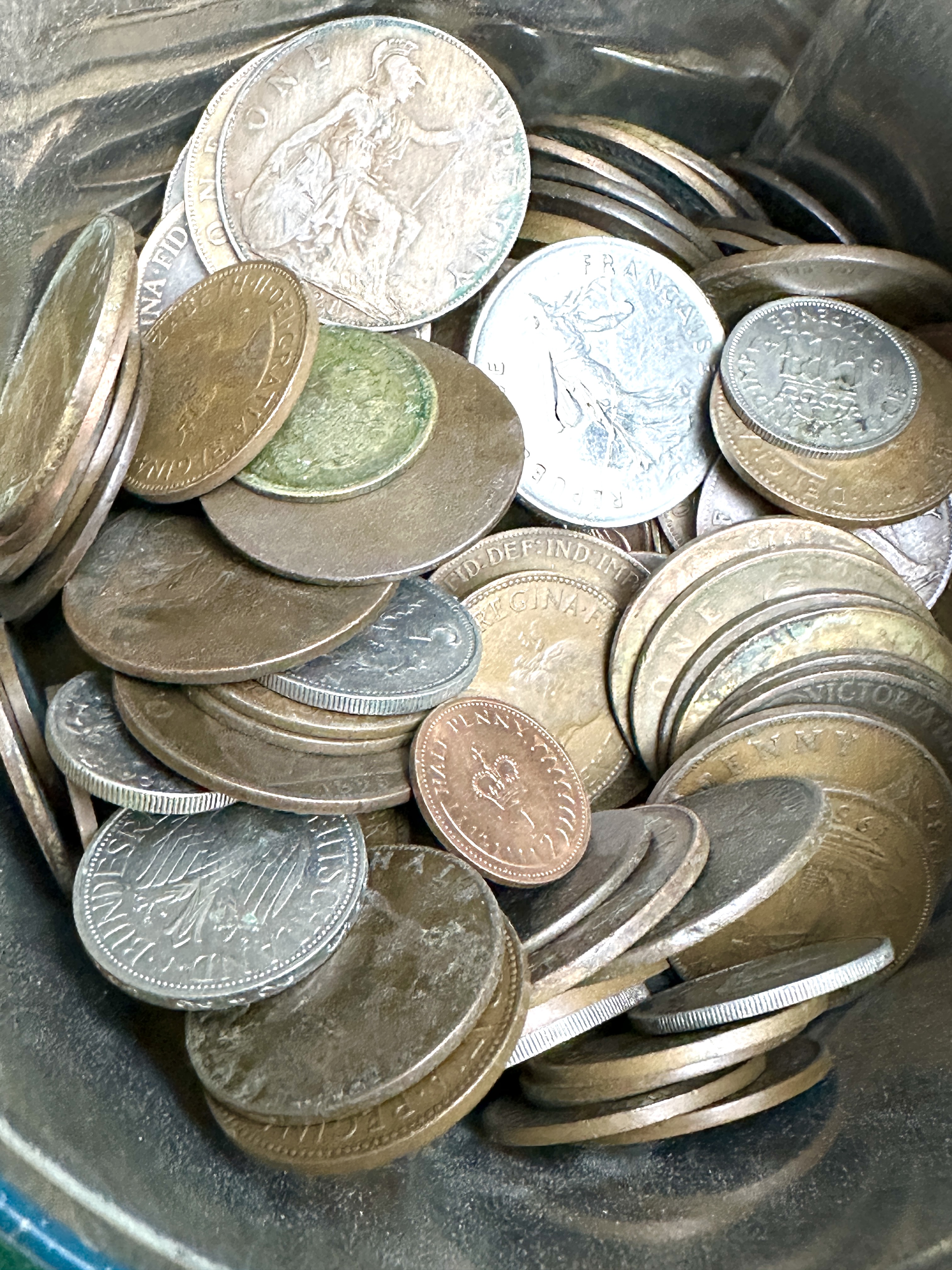 The tin shows light surface scuffing and minor age-related wear to the exterior and interior. The coins are in mixed circulated condition, exhibiting wear from fine to very fine. Visible characteristics include surface toning, contact marks, and areas of oxidation on the bronze specimens. High-point details on older Victorian and Edwardian pieces show significant smoothing.
