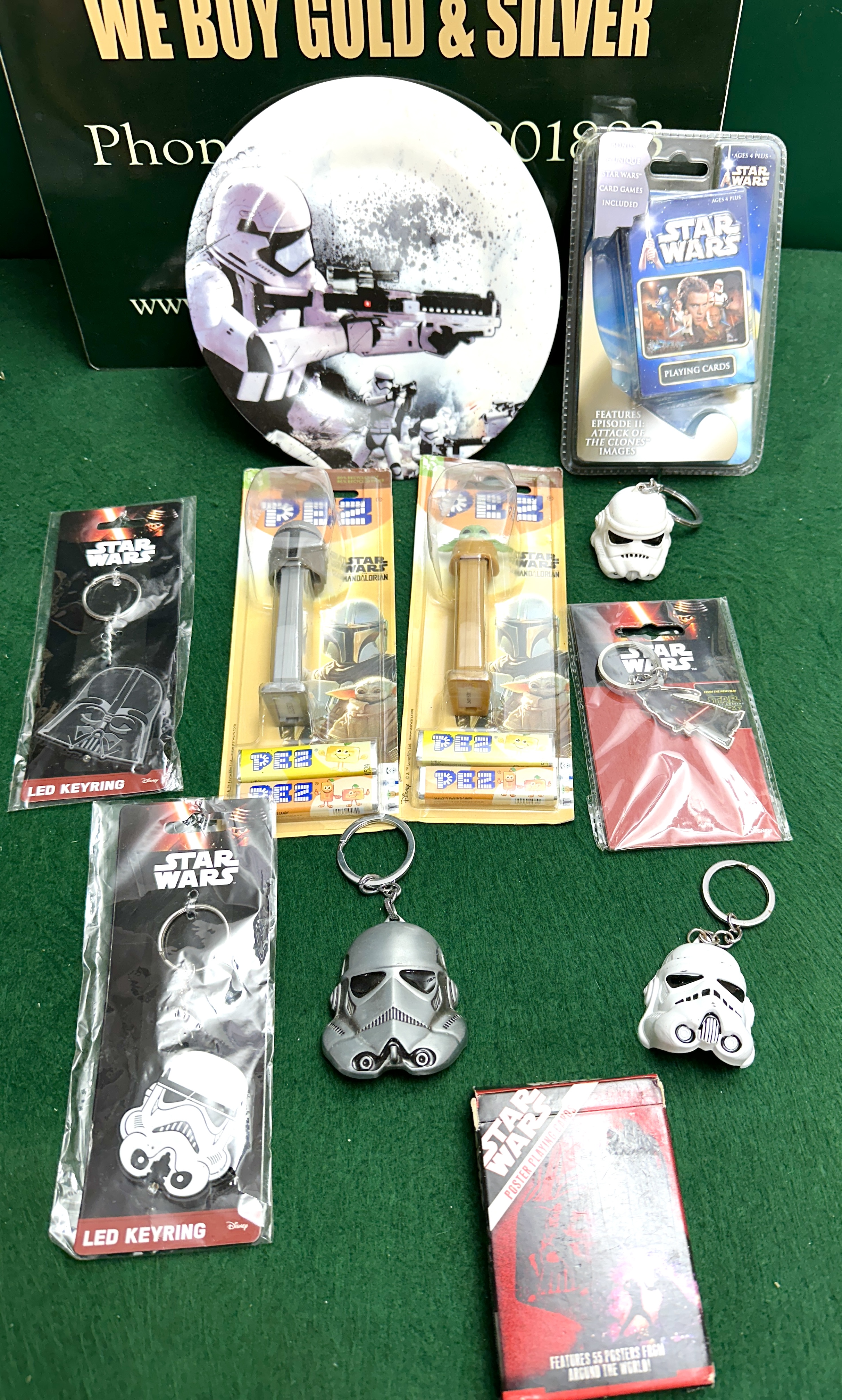 A collection of Star Wars themed items including a decorative plate, playing cards, Pez dispensers, and keyrings.