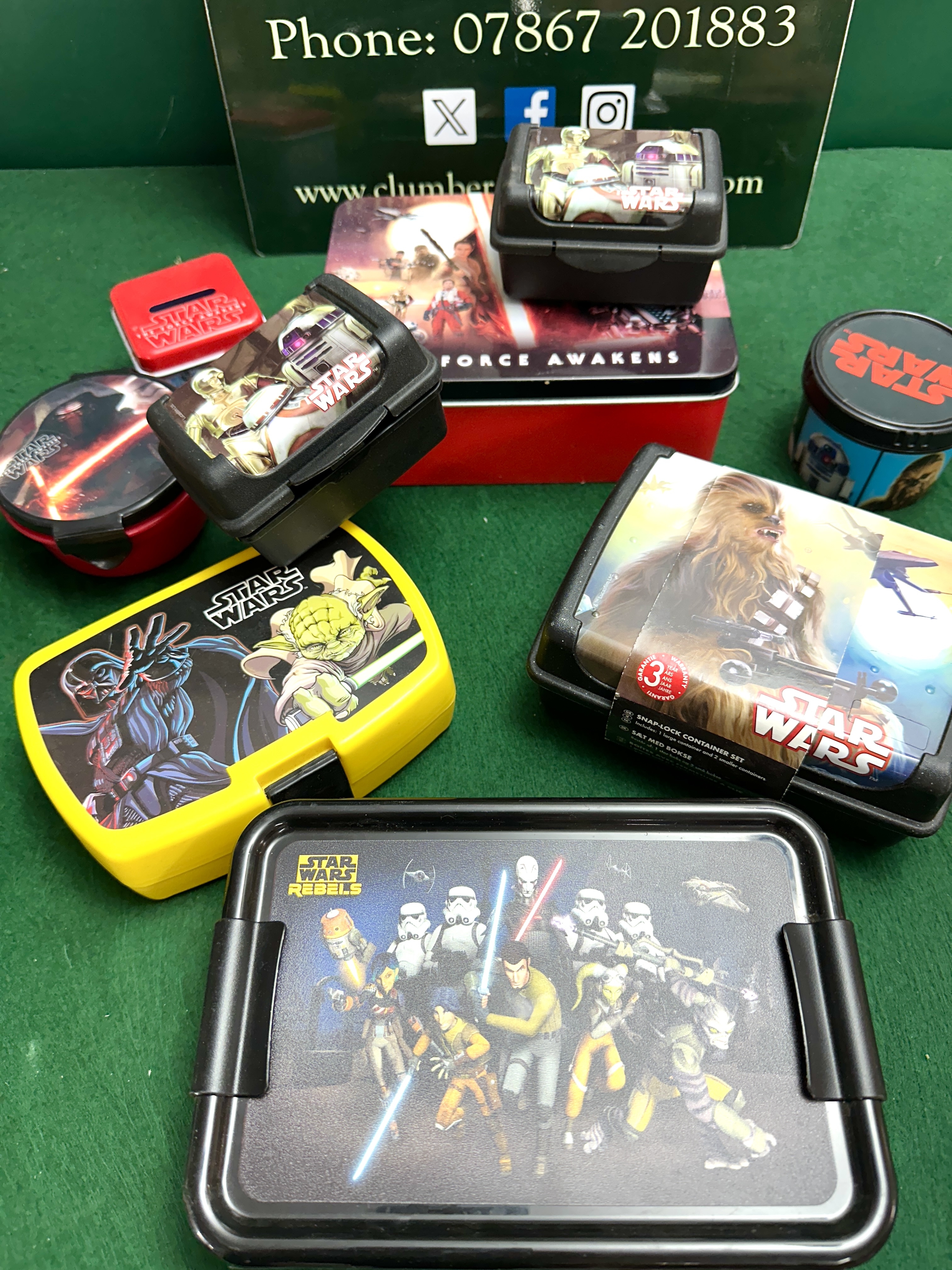 An assortment of licensed Star Wars food storage containers and collectible tins featuring graphics from various entries across the franchise.