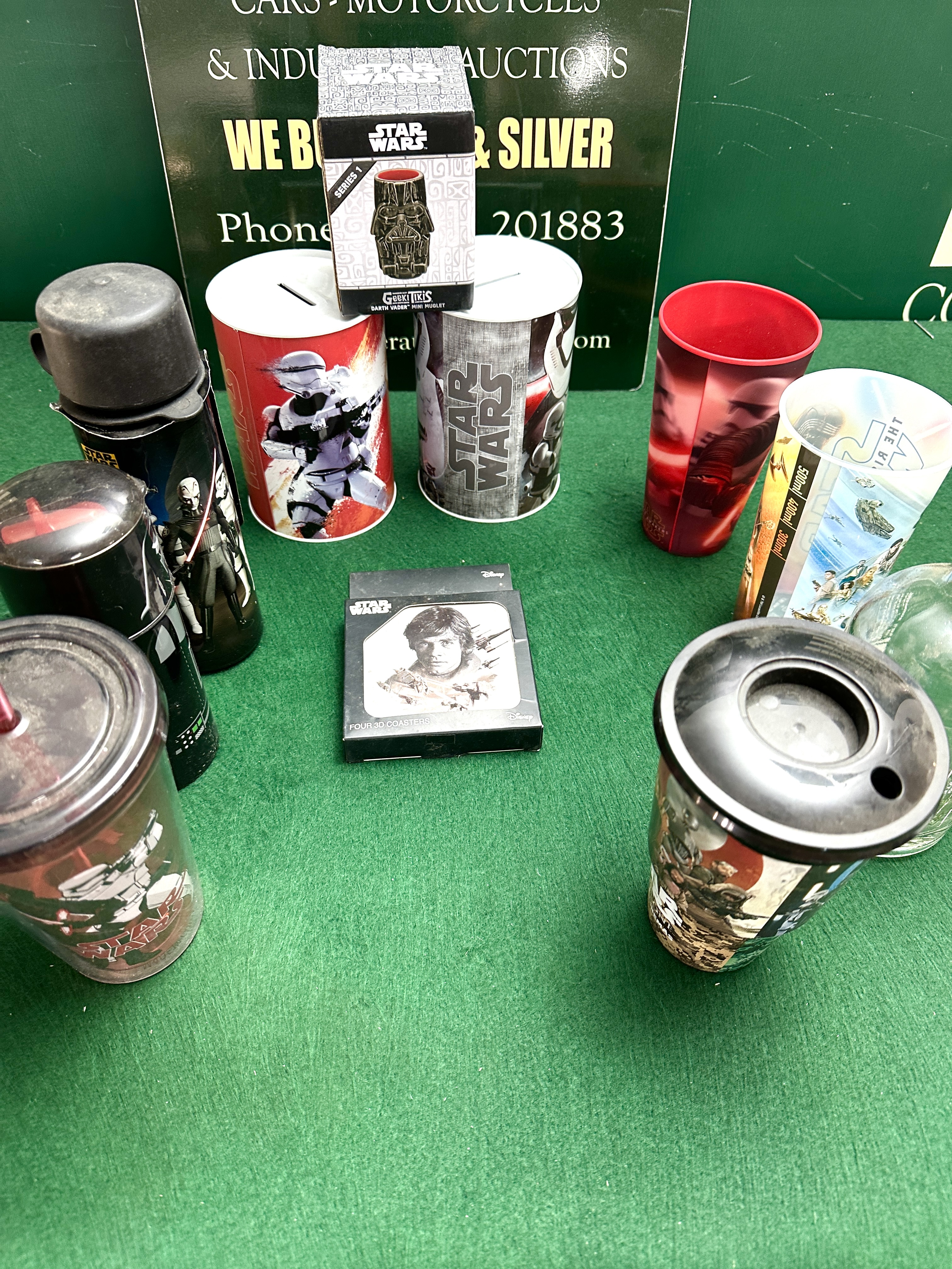An assortment of official Star Wars branded merchandise and functional kitchenware. The collection includes a Geeki Tikis Series 1 Darth Vader Mini Muglet in its original retail packaging and a boxed set of four 3D coasters featuring Luke Skywalker with Disney branding. Also included are two cylindrical metal money tins, one decorated with a First Order Stormtrooper and the other with a monochromatic Star Wars logo pattern.