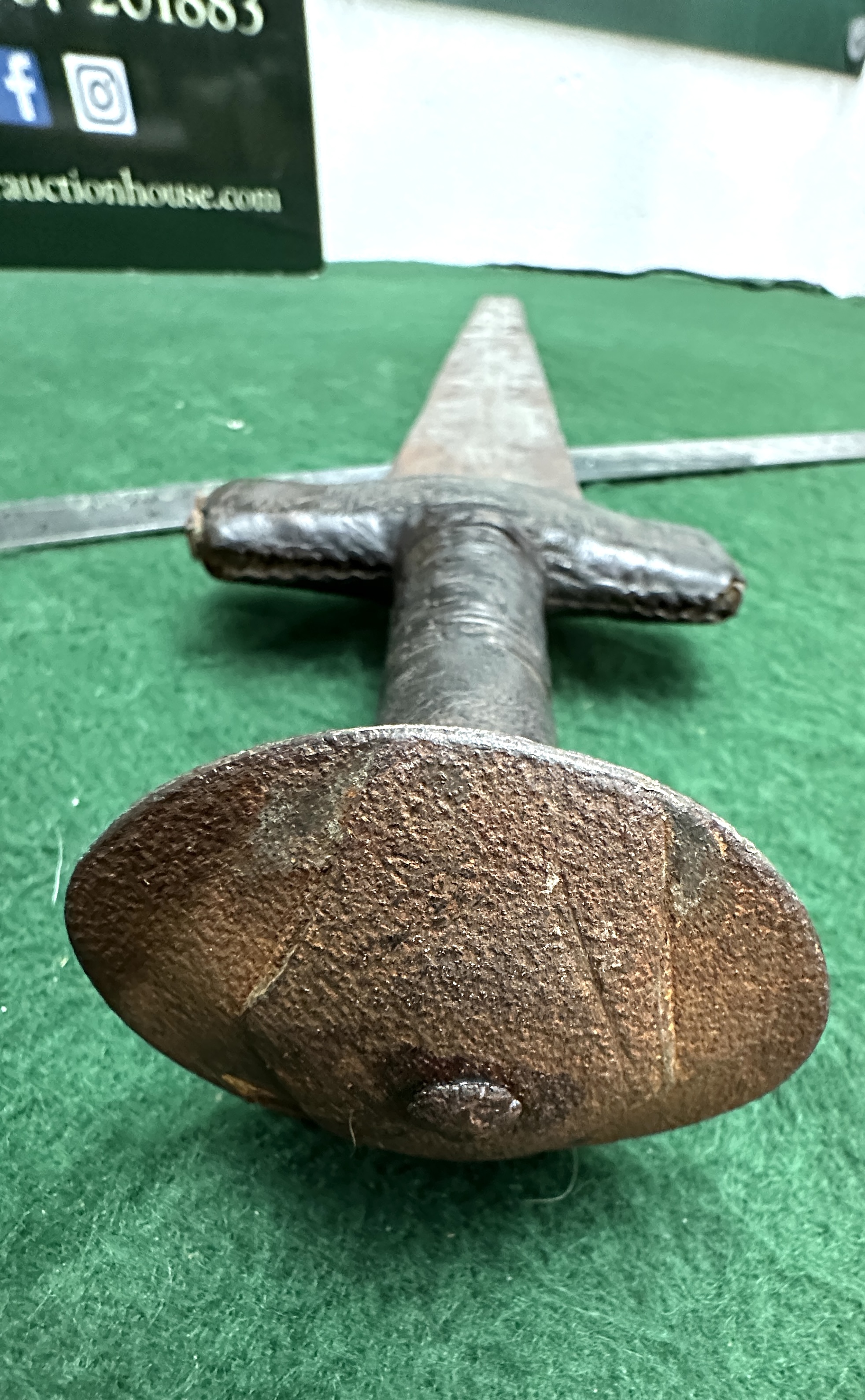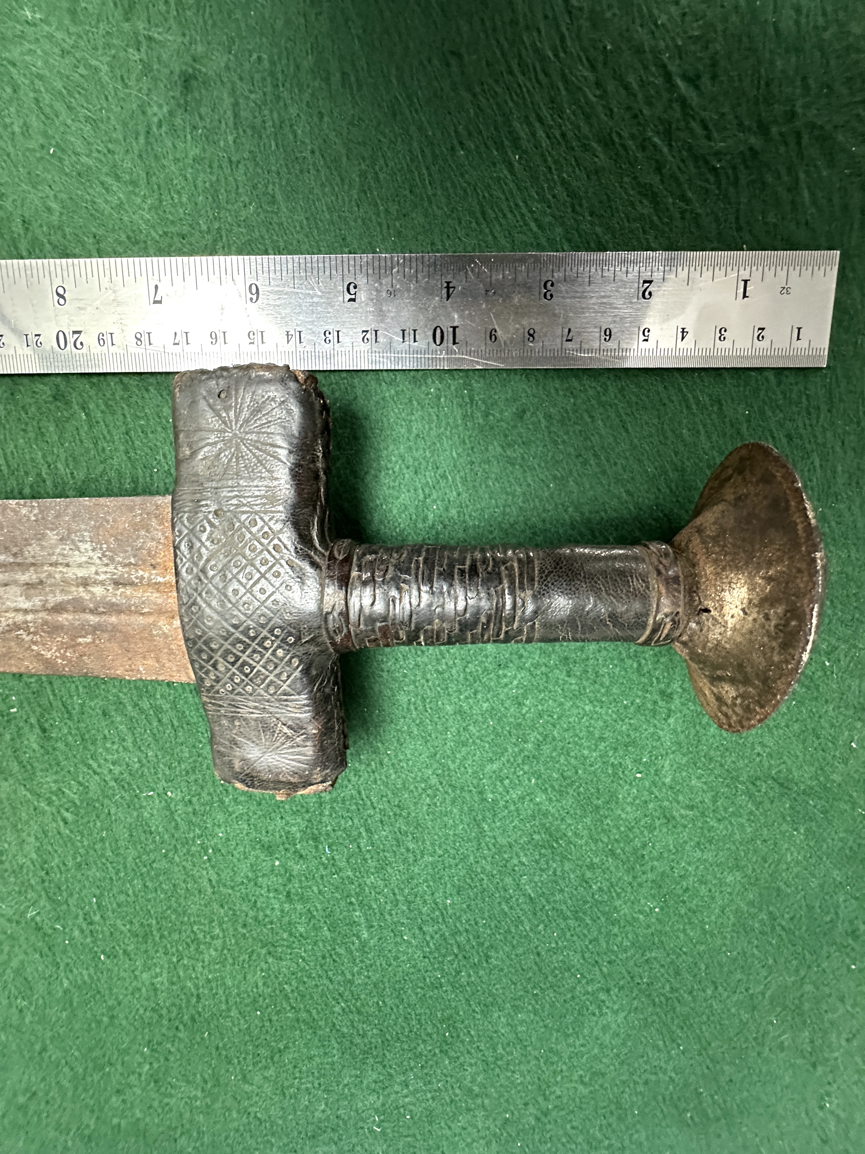 The sword is in a worn, as-found condition. The blade and pommel exhibit heavy surface rust and deep pitting throughout. The leather wrapping on the hilt is aged and shows wear along the edges but remains largely intact, with the decorative tooling still visible.
