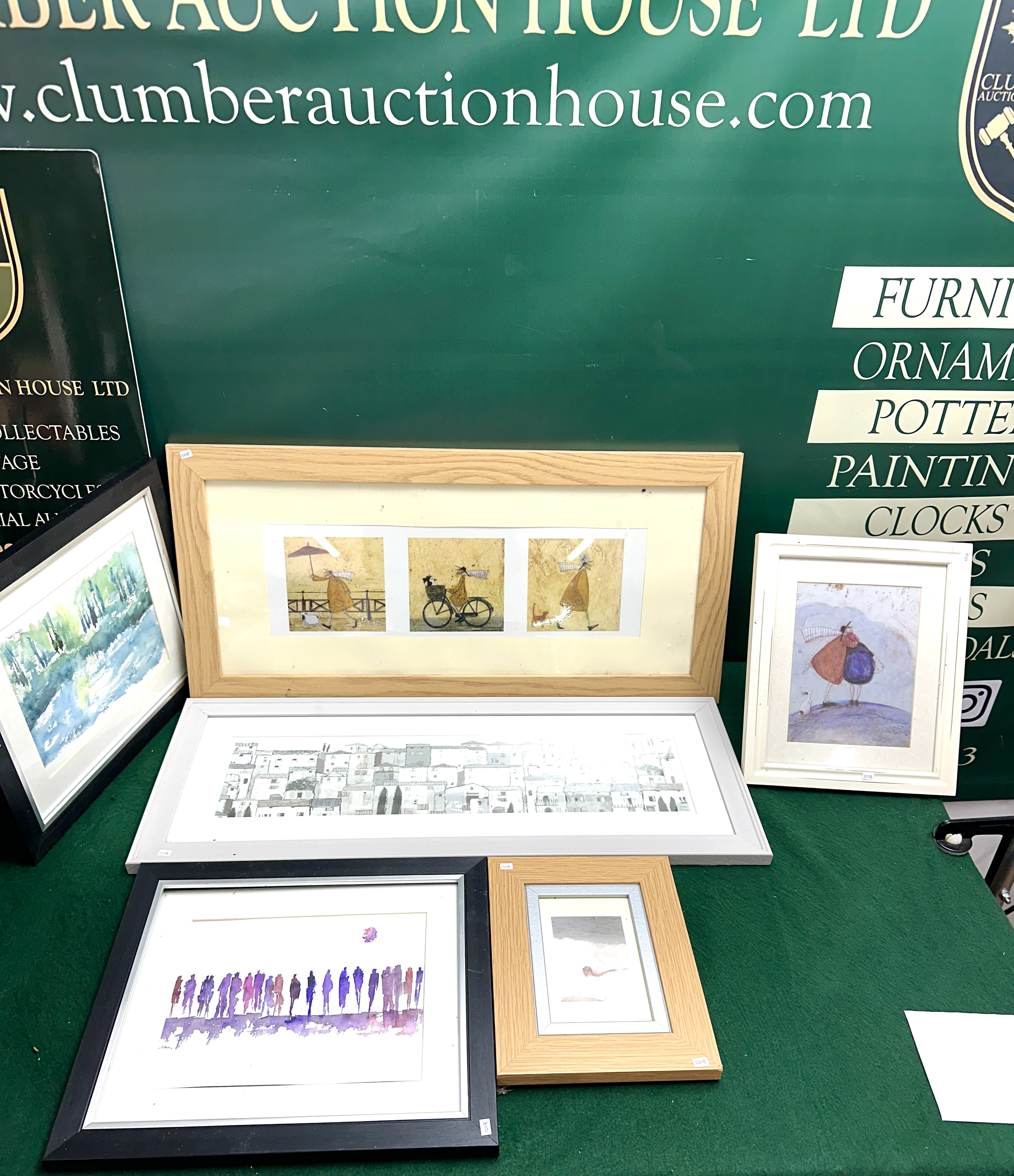 This collection comprises six framed contemporary artworks, primarily executed in watercolour and ink on white wove paper. The subject matter is varied, featuring whimsical figurative studies in a naive style, including a triptych of characters in yellow coats and a figure on a hill. Also included is an elongated fine-line architectural study of a townscape, a row of abstracted figures in fluid purple and blue watercolour washes, and a landscape study in cool blue and green tones. The artistic styles range from detailed ink-and-wash architectural drawing to atmospheric, impressionistic watercolour techniques. No signatures or dates are visible on the face of the works. The collection is presented in a selection of modern frames, including light oak, black, white, and grey-painted wood, all featuring clean white or off-white mounts.