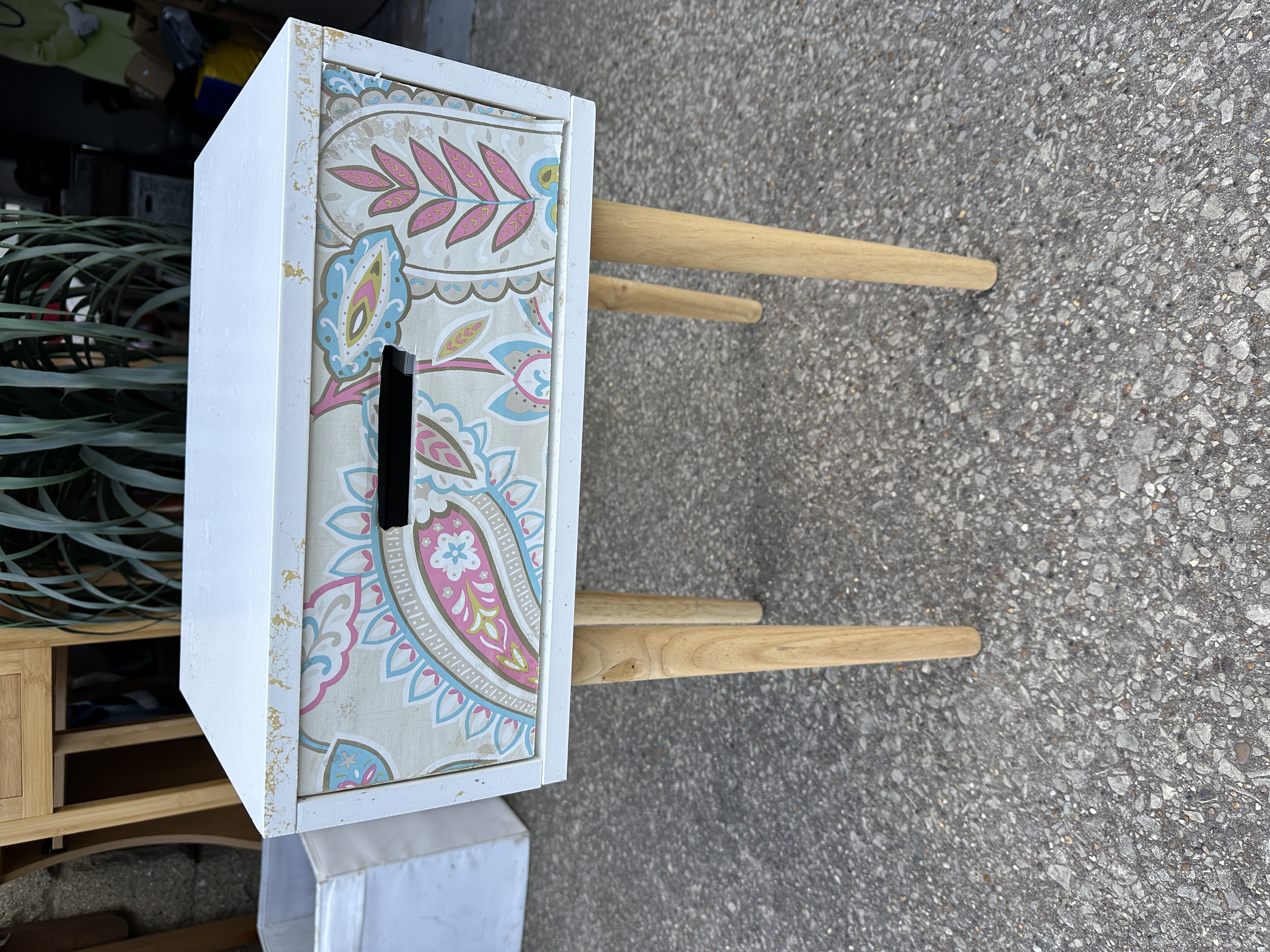 A contemporary side or bedside table consisting of a rectangular white-painted wooden frame housing a single drawer. The drawer front is decorated with a multi-coloured paisley patterned surface in shades of pink, blue, yellow, and green, featuring a central rectangular cutout handle. The piece is supported by four tapered, splayed legs in a light-toned natural wood, exhibiting Mid-Century Modern design influences.