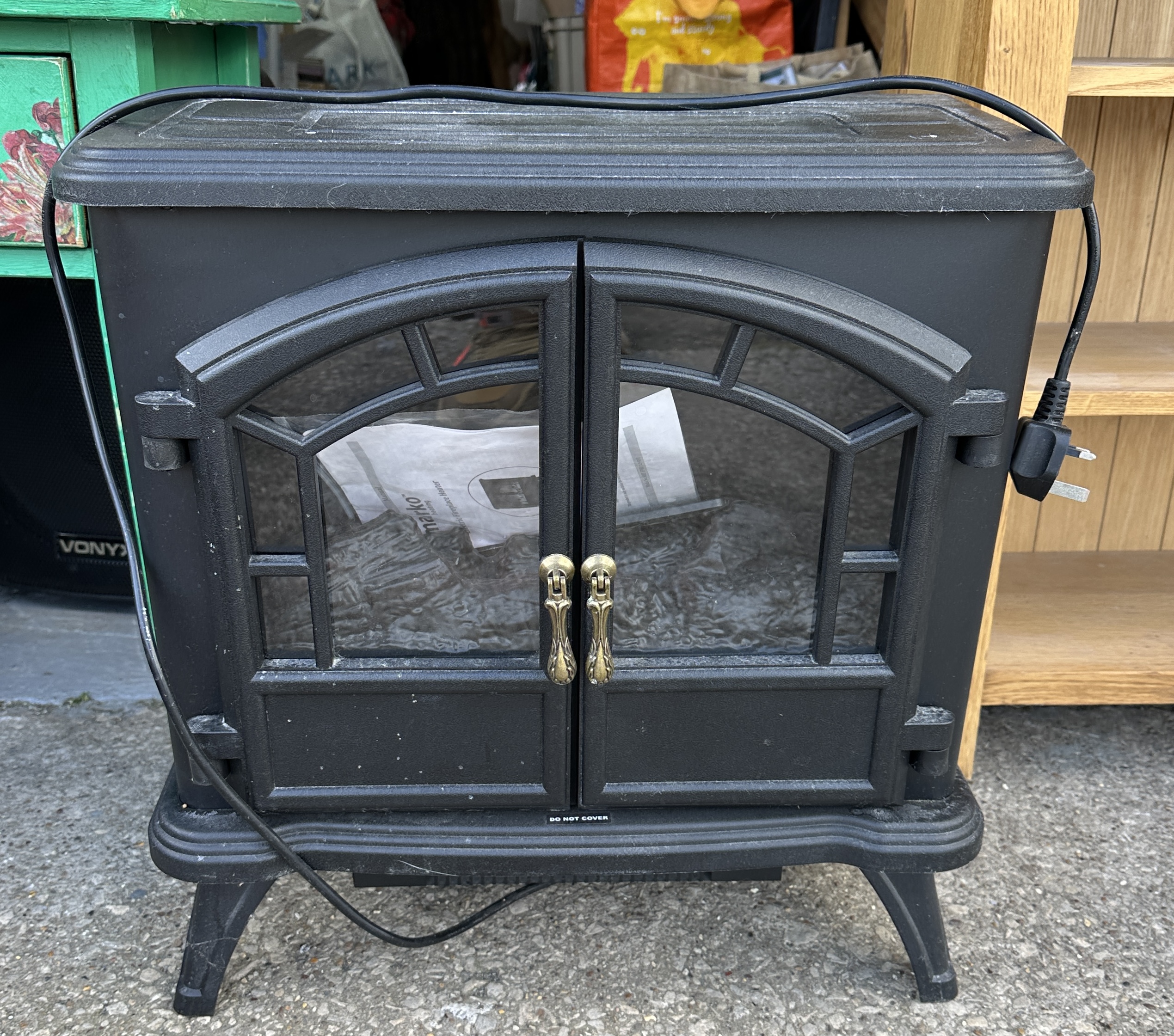 The heater is presented in used condition with visible surface dust and minor scuffing to the exterior finish. The cord and plug appear intact. Internal components are undisturbed.