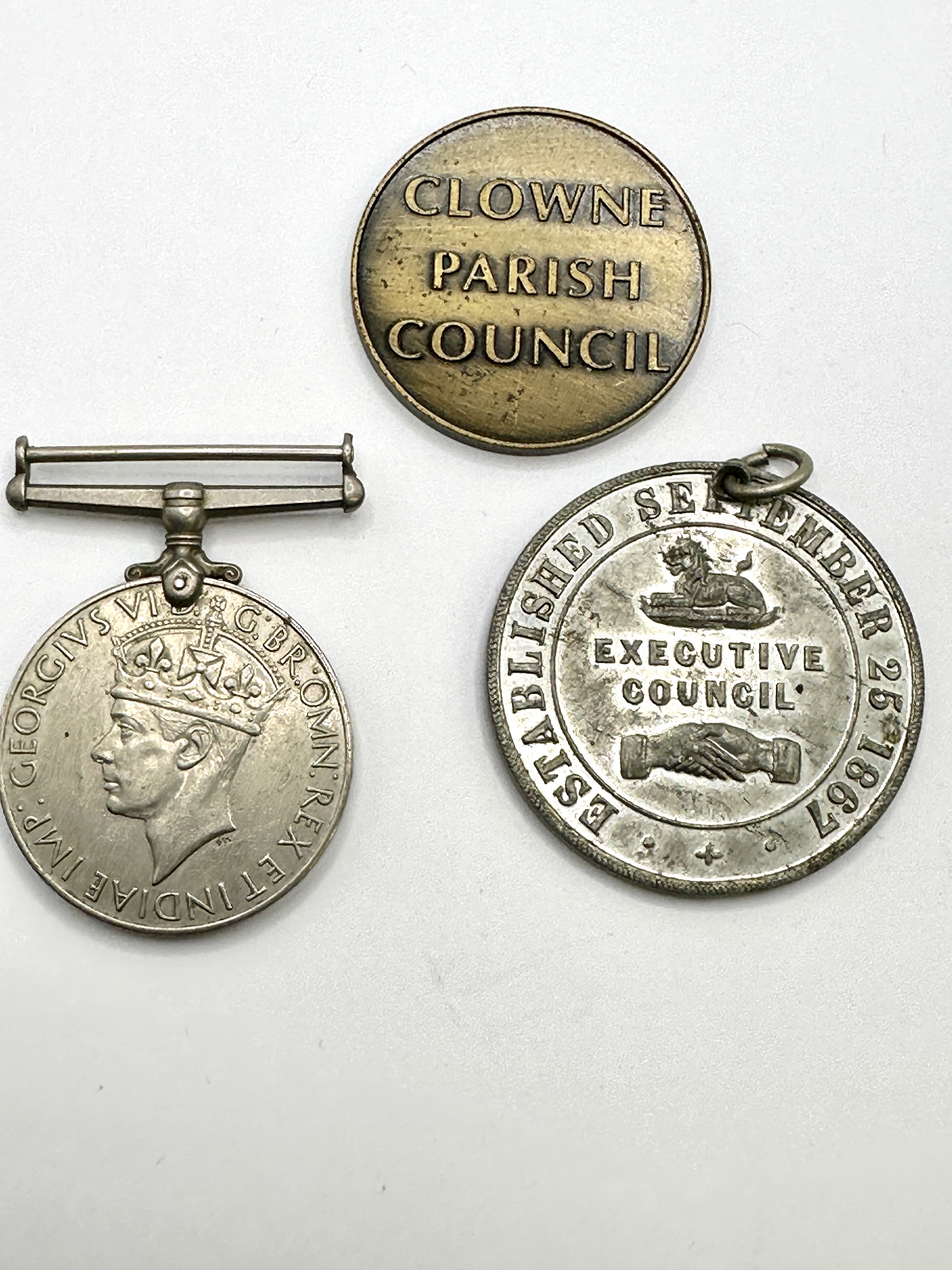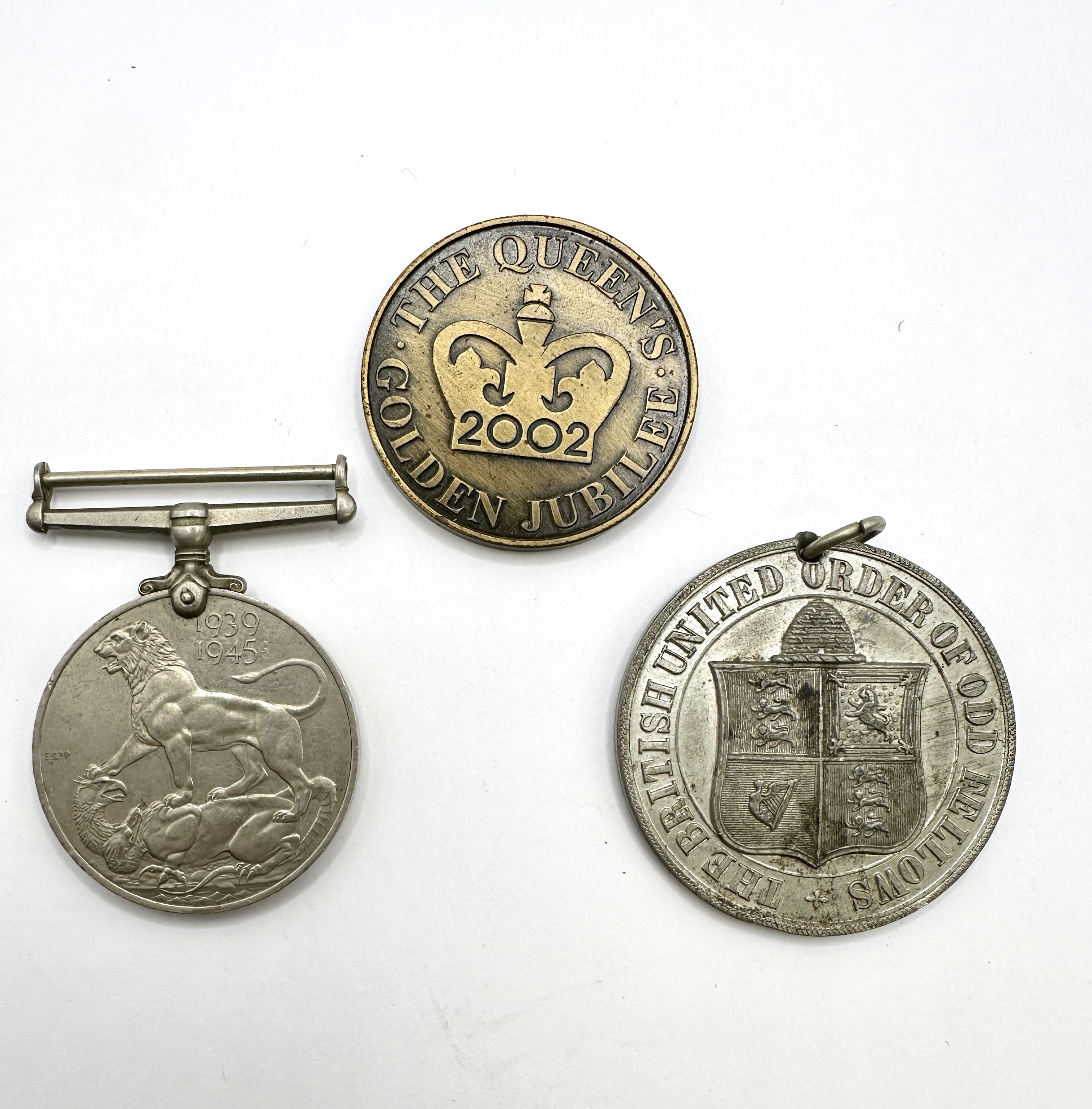 This lot comprises three British items of military, civic, and fraternal interest. The first item is a British 1939-1945 War Medal, a campaign medal awarded for service during the Second World War. Struck in cupro-nickel, the obverse features the crowned effigy of King George VI with the inscription GEORGIVS VI G. BR. OMN. REX ET INDIAE IMP. The reverse illustrates a lion standing over a fallen two-headed dragon, representing the Axis powers, with the dates 1939 and 1945. It is fitted with its original suspension bar. The second piece is a bronze-toned commemorative medallion for the Golden Jubilee of Queen Elizabeth II in 2002. The obverse depicts a central crown containing the date 2002, surrounded by the text THE QUEEN’S GOLDEN JUBILEE. The reverse is inscribed CLOWNE PARISH COUNCIL, indicating it was a local commemorative issue. The third item is a silver-toned metal medallion for the British United Order of Odd Fellows (BUOOF). The obverse shows the order’s coat of arms, including a beehive crest and a shield with four quarters, within the legend THE BRITISH UNITED ORDER OF ODD FELLOWS. The reverse features a pair of clasped hands and is inscribed EXECUTIVE COUNCIL and ESTABLISHED SEPTEMBER 25 1867.