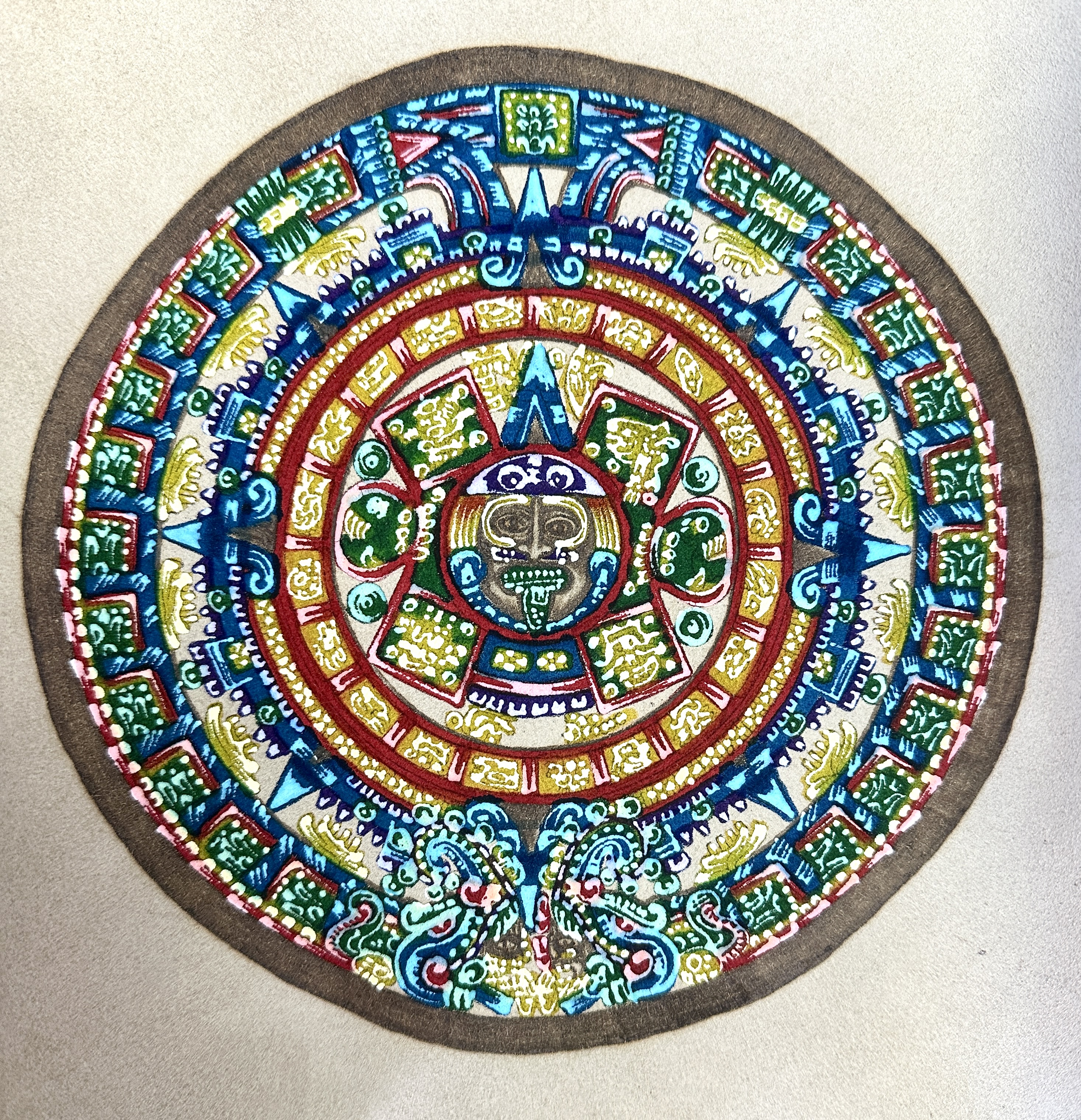 A hand-painted leather decorative piece by Hector M., depicting the Aztec Sun Stone or Piedra del Sol in the stylised colourful manner associated with the artist Michael Angulo. The circular design is applied to a square of light-coloured suede or leather and features the central deity Tonatiuh surrounded by concentric rings of Aztec iconography, including the twenty day signs and fire serpents. The palette includes vibrant turquoise, emerald green, crimson red, and ochre yellow pigments. The reverse side is hand-inscribed with provenance from the Museo Nacional de Antropologia e Historia in Mexico City (Cd. de Mexico D.F.), marked Hecho a Mano and signed Hector M.