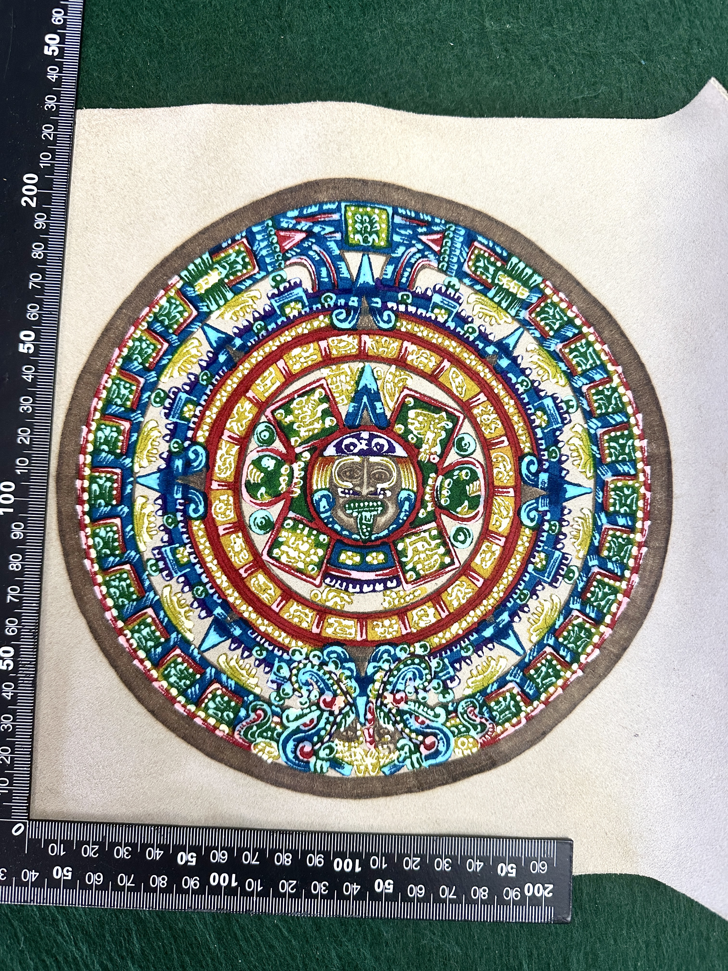 Measurements: Leather square approximately 200 mm by 190 mm; circular design diameter approximately 145 mm.