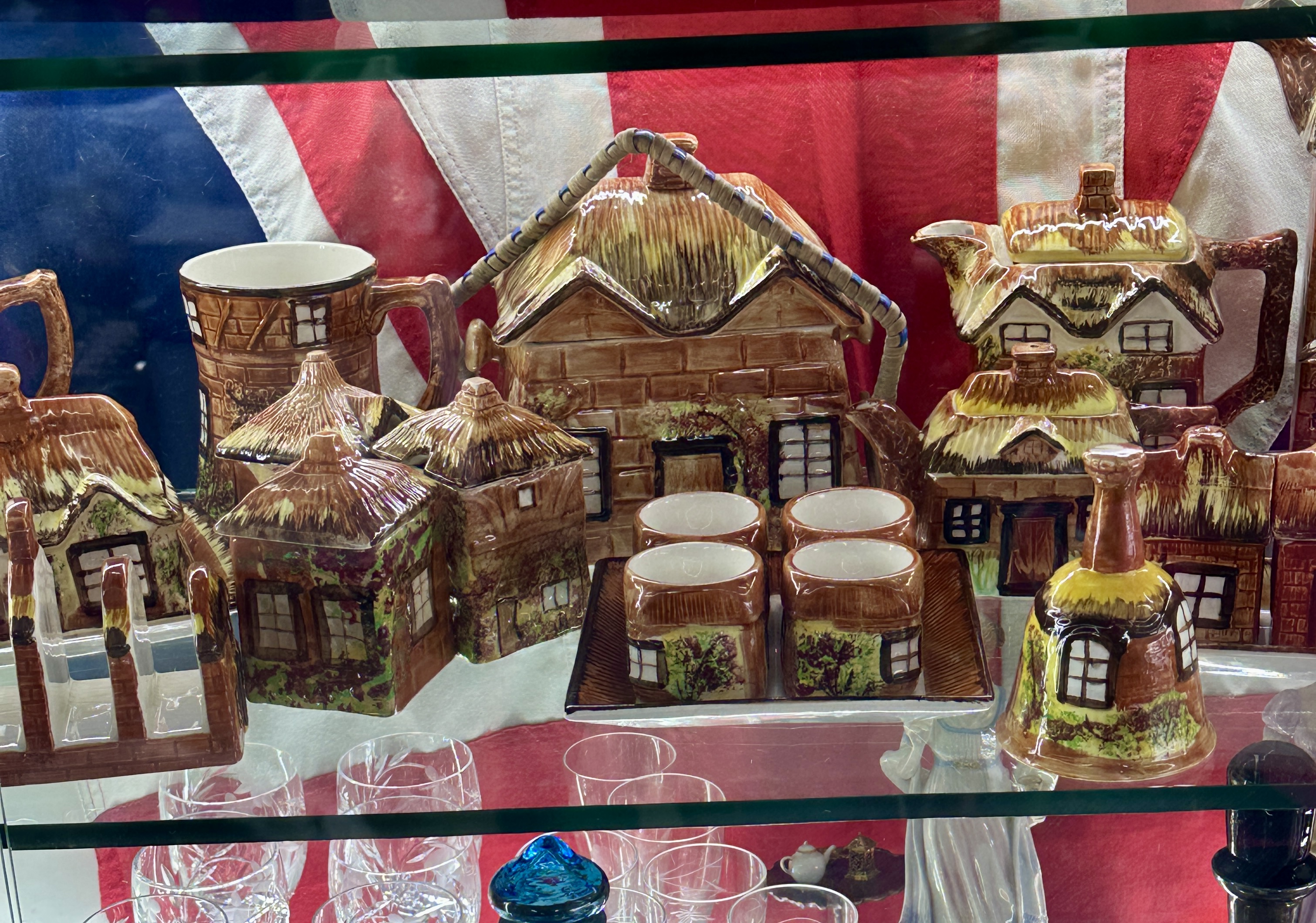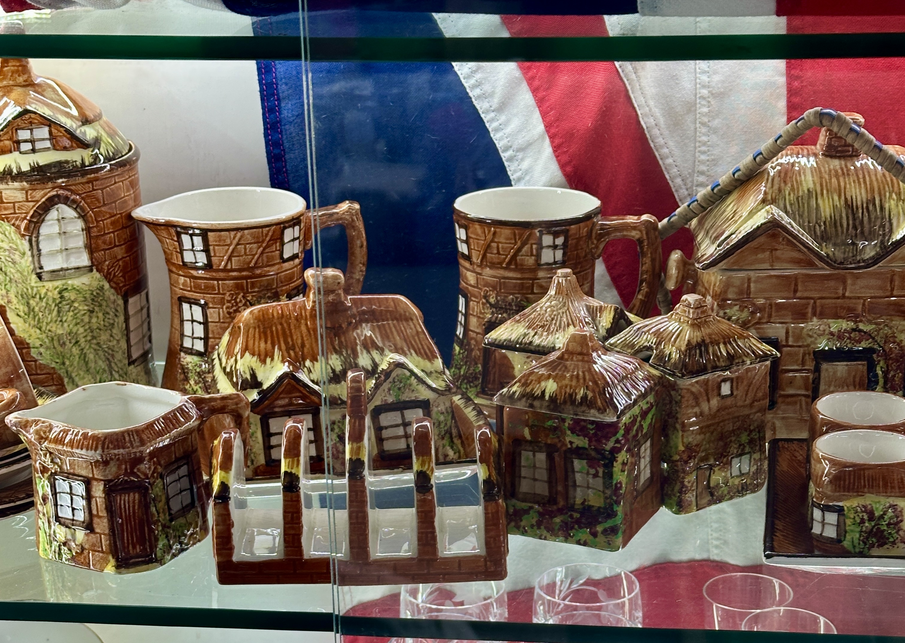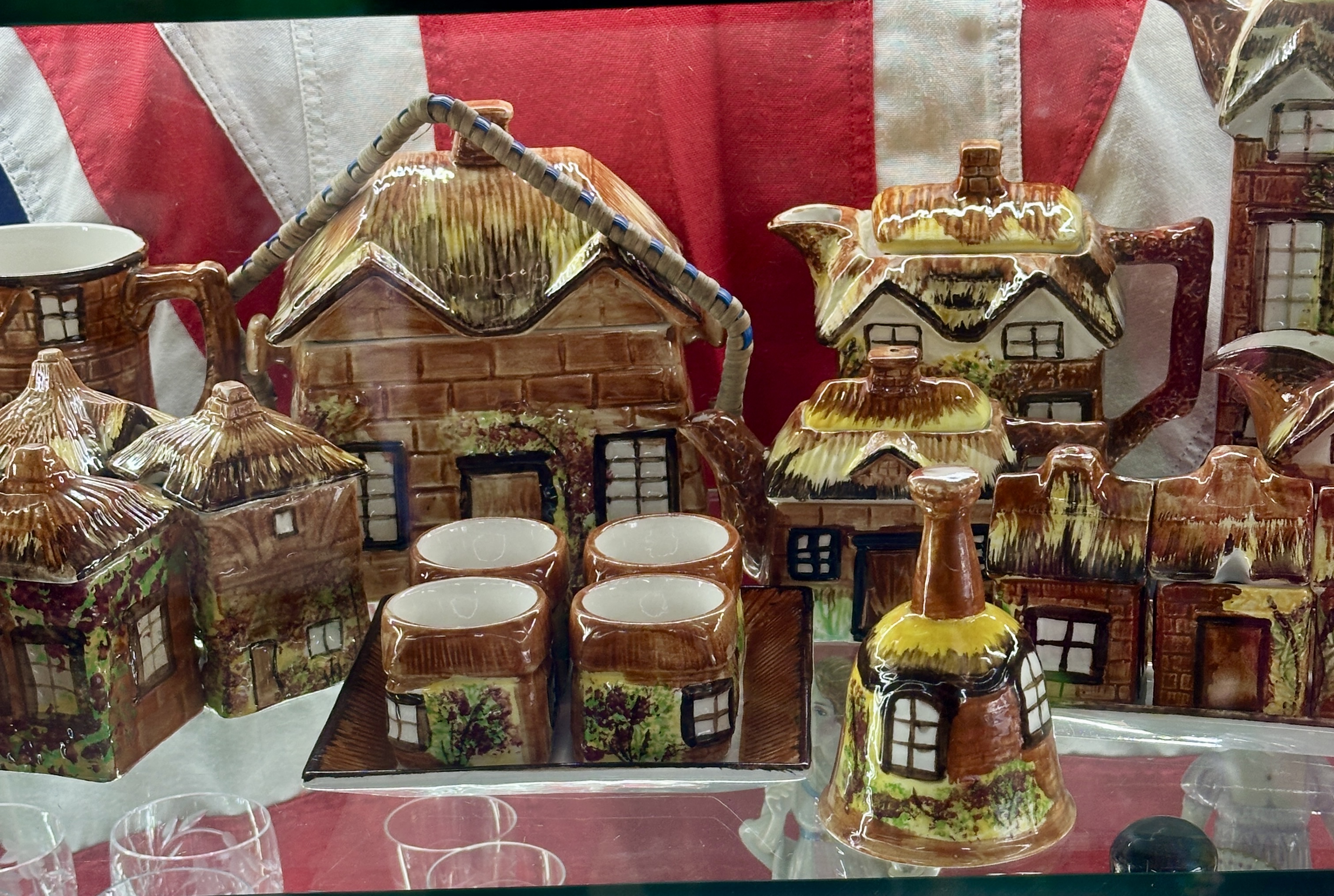 This collection consists of an assortment of glazed earthenware items from the Ye Olde Cottage range, manufactured by Price Kensington in England. The pieces feature relief-moulded details characteristic of the pattern, including thatched roofs, brickwork, multi-paned windows, and climbing floral foliage. Decoration is applied using hand-painted underglaze colours in shades of brown, yellow, green, and red. The grouping includes a wide variety of functional and decorative tableware and kitchenalia: a tall, cylindrical lidded biscuit jar; multiple teapots of varying sizes, including one with a raffia-wrapped handle; several milk jugs and creamers; lidded sugar bowls; a four-slot toast rack; a set of egg cups on a matching rectangular tray; a large pitcher; several mugs; a novelty ceramic bell; and a set of cups with matching saucers.
