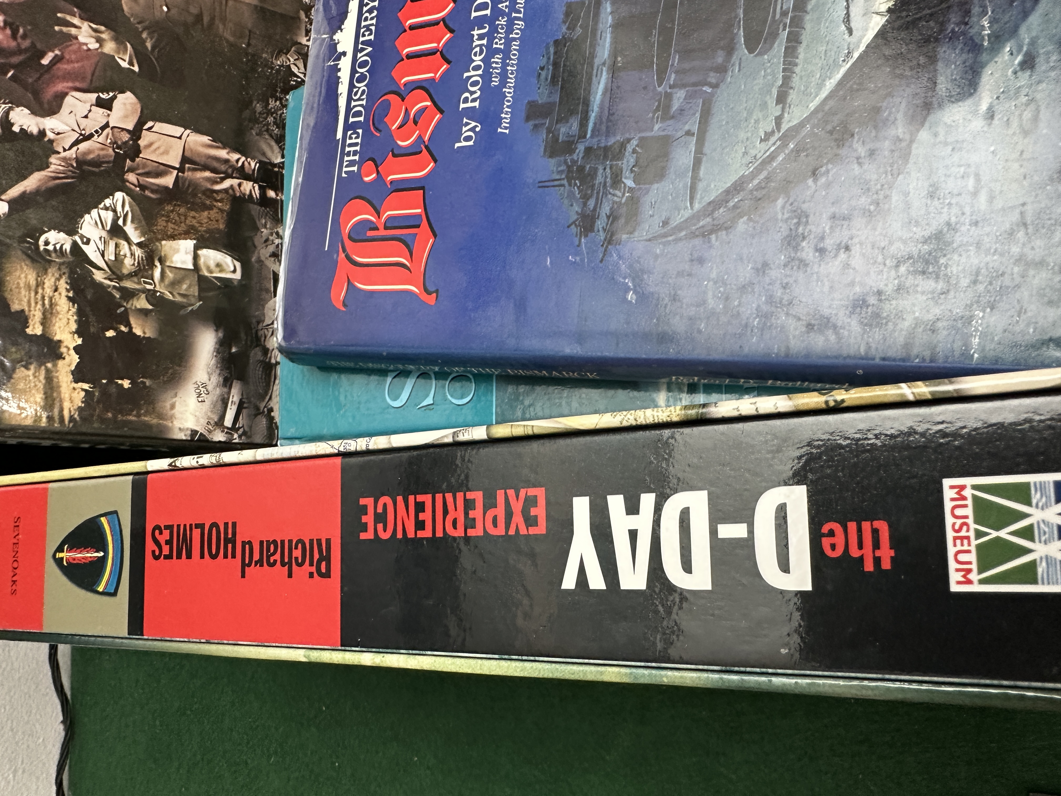 A collection of books and media primarily focused on naval and military history. The printed material includes The Discovery of the Bismarck by Robert D. Ballard with Rick Archbold, The D-Day Experience by Richard Holmes, Great Sea Stories of the World, The Voyage of the Matthew by Peter Firstbrook, Modern Submarine Warfare, and Without Trace by John Harris. The lot also includes a factory-sealed 8-DVD box set titled World War II, containing documentary footage and original film. Completing the collection is a framed triptych presenting three sepia-toned maritime photographs in a dark wooden frame with a neutral mount.