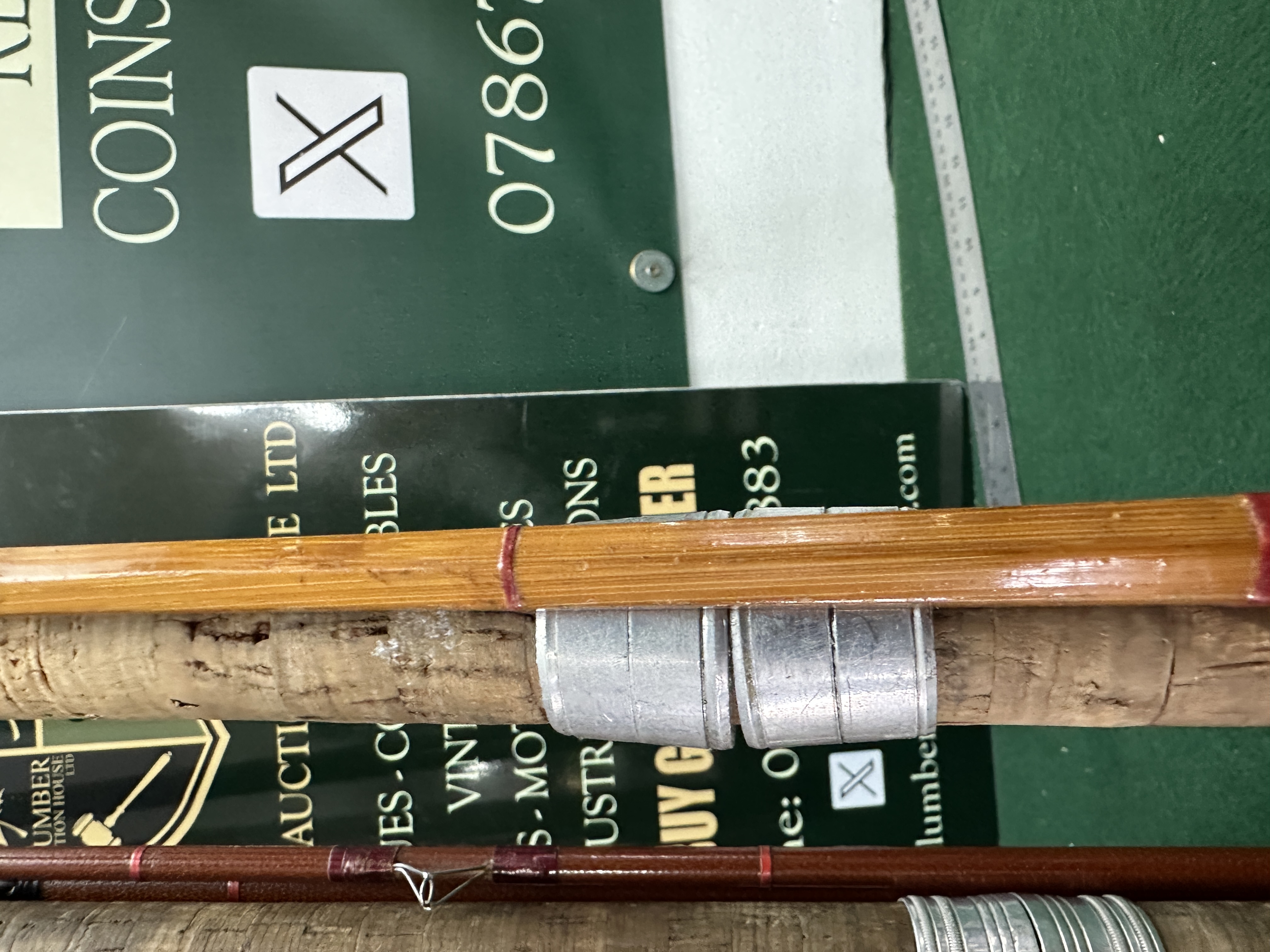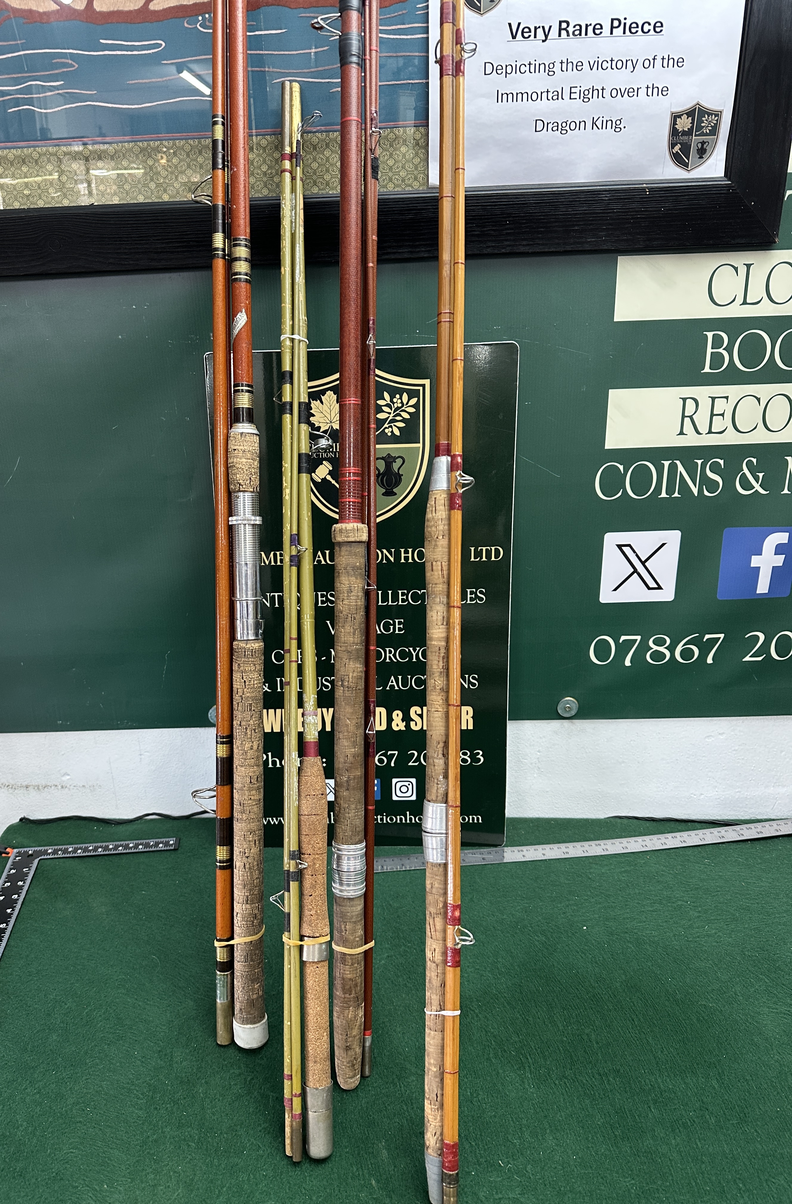 A collection of vintage split-cane bamboo fishing rods and various rod sections.