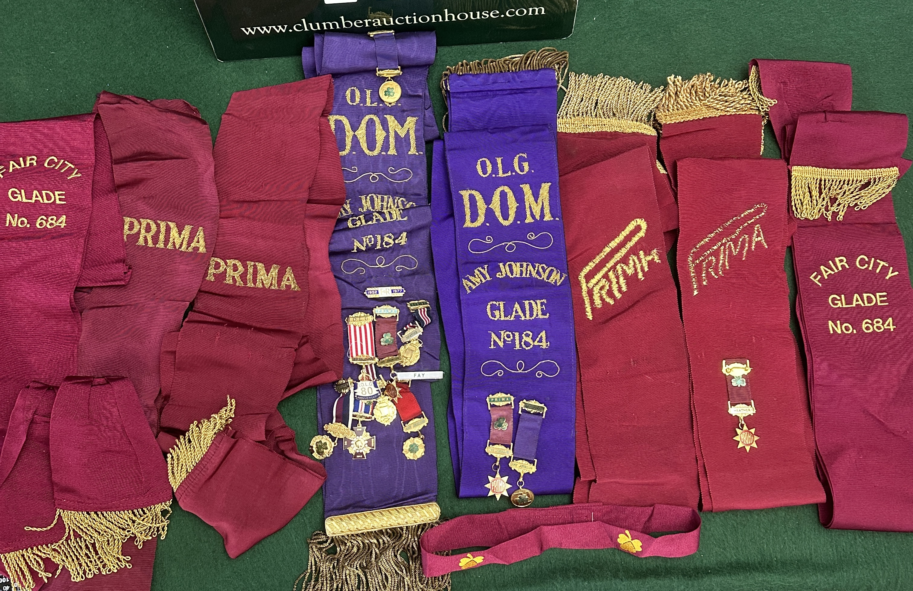 This collection of fraternal regalia belongs to the Independent Order of Loyal Orangewomen (I.O.L.G.), a women’s auxiliary of the Orange Order. The grouping is primarily associated with Glade No. 184 and Fair City Glade No. 684, with the latter referring to the city of Perth, Scotland. Several pieces are personally named to Amy Johnson, with other pins bearing the names Fay and Heather. The lot includes multiple textile sashes in purple and maroon with gold-tone bullion embroidery. A purple sash is inscribed O.L.G. D.O.M. AMY JOHNSON GLADE No. 184. Maroon sashes feature inscriptions including PRIMA and FAIR CITY GLADE No. 684, some finished with gold-tone fringe. The accompanying jewellery and medals include a star-shaped Prima degree medal in red enamel; a circular gold-tone medal for the Daughters of Miriam (D.O.M.) featuring a fylfot symbol and a central green enamel shamrock; a Maltese-style cross commemorating the 130th anniversary of the I.O.L.G. and the 2012 Diamond Jubilee of Queen Elizabeth II, featuring a relief bust of the monarch; and an 80th anniversary shield-shaped medal. The items are constructed from silk or synthetic fabrics, gold-tone base metal, and enamel.