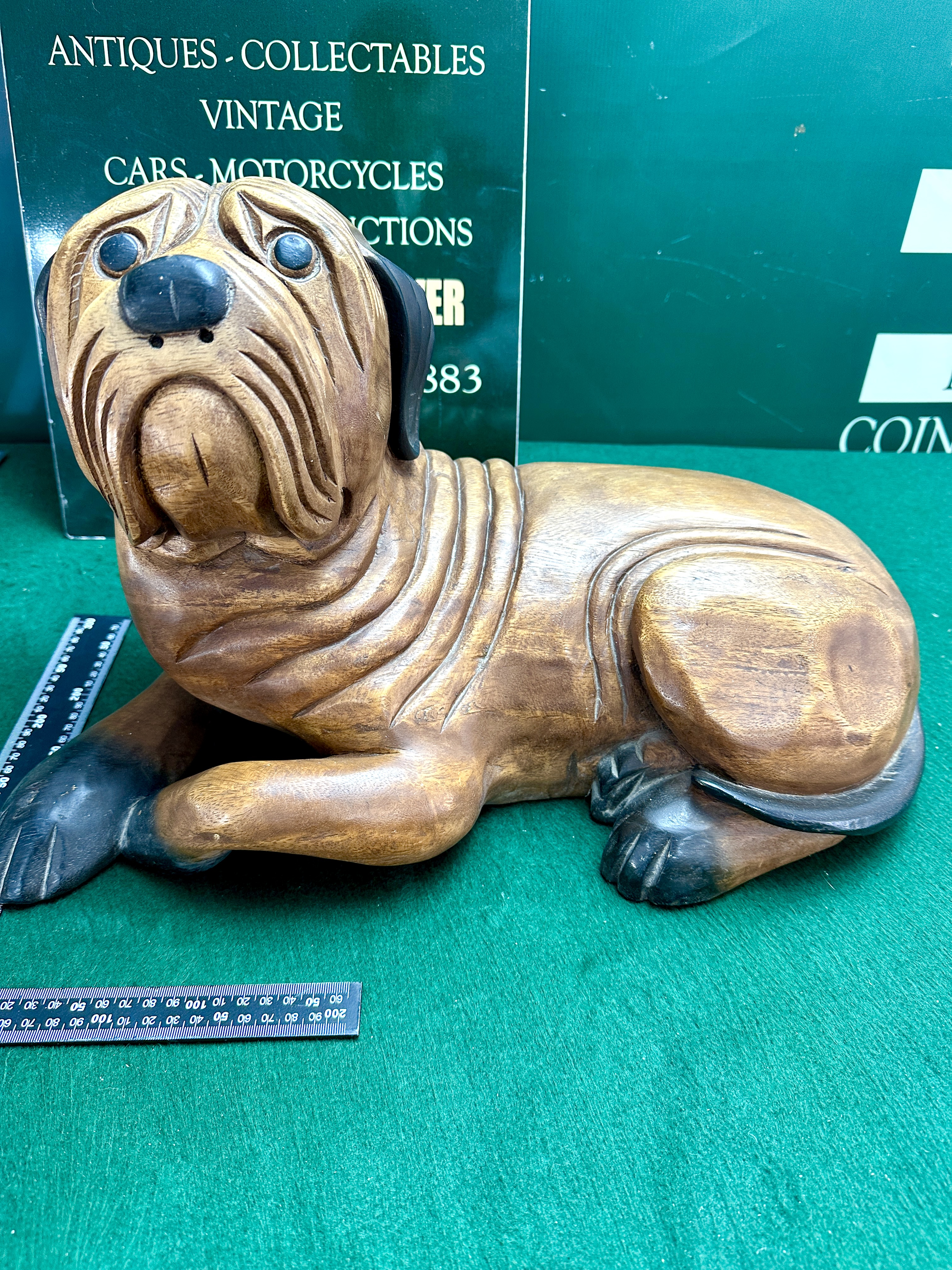 A substantial hand-carved hardwood sculpture of a recumbent dog, stylistically representing a Shar Pei breed. The figure is rendered in a resting position with the front paws tucked. The medium is a solid timber, finished with a two-tone stain; a warm mid-brown tone is used for the main body, while dark-stained accents highlight the eyes, nose, ears, and paws. The carving is characterised by deep, rhythmic incisions that create exaggerated skin folds and wrinkles across the head, neck, and torso. The surface is polished and exhibits a visible wood grain. No signatures or maker’s marks are visible on the exterior surfaces.