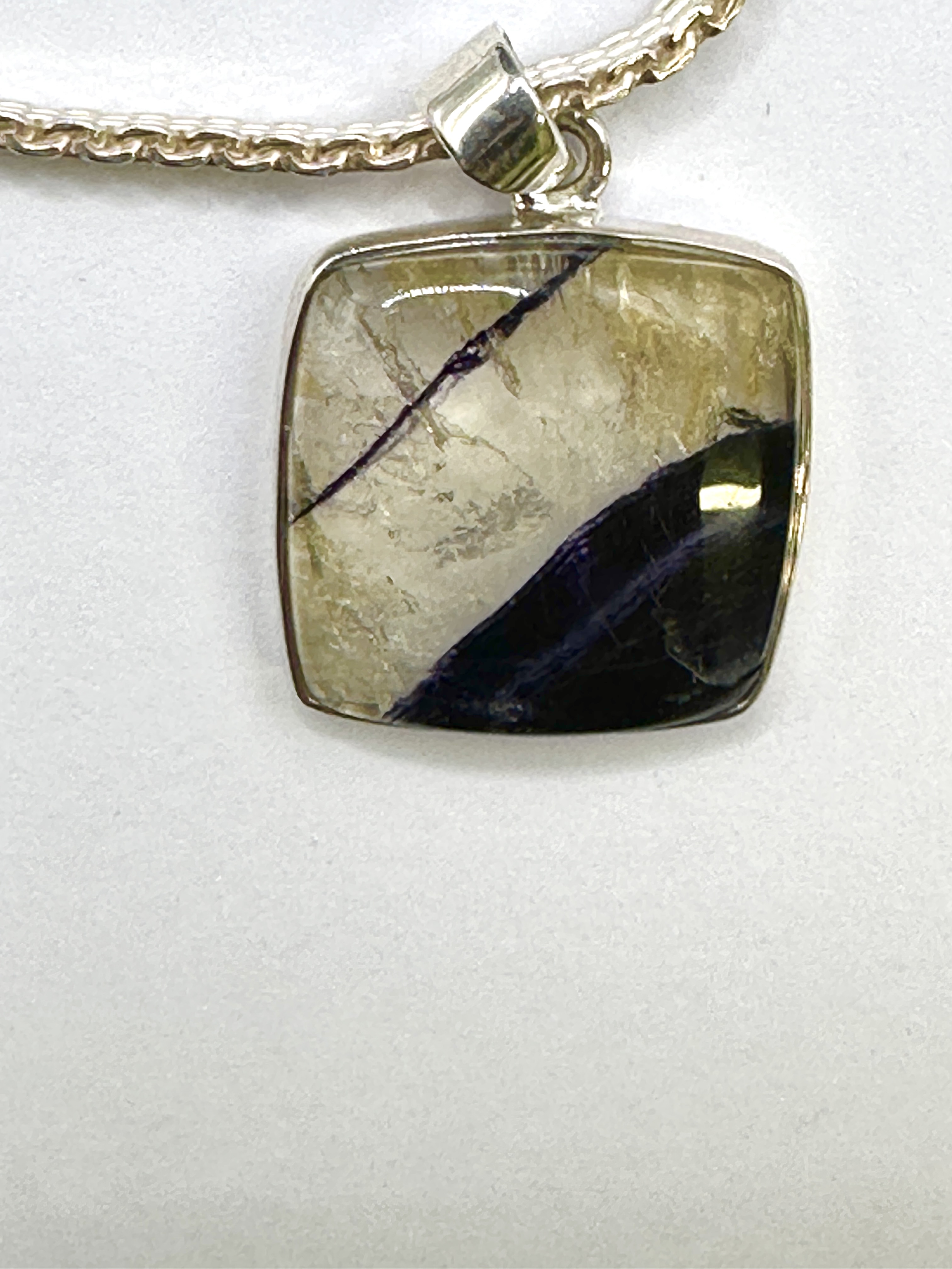 The necklace is in good overall condition. The Blue John gemstone exhibits natural internal structure, colour zoning, and surface-reaching fissures inherent to this mineral species. The 925 silver shows light surface scratches and minor tarnishing consistent with handling.