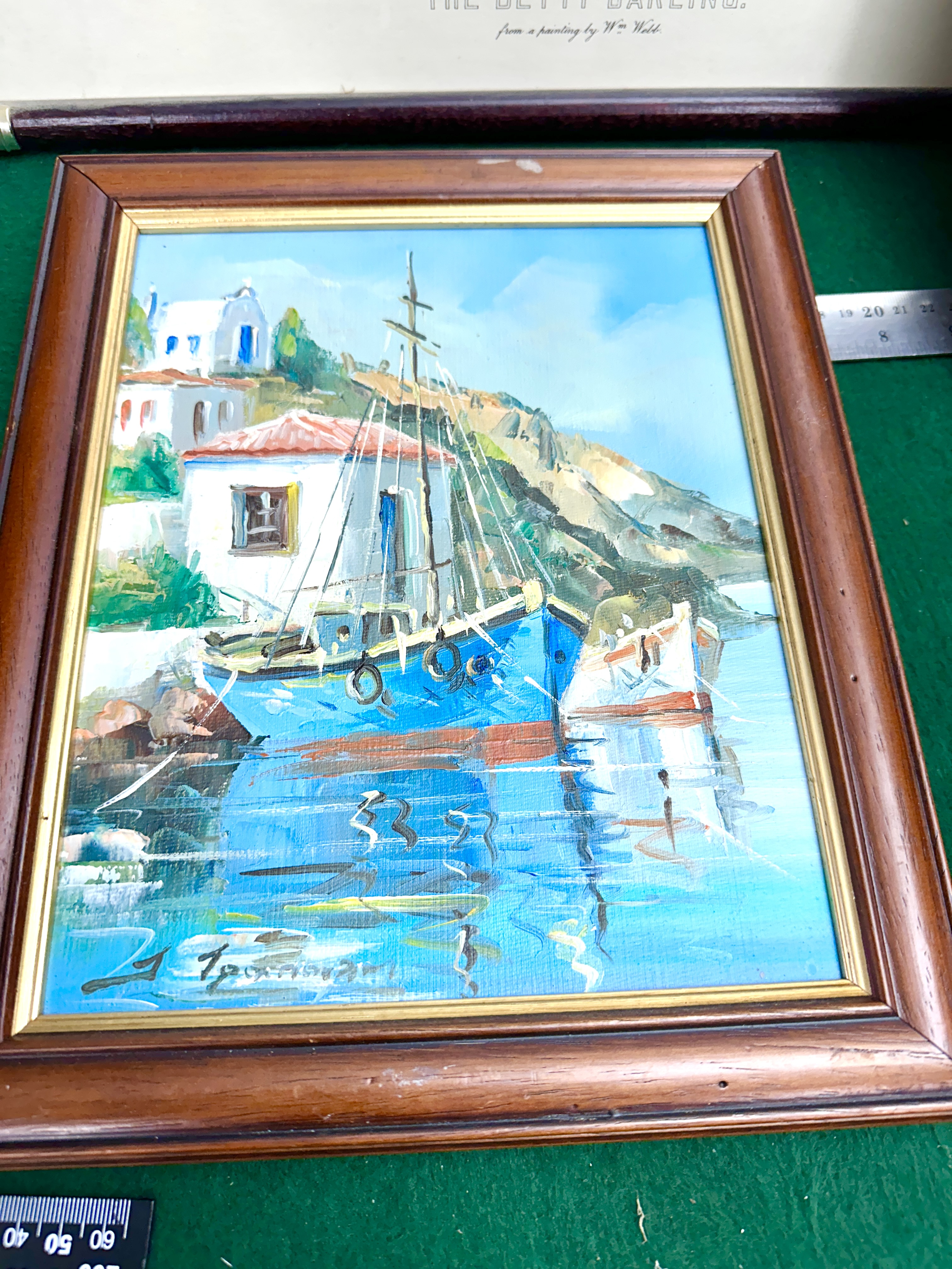 A vibrant modernist oil painting on board by the Greek artist Zacharias Tzanarakis. The composition depicts a bright Mediterranean harbour scene, likely in the Cyclades, featuring white-washed dwellings with terracotta tiled roofs set against a rugged hillside. A large blue-hulled fishing boat is moored in the foreground, its mast and rigging rendered with fine lines, with its reflection captured in the turquoise water. The artist employs a confident impasto technique, using thick applications of paint to create texture, particularly in the highlights and the water surface. The work is signed Z. Tzanarakis in the lower-left corner. It is housed in a contemporary dark-stained wooden frame with a gilded inner slip. A portion of another print is visible in the background above the frame.