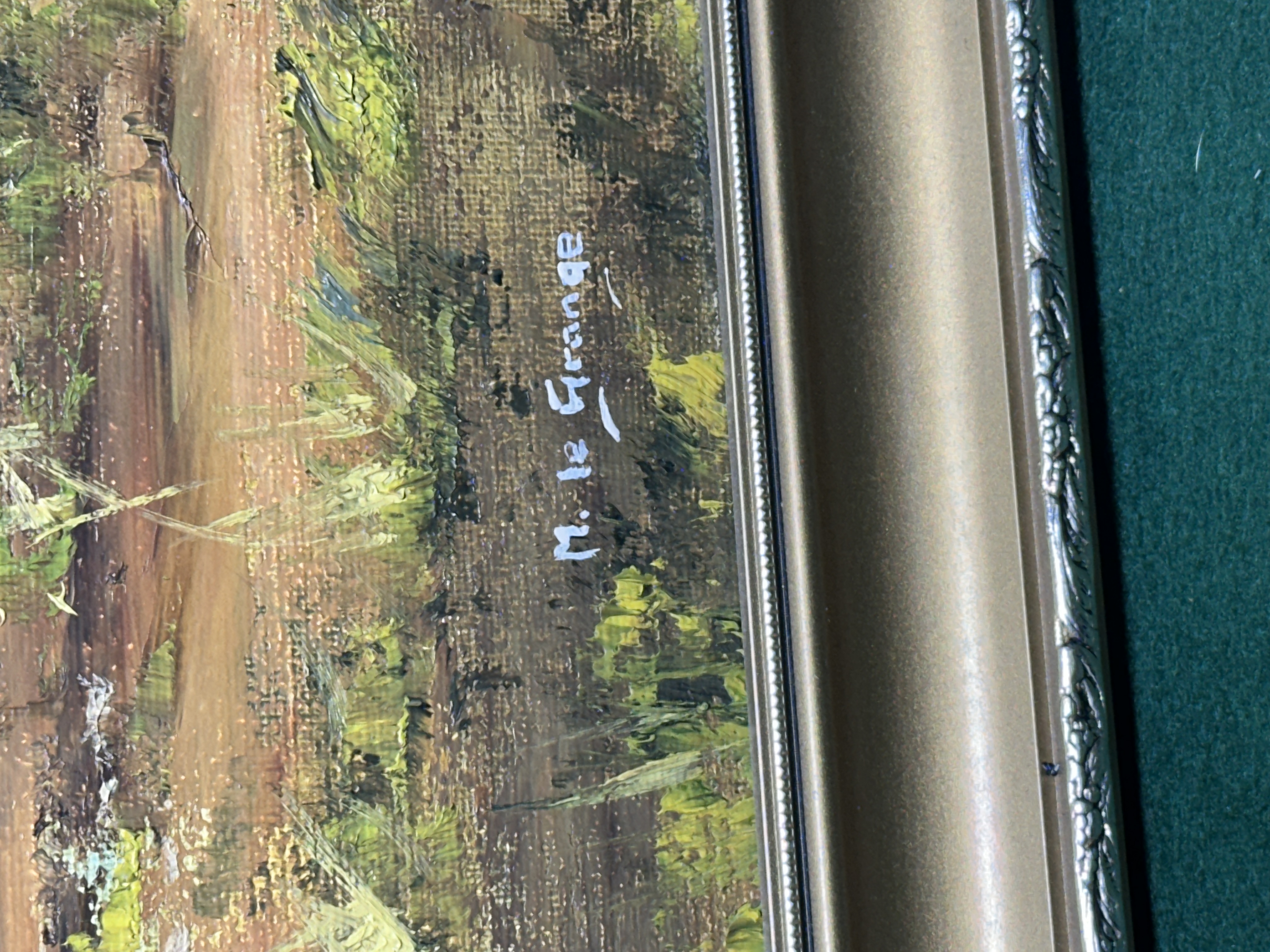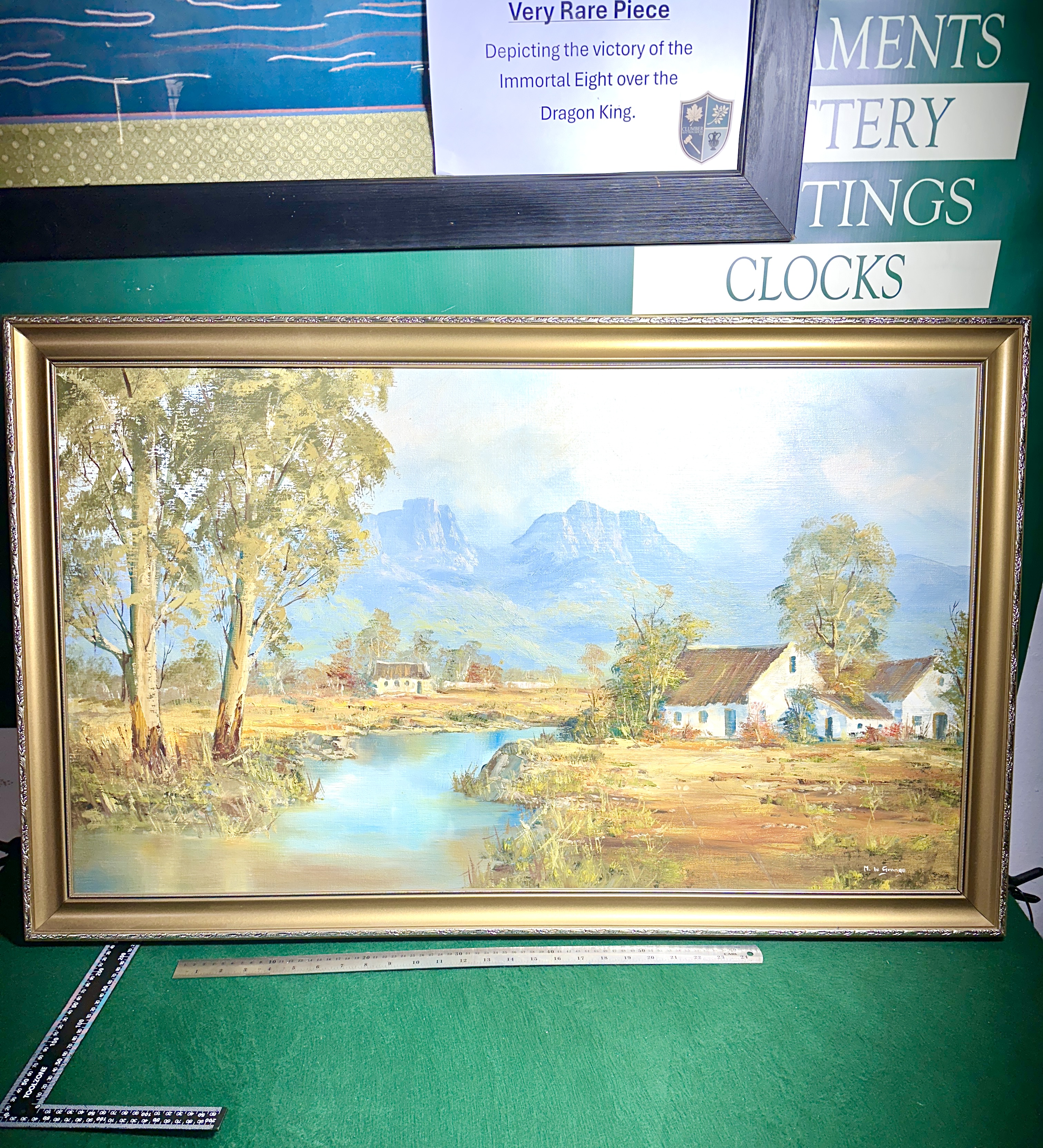 This work is an oil on stretched canvas landscape by the artist M. le Grange, depicting a traditional Cape Dutch farmstead. The composition features a group of characteristic white-walled cottages with thatched roofs, situated in a sprawling rural valley beside a calm body of water. To the left, tall trees with pale bark and yellowish-green foliage are rendered with visible texture. In the distance, a prominent mountain range rises in soft hues of blue and violet. The artist utilises a naturalistic palette of colours and an impressionistic style, characterised by loose, expressive brushwork and areas of impasto in the foreground vegetation. The painting is signed M. le Grange in the lower right corner and is housed in a contemporary decorative gilt frame with a beaded inner border. Based on the 24-inch (60 cm) steel rule visible in the foreground, the canvas size is approximately 61 cm x 91 cm.