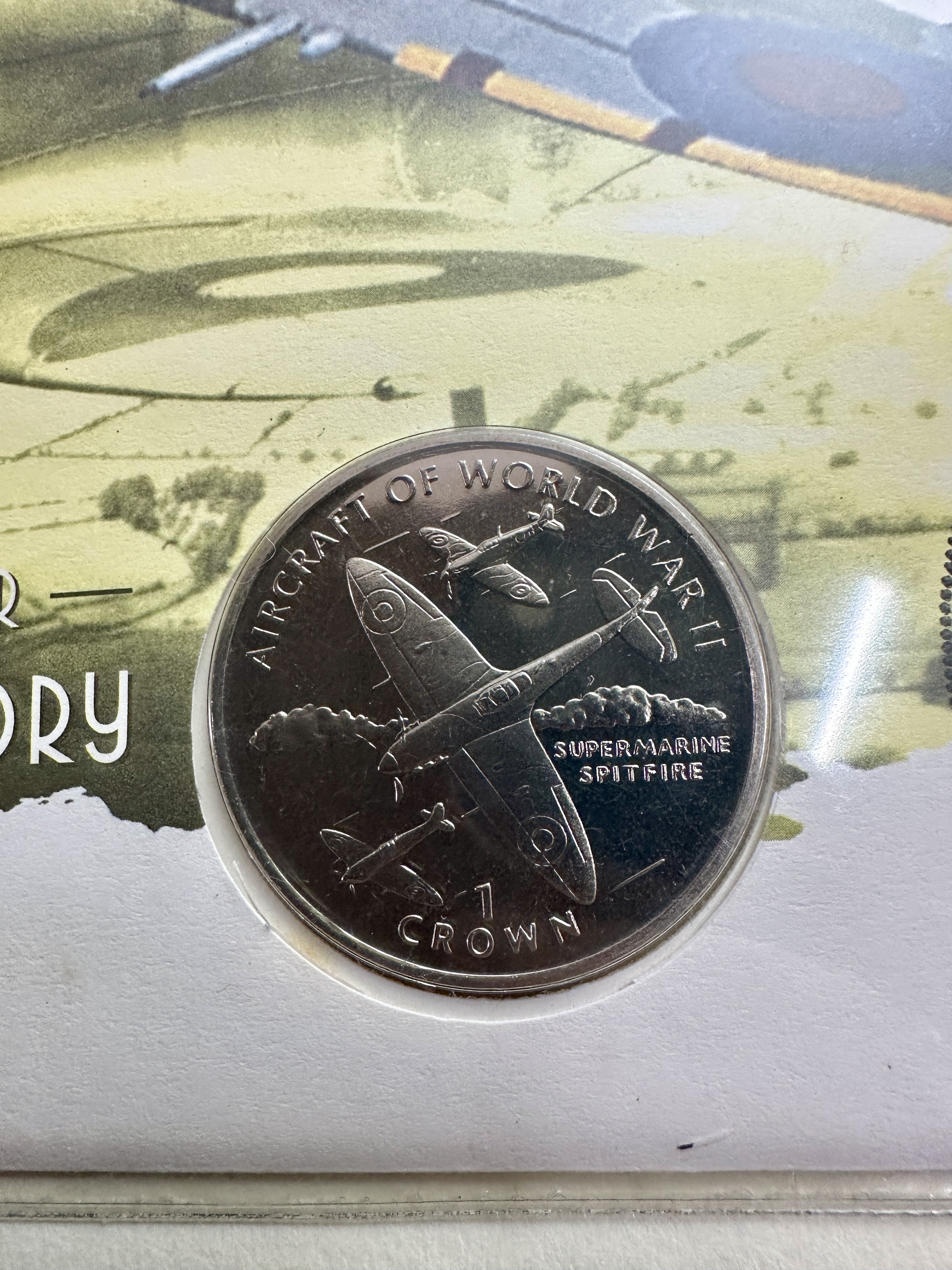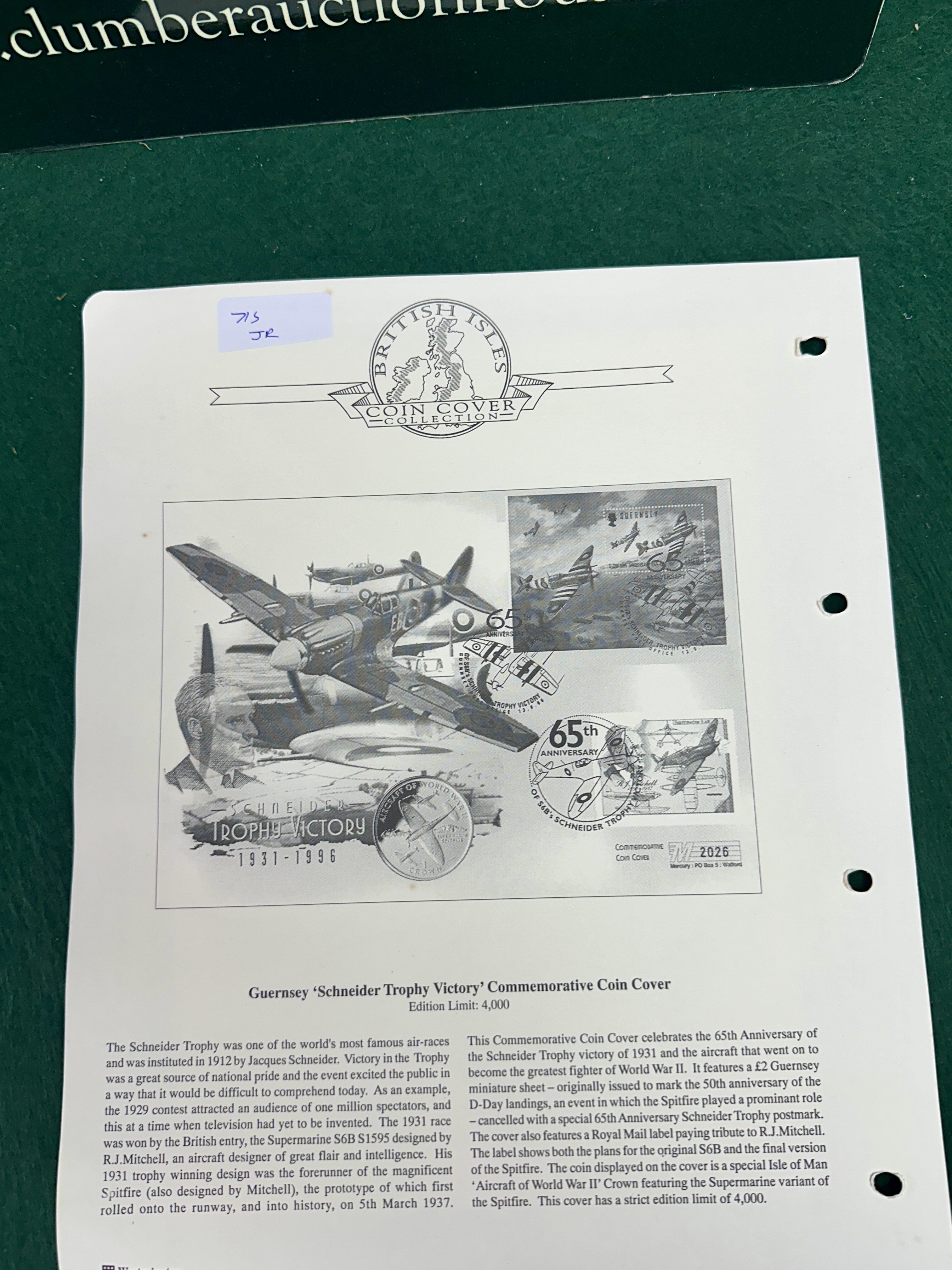 Philatelic numismatic cover (PNC) titled Guernsey Schneider Trophy Victory Commemorative Coin Cover, produced for the British Isles Coin Cover Collection. The cover features a Guernsey £2 multicoloured miniature sheet, Stanley Gibbons MS661, originally released in 1994 for the 50th anniversary of D-Day, alongside a Royal Mail label commemorating R.J. Mitchell and the Supermarine S.6B. Both items are cancelled with 13 September 1996 circular commemorative postmarks marking the 65th anniversary of the S.6B Schneider Trophy victory. Inset into the cover is an Isle of Man copper-nickel 1 Crown coin from the Aircraft of World War II series, featuring the Supermarine Spitfire. The item is part of a limited edition of 4,000, with this example bearing the serial number 1886. Accompanied by the original descriptive historical insert.