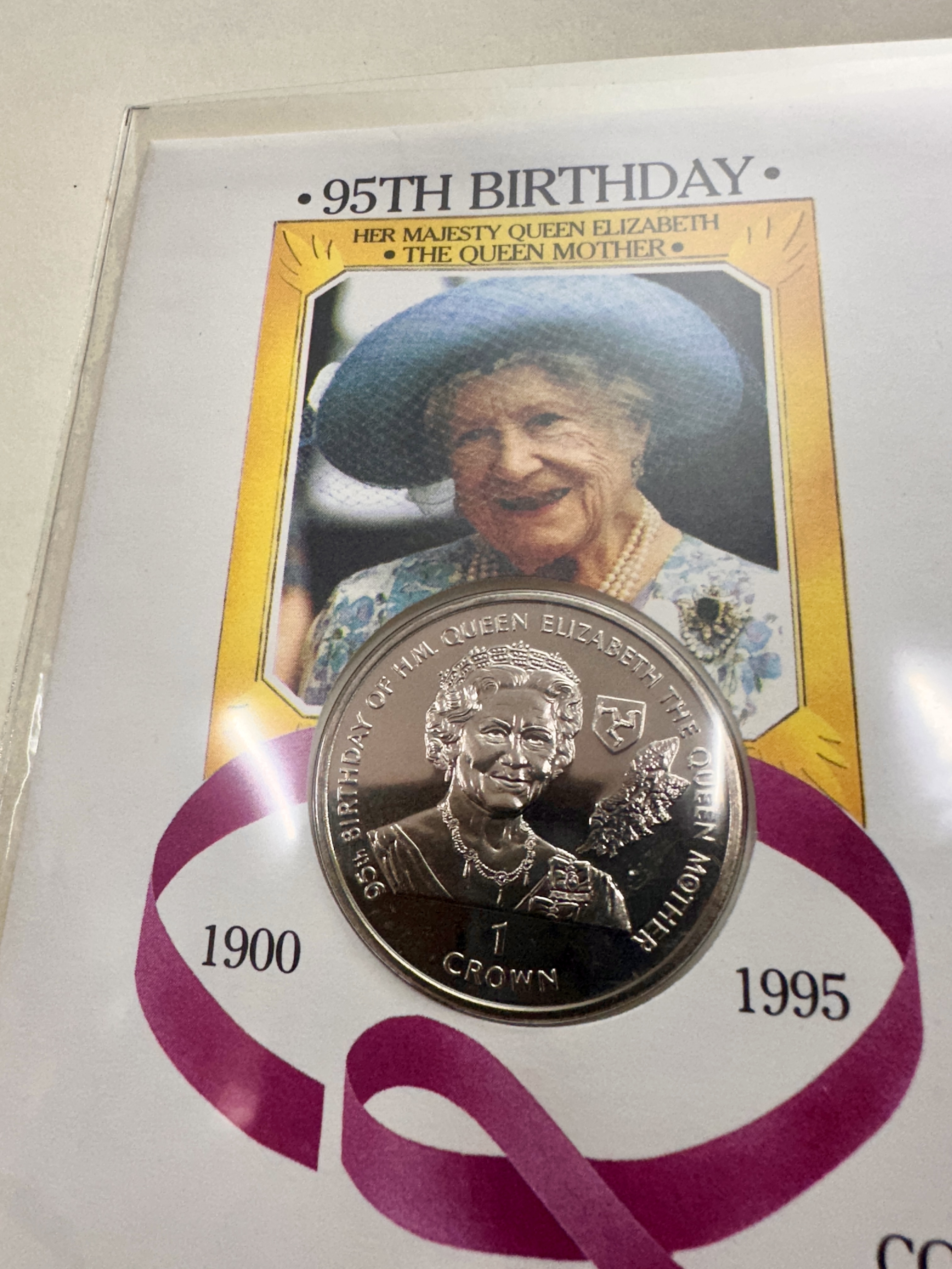 A pair of commemorative coin first day covers produced by Mercury. The first cover, titled Britain in Bloom, contains a 1997 Isle of Man cupro-nickel one crown coin. The reverse shows a bouquet of roses and the inscription 1 CROWN. The cover features Royal Mail Floral Greetings stamps with a Kew Gardens postmark dated 1997. This item is from a limited edition of 3,000, numbered 1421. The second cover commemorates the 95th birthday of HM Queen Elizabeth the Queen Mother and contains a 1995 Isle of Man cupro-nickel one crown coin. The reverse features a portrait of the Queen Mother, a triskelion shield, and a floral sprig, with the inscriptions 95th BIRTHDAY OF H.M. QUEEN ELIZABETH THE QUEEN MOTHER, 1900, 1995, and 1 CROWN. This cover is from a limited edition of 10,000, numbered 05043. Both coins display a proof-like lustre.